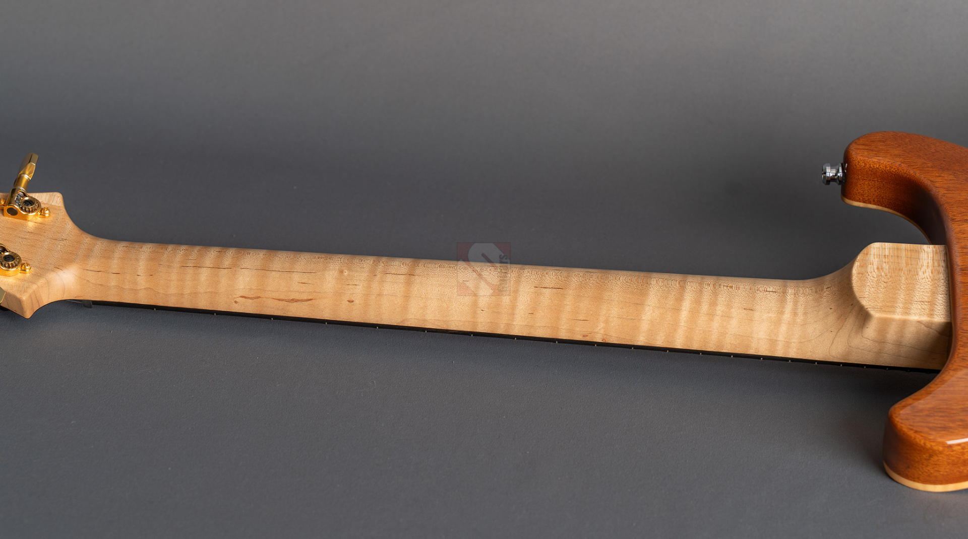 Manchmal öffnet man einen Gitarrenkoffer und ist einfach nur fasziniert vom Anblick, der einem dabei offenbart wird. Das war auch bei der dieser PRS Santana der Fall! Hierbei handelt es sich um ein Exemplar, das mit exklusiven Hölzern aus der hauseigenen "Wood Library" ausgestattet ist. Dass dabei auch noch ein 10-Top herauskam, womit nur Gitarren mit am schönsten gemaserten Deckenhölzern bezeichnet werden, ist sicherlich nicht verwunderlich. Attraktiver Mahagoni-Korpus mit einem mittelbraunen Finish, das erlaubt, die Struktur der Holzmaserung zu erkennen, die charakteristischen Santana-spezifischen "Solid Green Ripple Abalone"-Inlays, goldfarbene Hardware sowie ein haptisch perfektes, tiefdunkles Ebenholzgriffbrett mit den legendären Bird-Inlays und dem angenehmen, medium Santana-Profil. Der Ahornhals verleiht der Gitarre schon trocken eine Extraportion Knackigkeit und Perkussivität. Das hört man auch am Amp. Die beiden Santana-Pickups liefern schmatzigen Humbucker-Sound, allerdings mit viel oberen Mitten und jeder Menge Obertönen, sodass hier keinerlei Mulm entsteht. Stattdessen hat man es mit einer spritzigen, direkten und lebhaften Gitarre zu tun, die von perligen Cleansounds bis zu schreienden Soli alles in Top-Form abdeckt. Mittig, durchetzungsstark und trotzdem transparent! Zusammen mit den typischen PRS-Features wie verstimmungsfreiem Tremolo und Locking-Mechaniken bekommt man hier also eine Beauty-Queen mit bestem Praxiswert. Um dieses Prachtstück zu optimieren, hat der Vorbesitzer verschiedene Upgrades vorgenommen. So ließ er professionell Push/Pull-Potis verbauen, mittels derer man nun auch in den Genuss schönster Singlecoil-Sounds kommt. Weiterhin addierte er charmante Pickup-Rahmen aus hellem Holz sowie praxistaugliche Strap-Locks (Originalteile beiliegend). Diese Gitarre, die wir Euch bis auf minimalste Gebrauchsspuren in Top-Zustand anbieten können, ist definitiv nicht nur ein Instrument zum Anschauen, sondern dieses Top-Instrument muss gespielt werden!