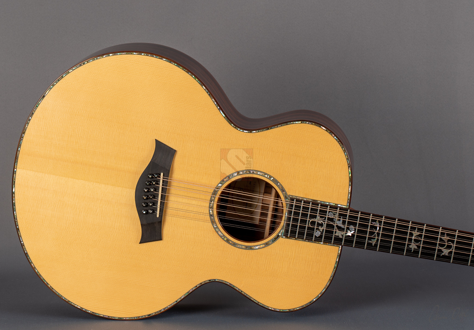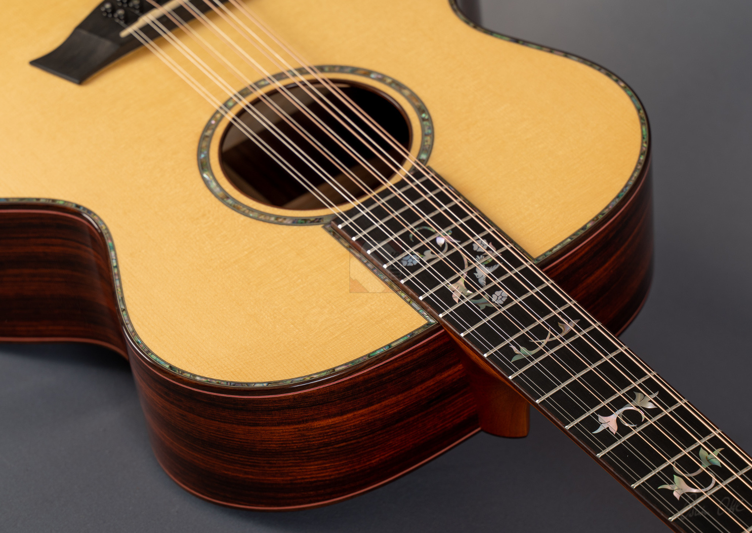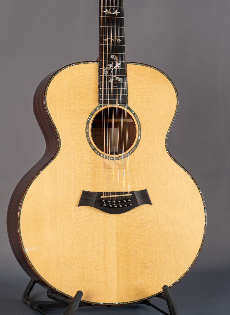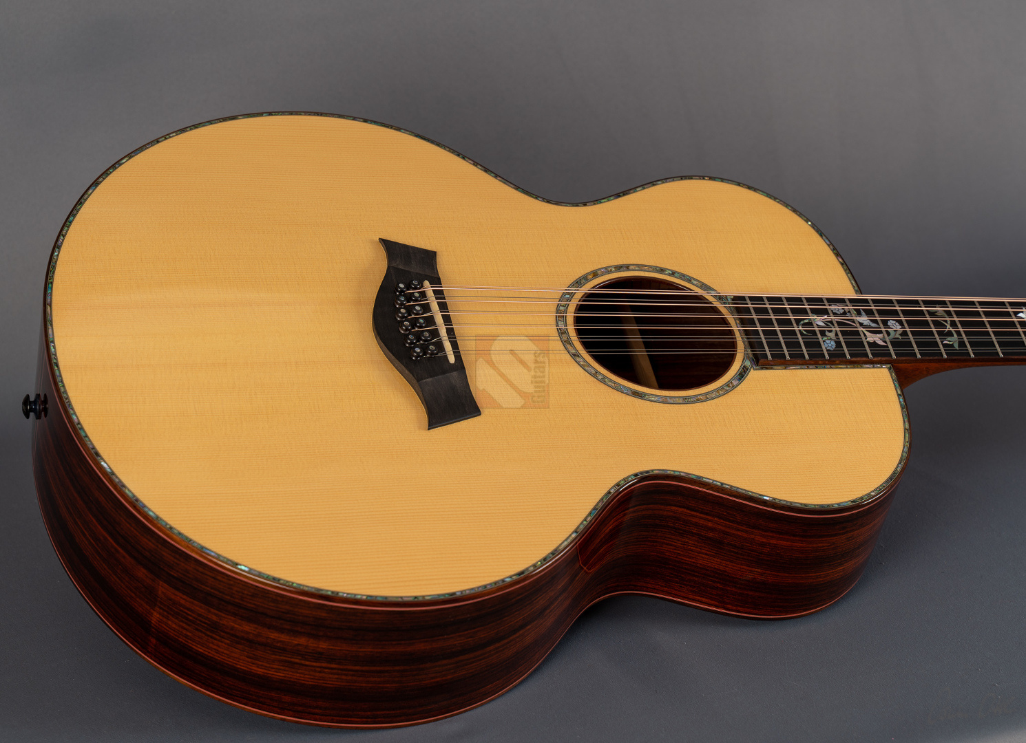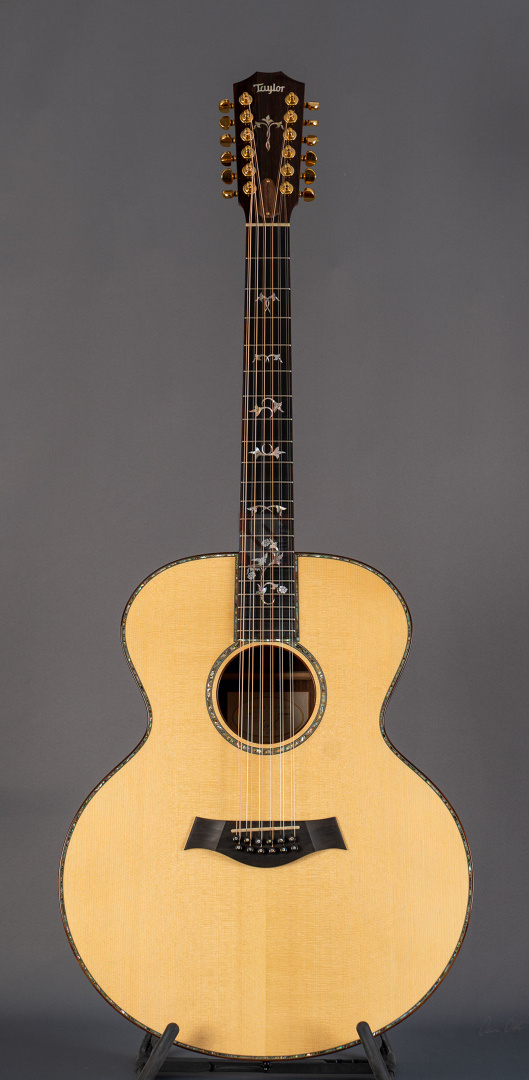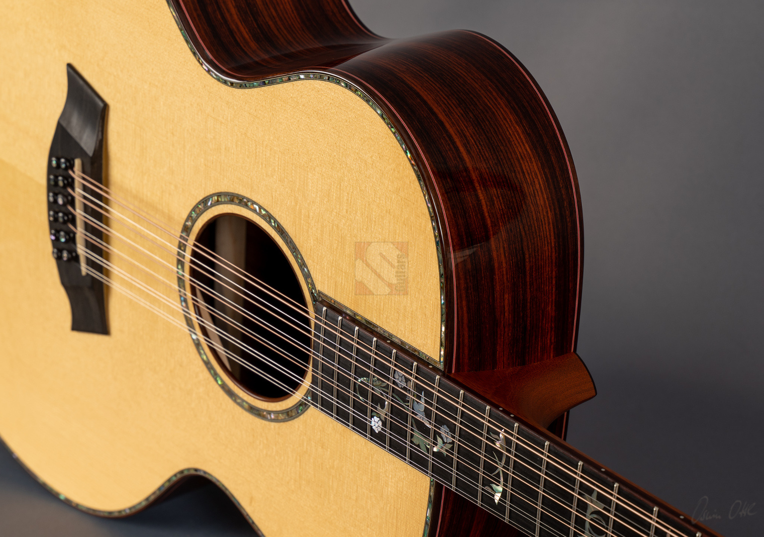 Nichts klingt so üppig wie eine 12-saitige Gitarre und mit einem einzigen Abschlag stellt man hier fest, dass es sich um ein Instrument handelt, das man nicht mehr aus der Hand legen will. Diese Taylor 955 12-String, die von 1992 bis 2003 produziert wurde, verfügt über einen Jumbo-Korpus, eine massive Sitka-Fichtendecke, Boden und Zargen aus indischem Palisander, einen Mahagoni-Neck sowie über Bridge und Griffbrett aus tiefdunklem Ebenholz. Letzteres wird verziert – ebenso wie Binding und Rosette – durch wunderschöne Abalone-Inlays. Ein Look zum Verlieben! Schon aufgrund der robusten Bauweise hält die 955 einiges an Volumen bereit. Dadurch kann sich der Ton angemessen entfalten, erscheint stark in den Mitten und im Bass und die Höhen sprechen äußerst schnell an. Klassischer, voller Klang mit satten, aber keinesfalls überbetonten Bässen in den tiefen Lagen, der immer seine brillante Klarheit behält. Dieser Effekt wird durch die Verdoppelung der Saitenanzahl nur noch verstärkt, sodass die Akustik auch ohne Verstärkung in all ihren klanglichen Nuancen weithin zu hören ist. Selten haben wir eine 12-String gehört, die den Raum dermaßen füllen konnte mit solch wunderbar schimmernden Obertönen. Ihr Hals spielt sich mit seinem angenehmen, medium V-Profil so komfortabel, dass man das Gefühl hat, es sei eine E-Gitarre. So freuen wir uns, dass wir Euch hier die perfekte Symbiose aus edelstem Look, bester Klangentfaltung und perfekten Playereigenschaften in so gut wie neuwertigem Zustand anbieten dürfen.