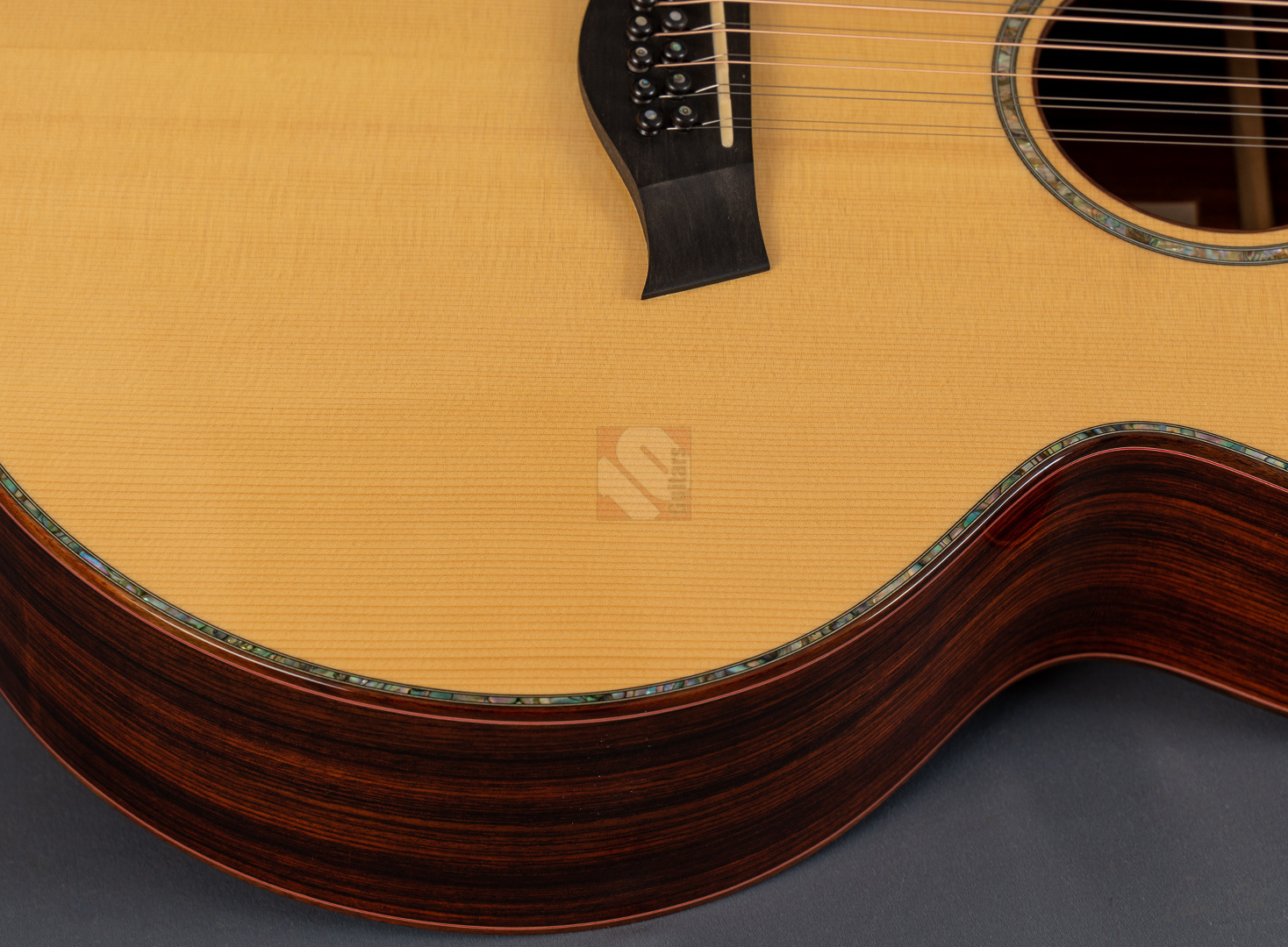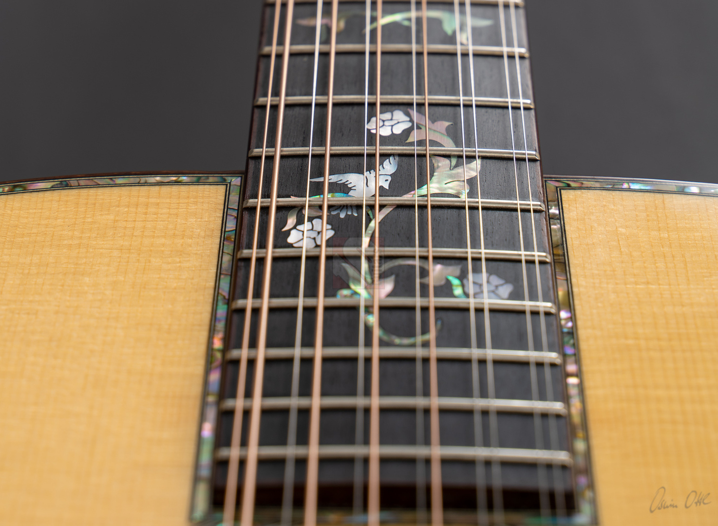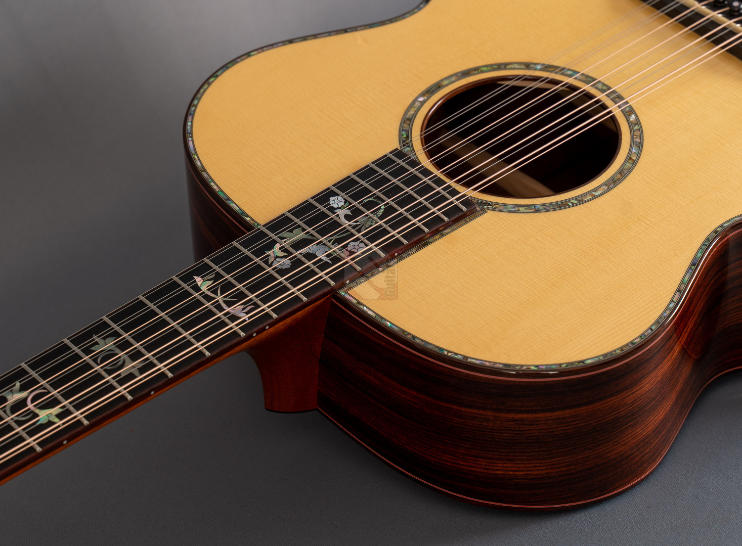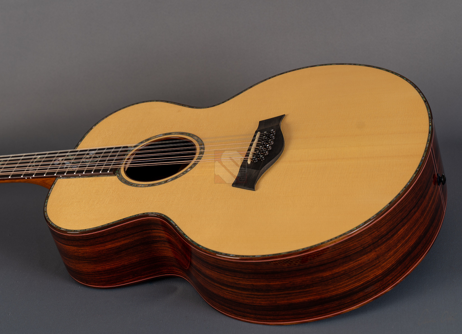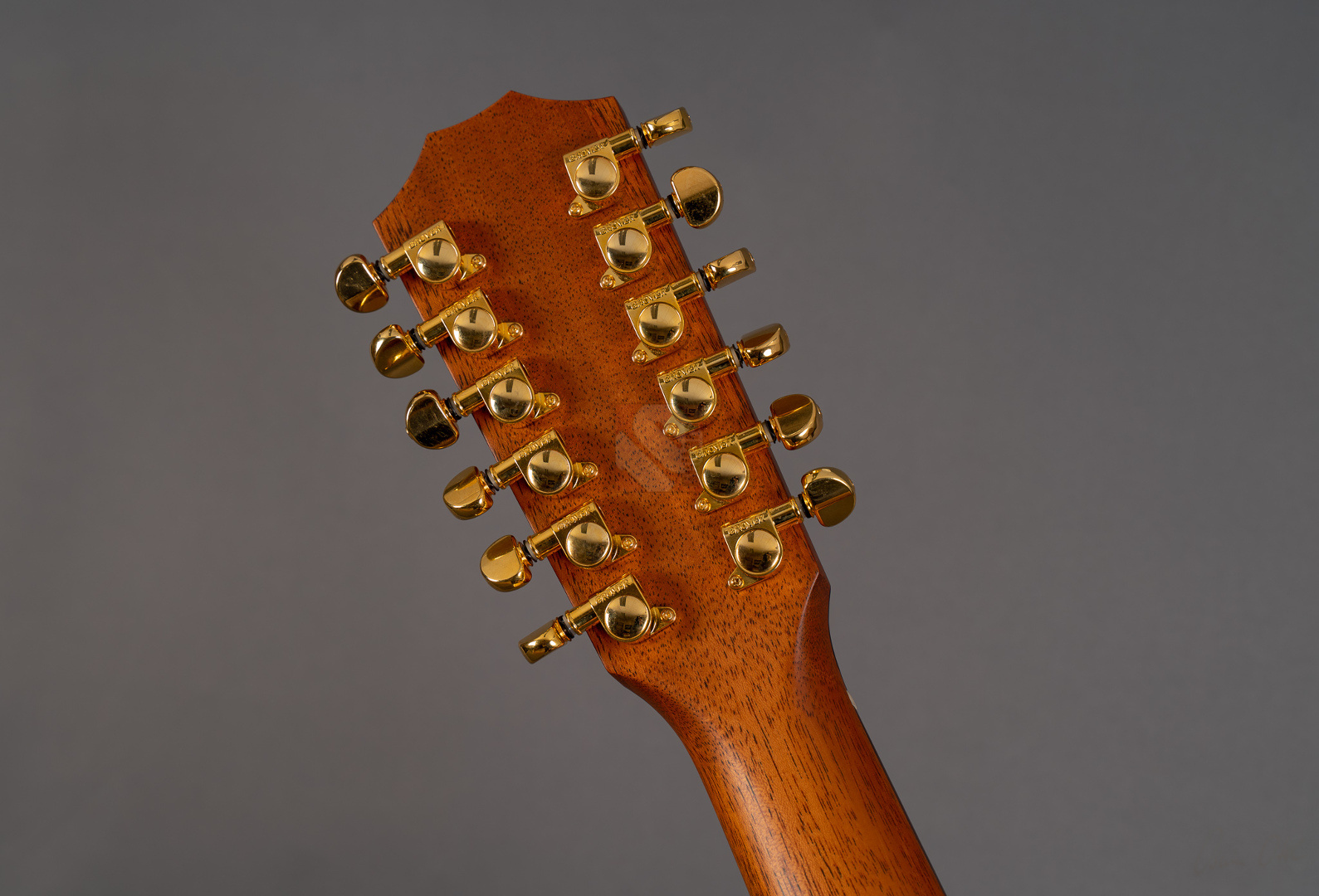 Nichts klingt so üppig wie eine 12-saitige Gitarre und mit einem einzigen Abschlag stellt man hier fest, dass es sich um ein Instrument handelt, das man nicht mehr aus der Hand legen will. Diese Taylor 955 12-String, die von 1992 bis 2003 produziert wurde, verfügt über einen Jumbo-Korpus, eine massive Sitka-Fichtendecke, Boden und Zargen aus indischem Palisander, einen Mahagoni-Neck sowie über Bridge und Griffbrett aus tiefdunklem Ebenholz. Letzteres wird verziert – ebenso wie Binding und Rosette – durch wunderschöne Abalone-Inlays. Ein Look zum Verlieben! Schon aufgrund der robusten Bauweise hält die 955 einiges an Volumen bereit. Dadurch kann sich der Ton angemessen entfalten, erscheint stark in den Mitten und im Bass und die Höhen sprechen äußerst schnell an. Klassischer, voller Klang mit satten, aber keinesfalls überbetonten Bässen in den tiefen Lagen, der immer seine brillante Klarheit behält. Dieser Effekt wird durch die Verdoppelung der Saitenanzahl nur noch verstärkt, sodass die Akustik auch ohne Verstärkung in all ihren klanglichen Nuancen weithin zu hören ist. Selten haben wir eine 12-String gehört, die den Raum dermaßen füllen konnte mit solch wunderbar schimmernden Obertönen. Ihr Hals spielt sich mit seinem angenehmen, medium V-Profil so komfortabel, dass man das Gefühl hat, es sei eine E-Gitarre. So freuen wir uns, dass wir Euch hier die perfekte Symbiose aus edelstem Look, bester Klangentfaltung und perfekten Playereigenschaften in so gut wie neuwertigem Zustand anbieten dürfen.