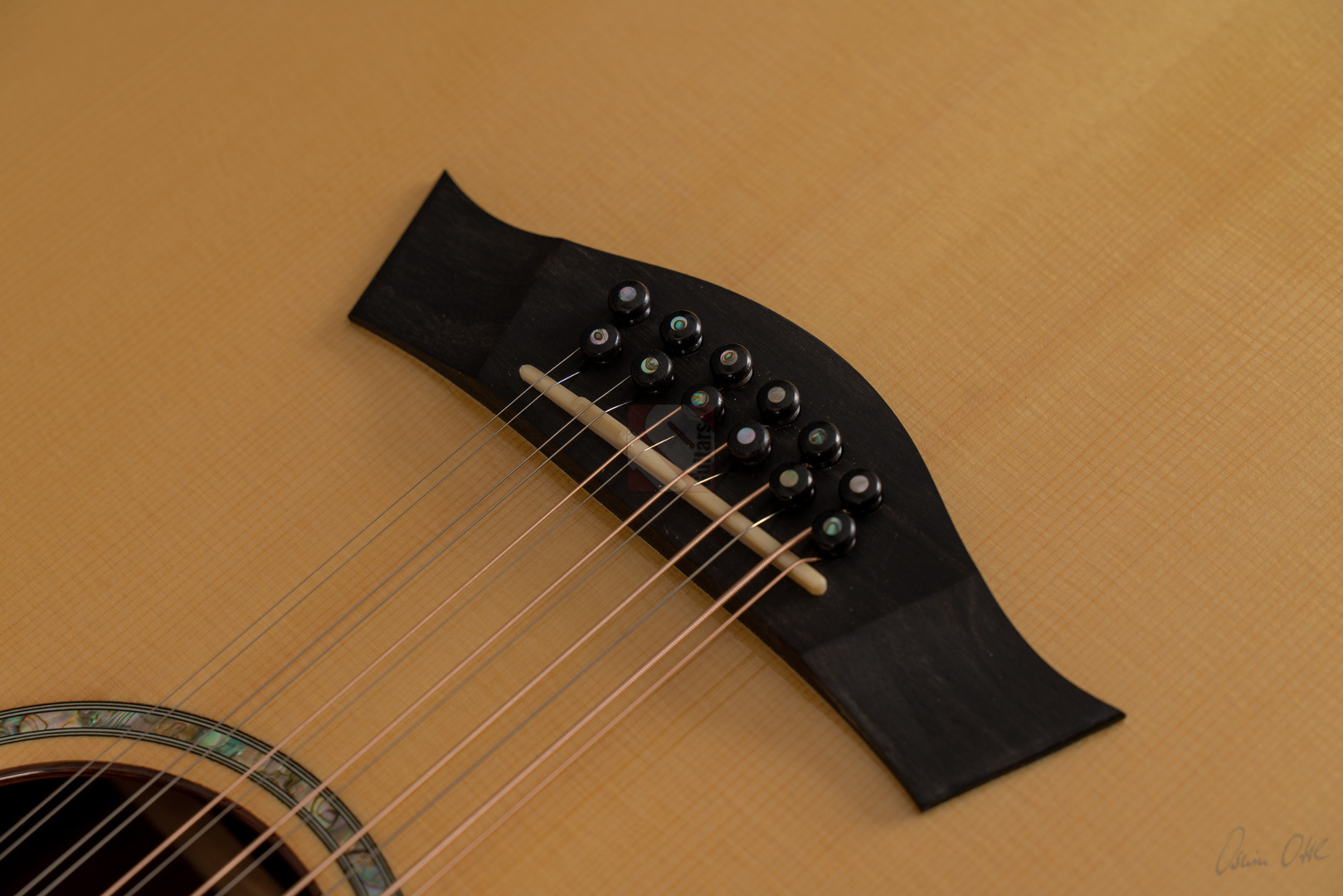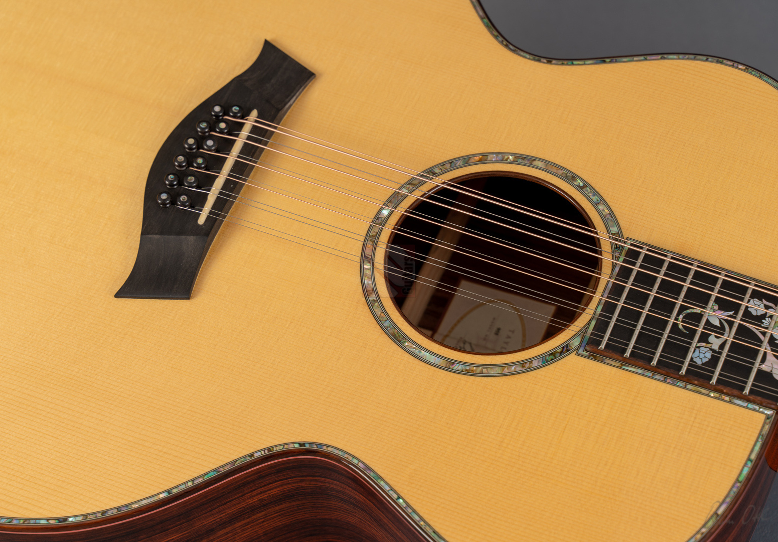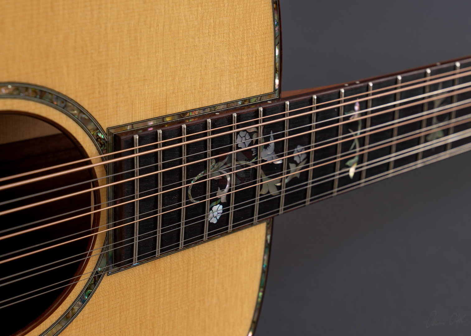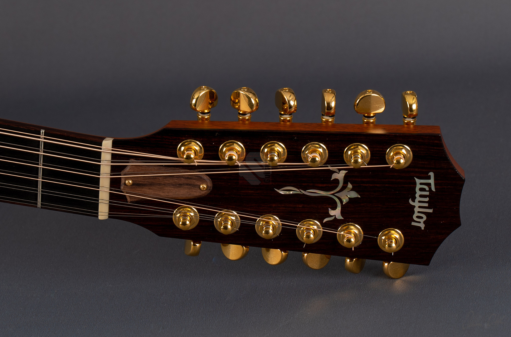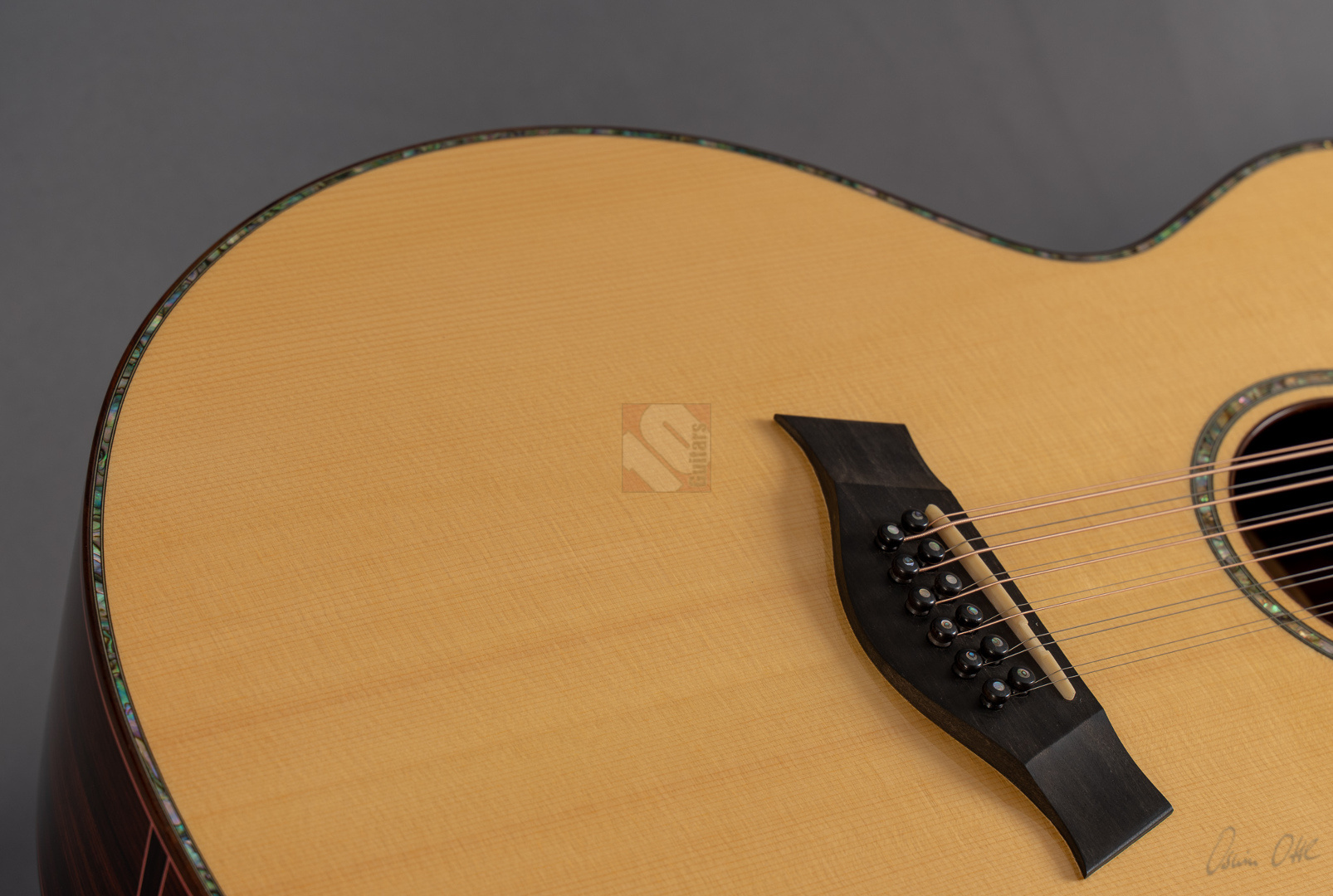 Nichts klingt so üppig wie eine 12-saitige Gitarre und mit einem einzigen Abschlag stellt man hier fest, dass es sich um ein Instrument handelt, das man nicht mehr aus der Hand legen will. Diese Taylor 955 12-String, die von 1992 bis 2003 produziert wurde, verfügt über einen Jumbo-Korpus, eine massive Sitka-Fichtendecke, Boden und Zargen aus indischem Palisander, einen Mahagoni-Neck sowie über Bridge und Griffbrett aus tiefdunklem Ebenholz. Letzteres wird verziert – ebenso wie Binding und Rosette – durch wunderschöne Abalone-Inlays. Ein Look zum Verlieben! Schon aufgrund der robusten Bauweise hält die 955 einiges an Volumen bereit. Dadurch kann sich der Ton angemessen entfalten, erscheint stark in den Mitten und im Bass und die Höhen sprechen äußerst schnell an. Klassischer, voller Klang mit satten, aber keinesfalls überbetonten Bässen in den tiefen Lagen, der immer seine brillante Klarheit behält. Dieser Effekt wird durch die Verdoppelung der Saitenanzahl nur noch verstärkt, sodass die Akustik auch ohne Verstärkung in all ihren klanglichen Nuancen weithin zu hören ist. Selten haben wir eine 12-String gehört, die den Raum dermaßen füllen konnte mit solch wunderbar schimmernden Obertönen. Ihr Hals spielt sich mit seinem angenehmen, medium V-Profil so komfortabel, dass man das Gefühl hat, es sei eine E-Gitarre. So freuen wir uns, dass wir Euch hier die perfekte Symbiose aus edelstem Look, bester Klangentfaltung und perfekten Playereigenschaften in so gut wie neuwertigem Zustand anbieten dürfen.