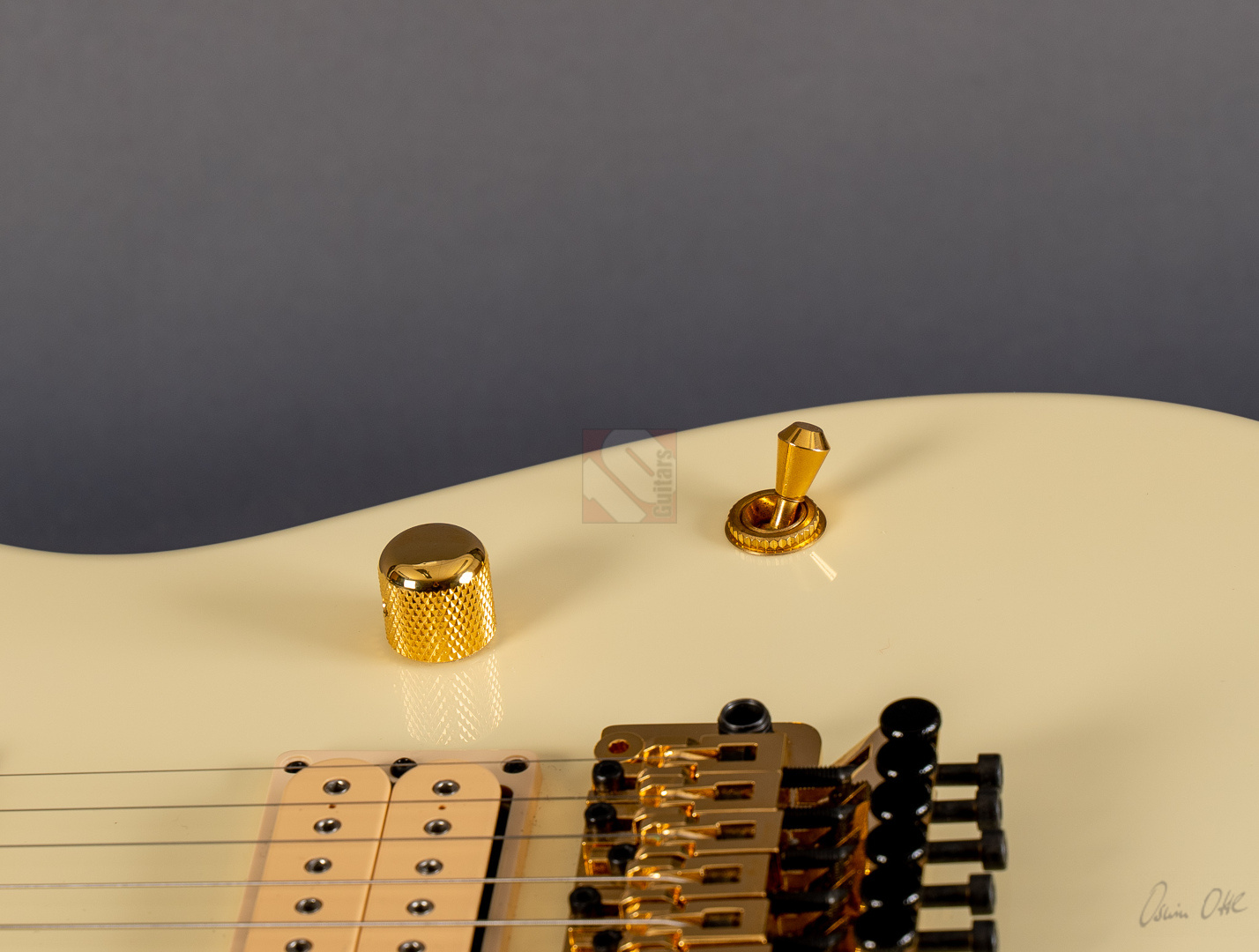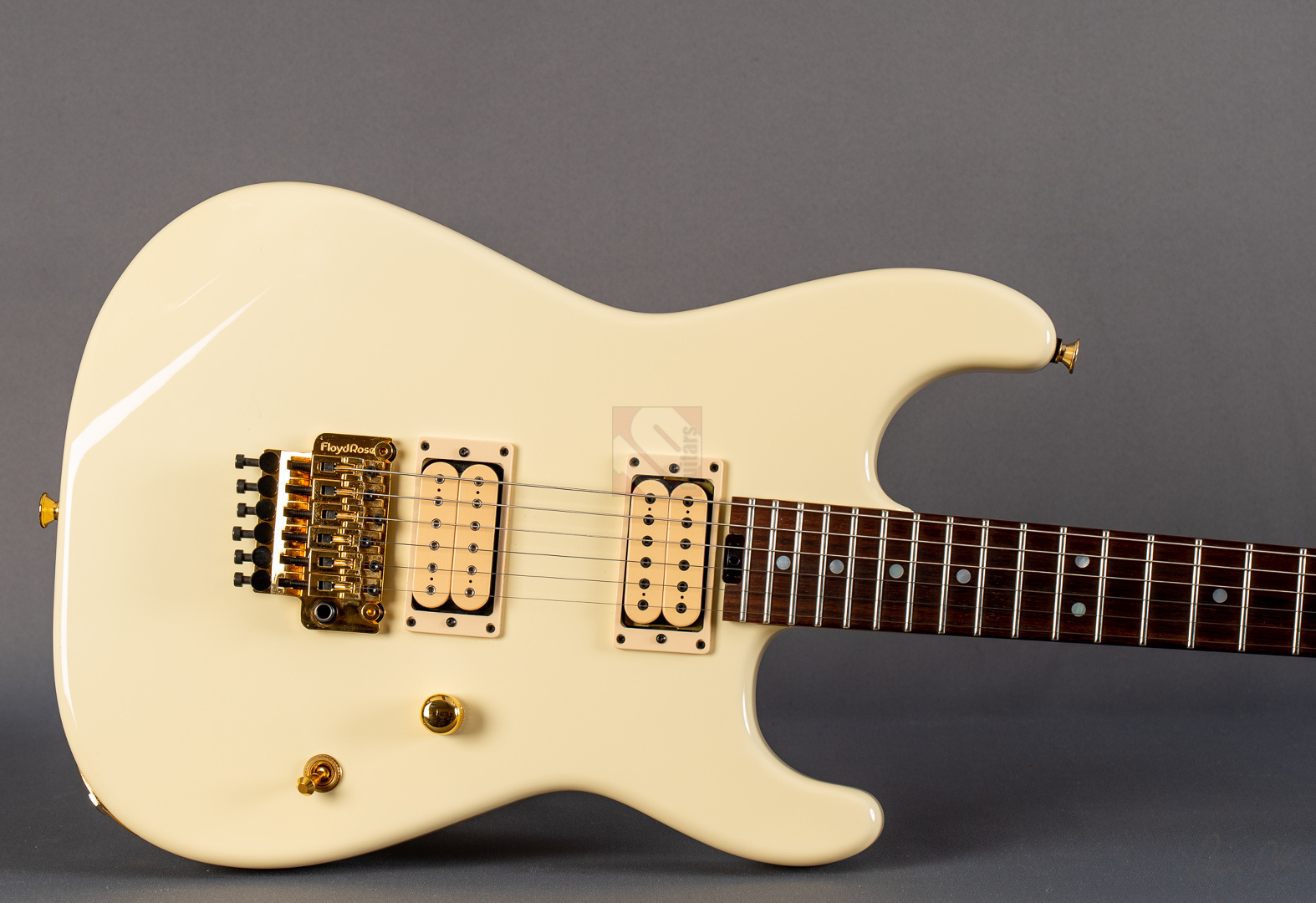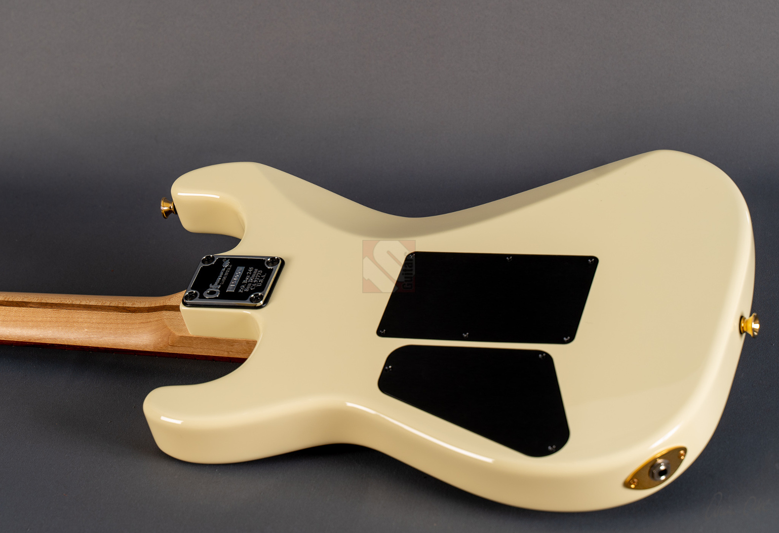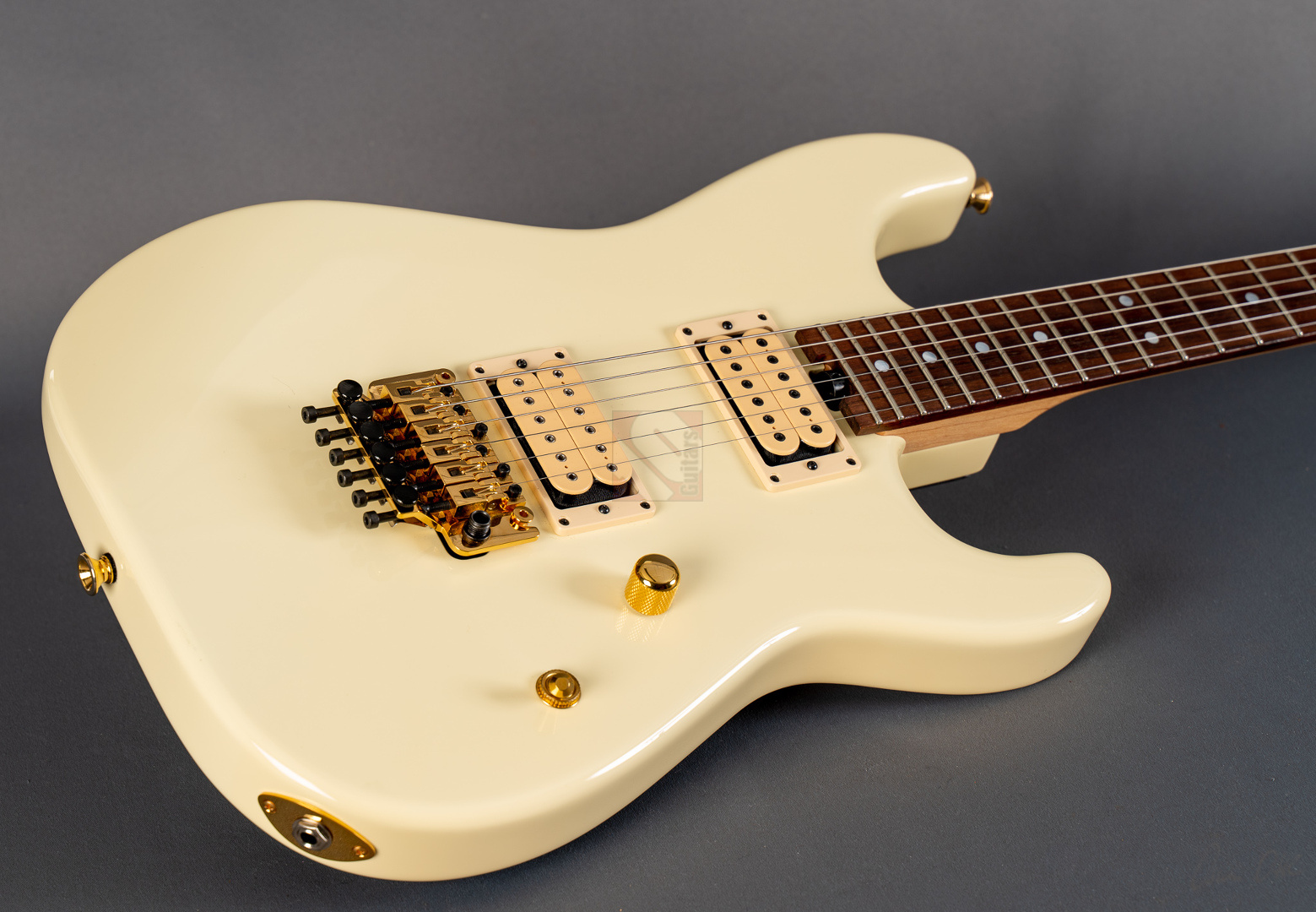 Here we have the Charvel USA San Dimas Custom Shop in a beautiful “Vanilla Shake” finish. Charvel stands for guitars that are designed for speed, comfort and playability, and this gem is a real player, a real hot rod! It features an alder body, an attractive rosewood fingerboard with pearl dot inlays and elegant gold-colored hardware. The speedy neck is a one-piece quartersawn maple neck with a 12-16" compound radius and 22 Jumbo frets. One of the things that sets Charvels apart is the compound radius of the fingerboards, which are more curved at the lower frets and become flatter towards the upper end. This makes chords easier to play at the lower frets, while fast leads and bends at the higher frets almost play themselves. In addition, the gold-colored hardware and the smooth, detune-free Floyd Rose, which is always ready for the nastiest dive bombs, are truly captivating. A DiMarzio “DP-155 Tone Zone” was installed in the bridge position and a DiMarzio “DP-158/9 Evolution” in the neck position. The result: punch and sonority at their best! The sun is rising in the Metal sky on this amp! A fat board with plenty of harmonics and mids that will give any blow-dry hairstyle a new shine. Modern, progressive and above all harder sounds with extreme clarity, power and speed. The neck and bridge pickups are calibrated in terms of performance and sound quality so that they work together optimally and also produce distinctive individual voices. High output, wiry and biting, ...this definitely leaves nothing to be desired! We are delighted to be able to offer you this magnificent sound monster including the frets in mint condition.
