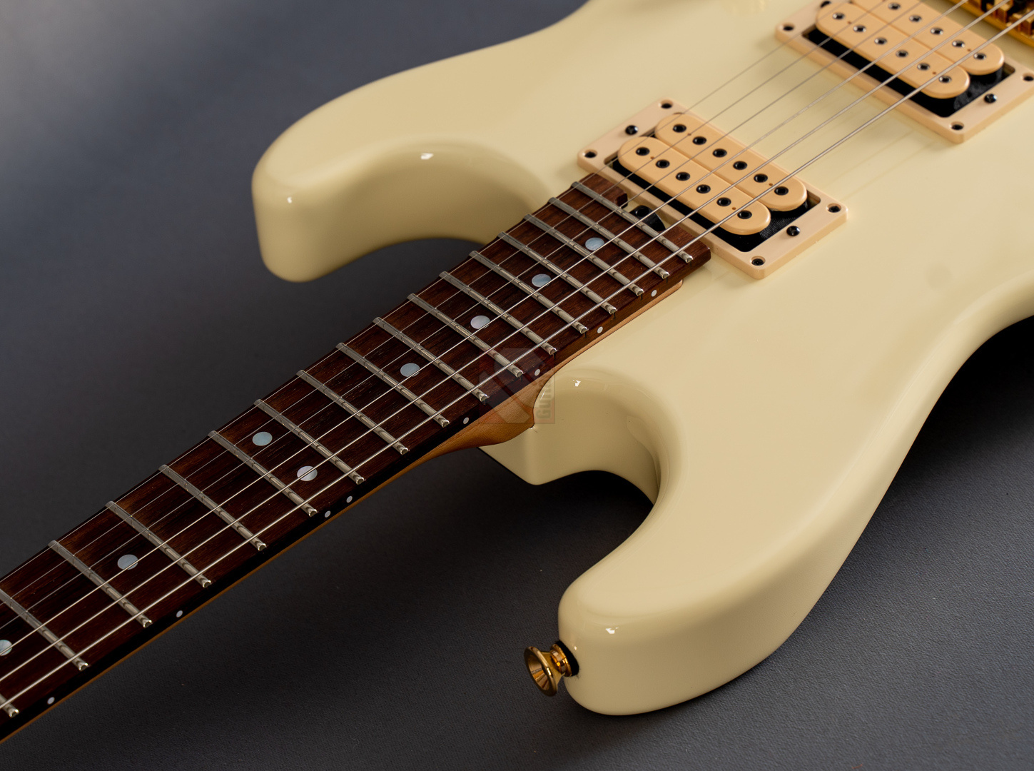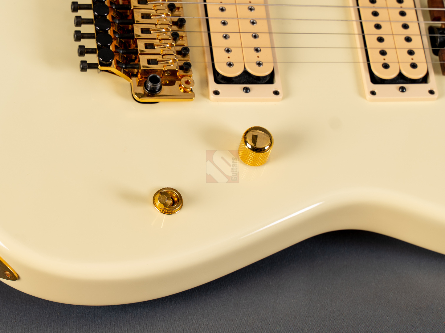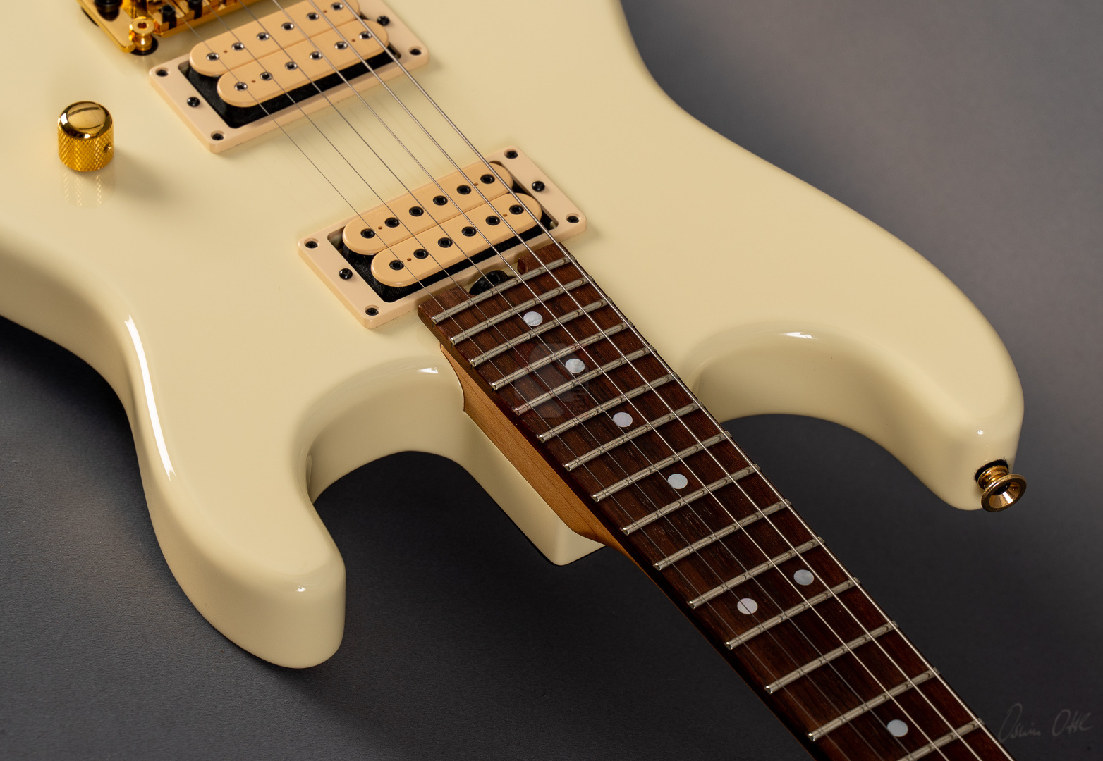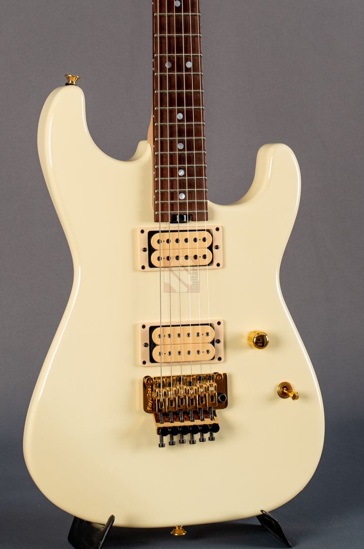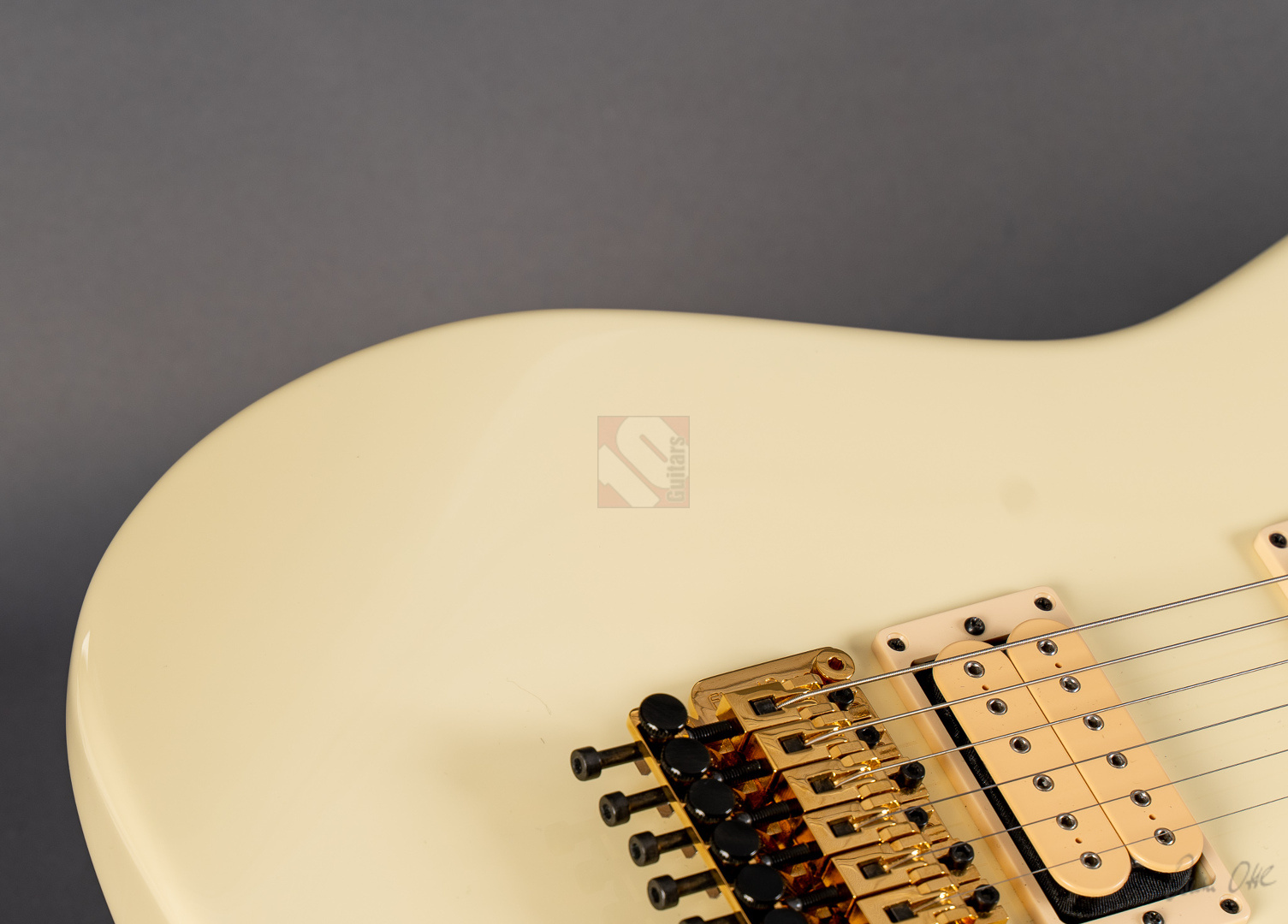 Here we have the Charvel USA San Dimas Custom Shop in a beautiful “Vanilla Shake” finish. Charvel stands for guitars that are designed for speed, comfort and playability, and this gem is a real player, a real hot rod! It features an alder body, an attractive rosewood fingerboard with pearl dot inlays and elegant gold-colored hardware. The speedy neck is a one-piece quartersawn maple neck with a 12-16" compound radius and 22 Jumbo frets. One of the things that sets Charvels apart is the compound radius of the fingerboards, which are more curved at the lower frets and become flatter towards the upper end. This makes chords easier to play at the lower frets, while fast leads and bends at the higher frets almost play themselves. In addition, the gold-colored hardware and the smooth, detune-free Floyd Rose, which is always ready for the nastiest dive bombs, are truly captivating. A DiMarzio “DP-155 Tone Zone” was installed in the bridge position and a DiMarzio “DP-158/9 Evolution” in the neck position. The result: punch and sonority at their best! The sun is rising in the Metal sky on this amp! A fat board with plenty of harmonics and mids that will give any blow-dry hairstyle a new shine. Modern, progressive and above all harder sounds with extreme clarity, power and speed. The neck and bridge pickups are calibrated in terms of performance and sound quality so that they work together optimally and also produce distinctive individual voices. High output, wiry and biting, ...this definitely leaves nothing to be desired! We are delighted to be able to offer you this magnificent sound monster including the frets in mint condition.