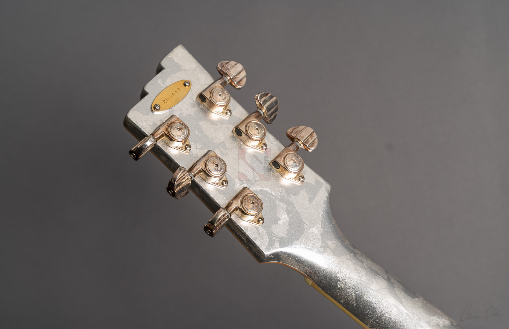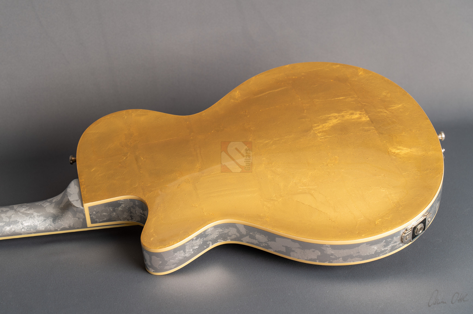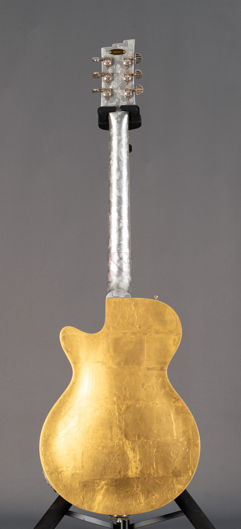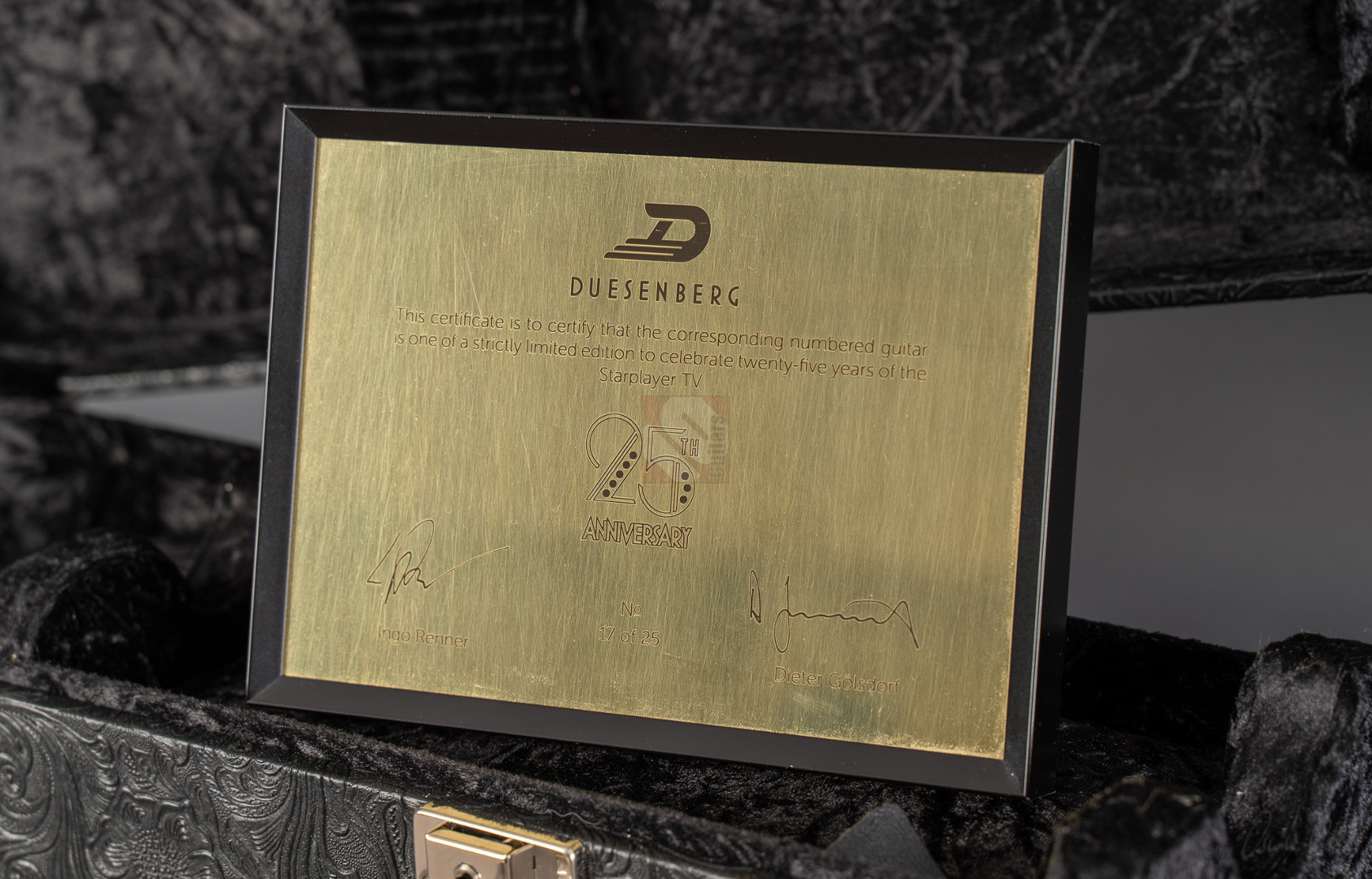 25 years of Duesenberg! It all began in 1995 in the basement of a residential building in the southern part of Hanover with the first Starplayer, which was still handmade by Dieter Gölsdorf at the time. In the years that followed the Starplayer TV experienced a real boom and was used on stage and in the studio by renowned musicians such as Bob Dylan, Mike Campbell and Ronnie Wood. Truly a good reason for Dieter Gölsdorf and his team to celebrate this extremely successful quarter-century with a very special Starplayer. To mark the occasion in 2020 Duesenberg came up with something extraordinary: the 25th Anniversary Limited Edition Duesenberg Starplayer TV Gold Leaf with an incredibly elegant finish of 24-carat gold leaf. Boom! The semi-hollow guitar is made from a spruce top and laminated maple back and sides. The one-piece maple neck with an Indian rosewood fingerboard and a scale length of 25.5“ ensures excellent playability. The ”Diamond Deluxe" tremolo developed by Duesenberg works perfectly and the two pickups (Duesenberg Domino P-90 at the neck and Duesenberg Grand Vintage at the bridge) make the Starplayer a powerful tool thanks to their versatility. Mighty lead sounds and riffs in the bridge position, as well as airy chords and bluesy melodies on the neck! In the middle position a special wiring filters certain frequencies from the humbucker signal to brighten the tone and create a unique third sound. We are delighted to offer you this exclusive gem in top condition.