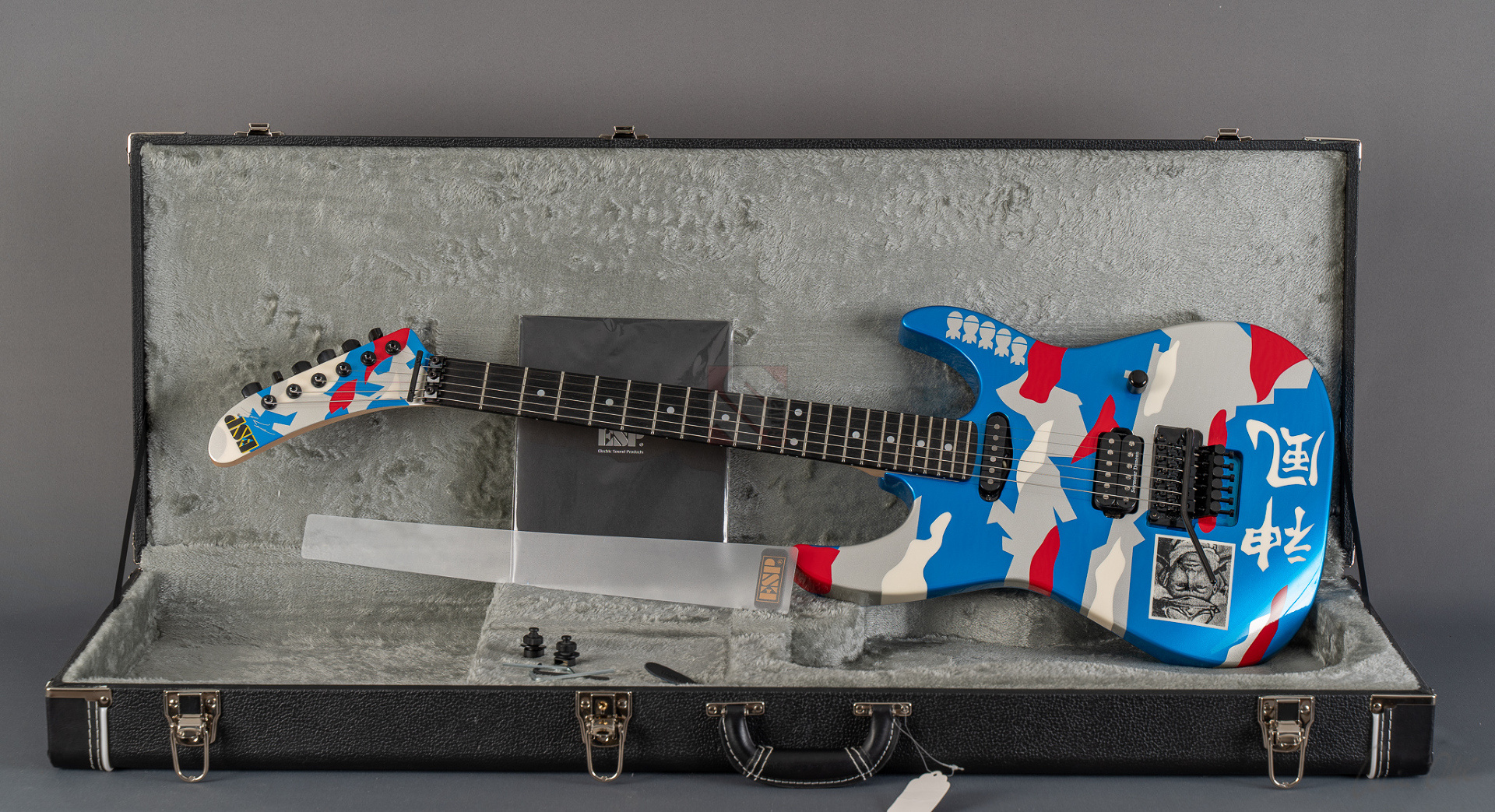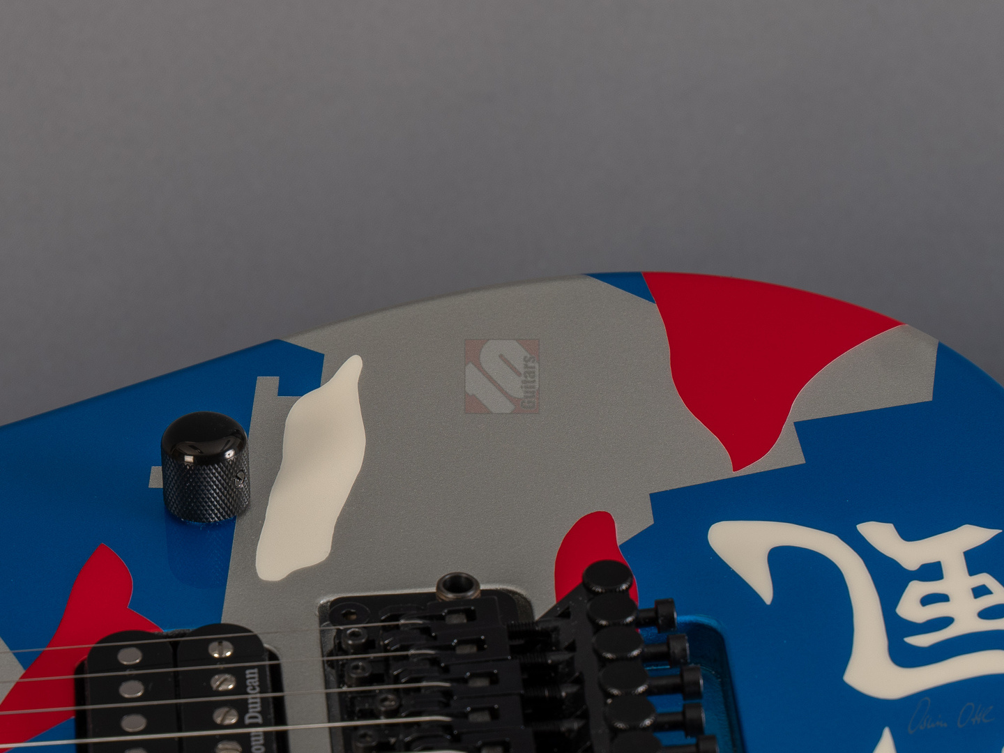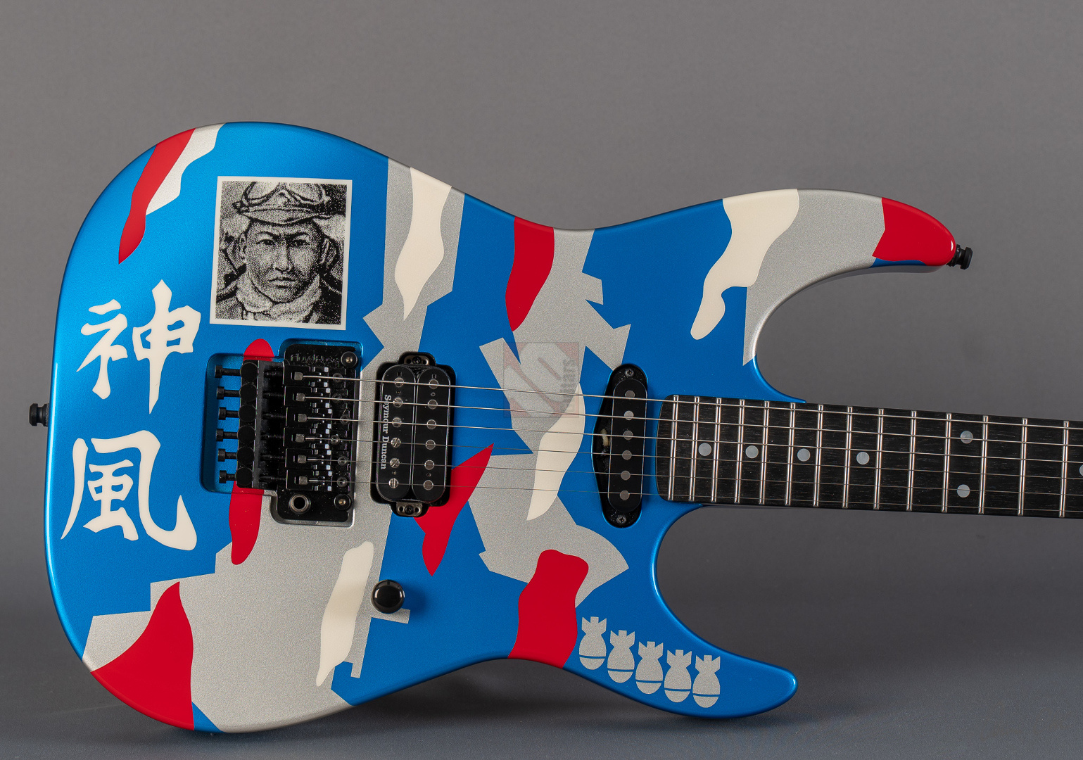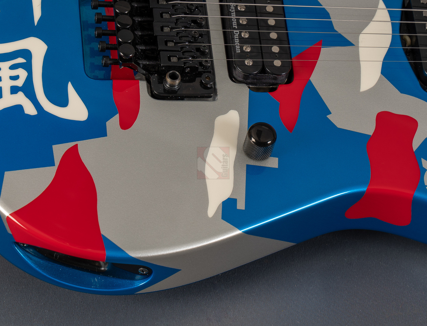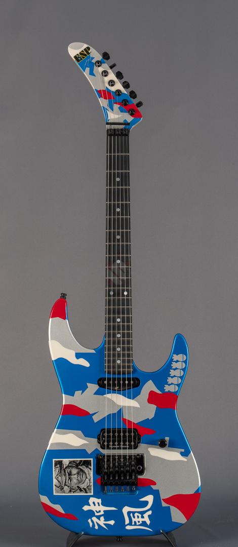 We're thrilled to offer you a guitar that's truly rare. Especially with the "Blue Camo" finish it's produced in such limited numbers that each one disappears almost immediately after hitting the market. The ESP George Lynch Kamikazes are synonymous with the Hair Metal era and the 80s/90s like few other guitars. Very few are made in "Blue Camo" and what makes this one so special is that it's in mint condition. An absolute must-have for any Hard Rock and Heavy Metal fan! It features a solid maple body and neck, an ebony fretboard with mother-of-pearl dot inlays, black Gotoh tuners (sealed diecast), a beautiful gloss finish with the characteristic Kamikaze motifs and, as expected, the kind of craftsmanship that only the Japanese ESP Custom Shop can provide. These guys work with such meticulous attention to detail and precision that it's a real pleasure to watch. But all Hair Metal fans will also get their money's worth in terms of sound and playability. A slim neck with the superb "GL Original U" profile and a 305 mm radius, 22 "Extra Jumbo" frets and a Floyd Rose tremolo system that never goes out of tune. You could even get your blonde highlights done while you're doing a dive bomb or a Metal riff. A fat, articulate sound with enough mids and highs to make your Marshall amp sizzle. Beautiful clean sounds at the neck position and the richest Metal riffs in the bridge position! It doesn't get any better than this! The whole package is thoughtfully complemented by a push/pull pot that allows you to adjust the volume and also serves as a pickup selector. This absolute highlight of Japanese guitar craftsmanship is not to be missed!