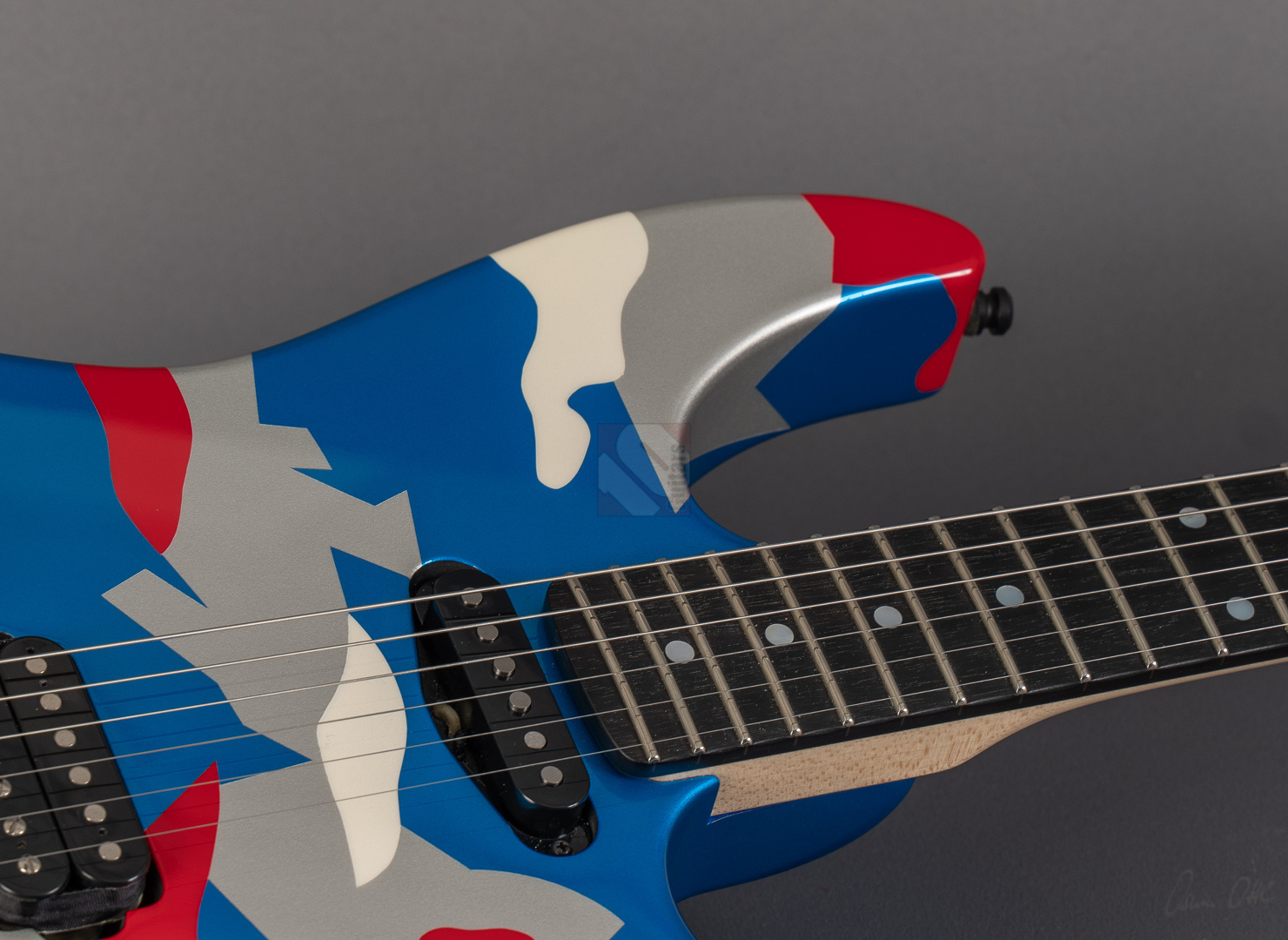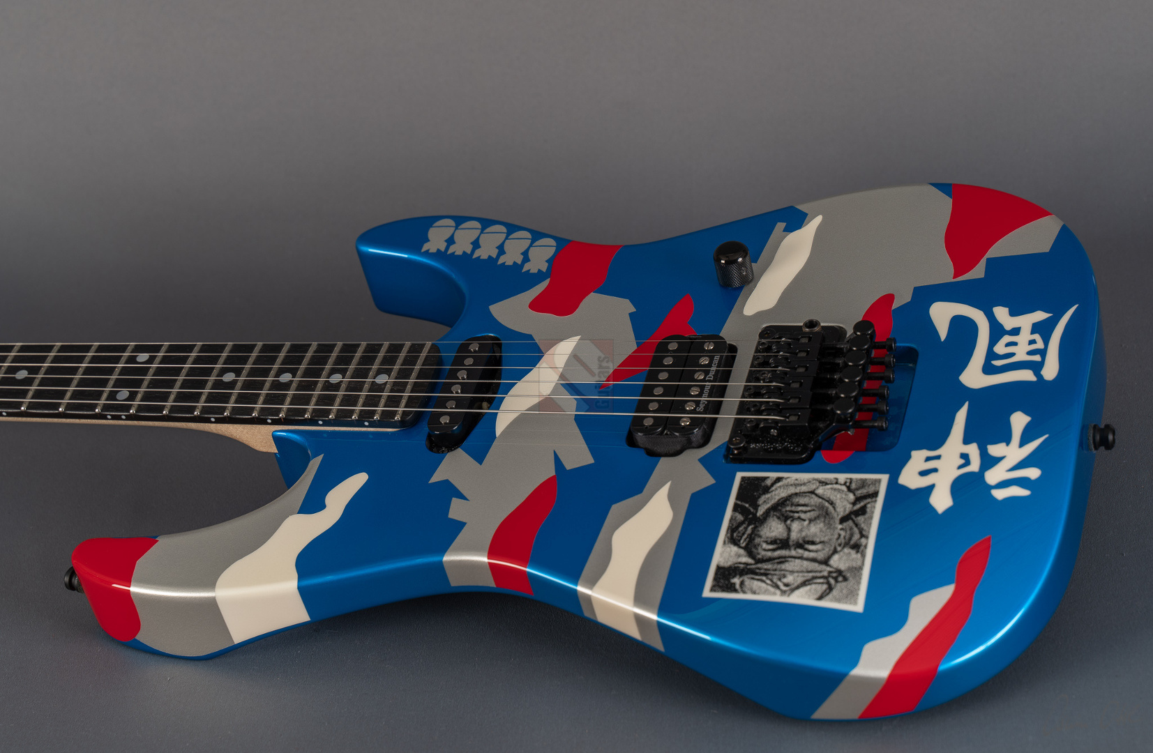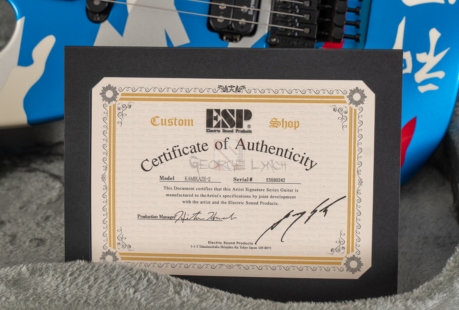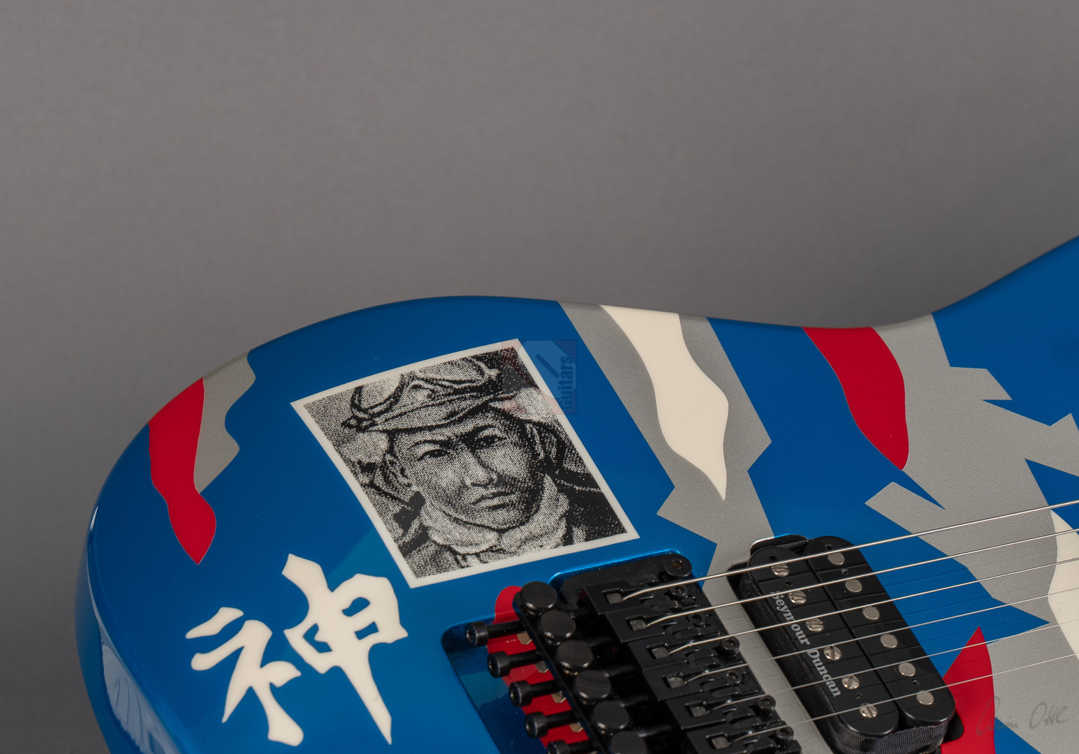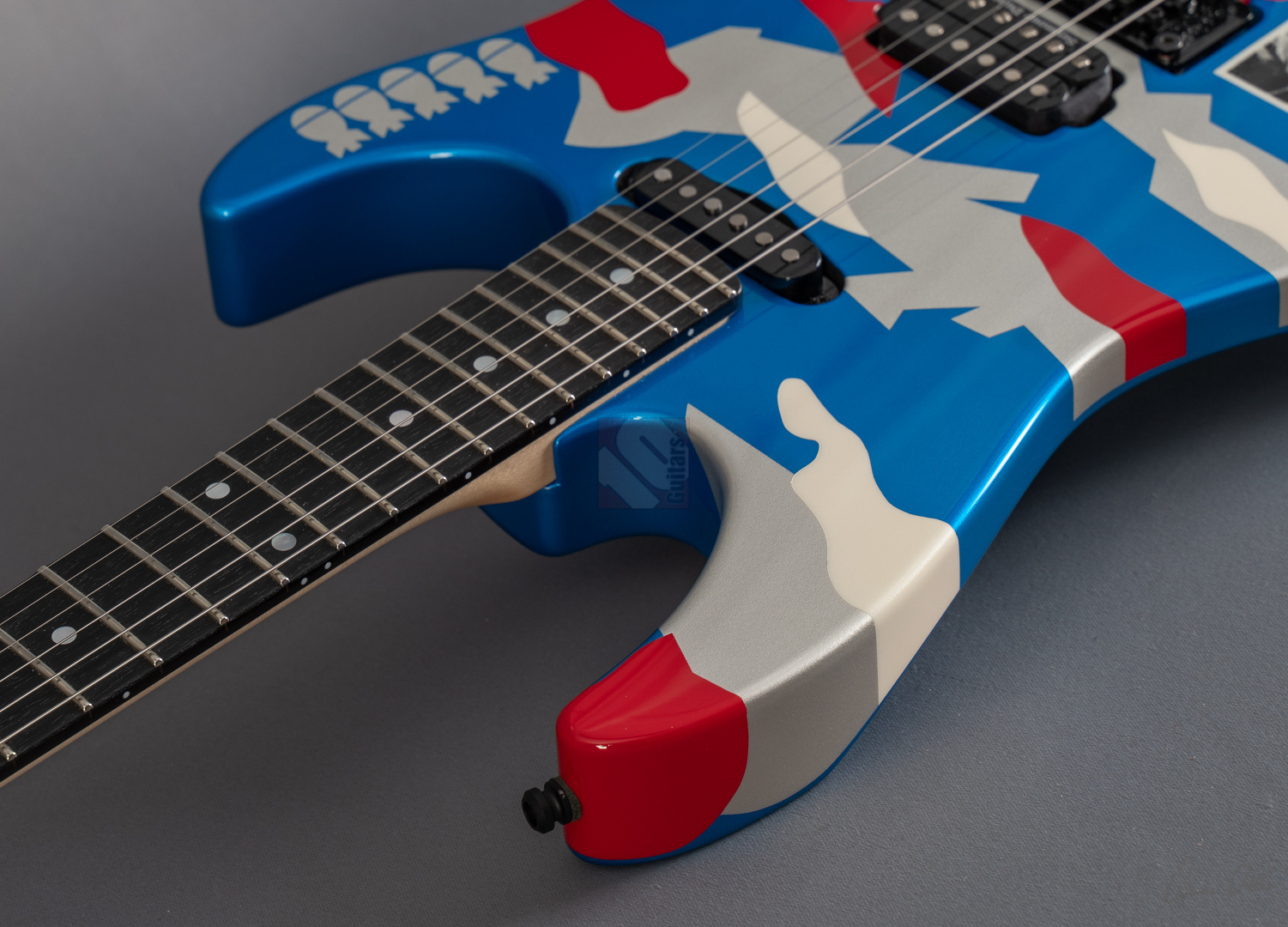 We're thrilled to offer you a guitar that's truly rare. Especially with the "Blue Camo" finish it's produced in such limited numbers that each one disappears almost immediately after hitting the market. The ESP George Lynch Kamikazes are synonymous with the Hair Metal era and the 80s/90s like few other guitars. Very few are made in "Blue Camo" and what makes this one so special is that it's in mint condition. An absolute must-have for any Hard Rock and Heavy Metal fan! It features a solid maple body and neck, an ebony fretboard with mother-of-pearl dot inlays, black Gotoh tuners (sealed diecast), a beautiful gloss finish with the characteristic Kamikaze motifs and, as expected, the kind of craftsmanship that only the Japanese ESP Custom Shop can provide. These guys work with such meticulous attention to detail and precision that it's a real pleasure to watch. But all Hair Metal fans will also get their money's worth in terms of sound and playability. A slim neck with the superb "GL Original U" profile and a 305 mm radius, 22 "Extra Jumbo" frets and a Floyd Rose tremolo system that never goes out of tune. You could even get your blonde highlights done while you're doing a dive bomb or a Metal riff. A fat, articulate sound with enough mids and highs to make your Marshall amp sizzle. Beautiful clean sounds at the neck position and the richest Metal riffs in the bridge position! It doesn't get any better than this! The whole package is thoughtfully complemented by a push/pull pot that allows you to adjust the volume and also serves as a pickup selector. This absolute highlight of Japanese guitar craftsmanship is not to be missed!