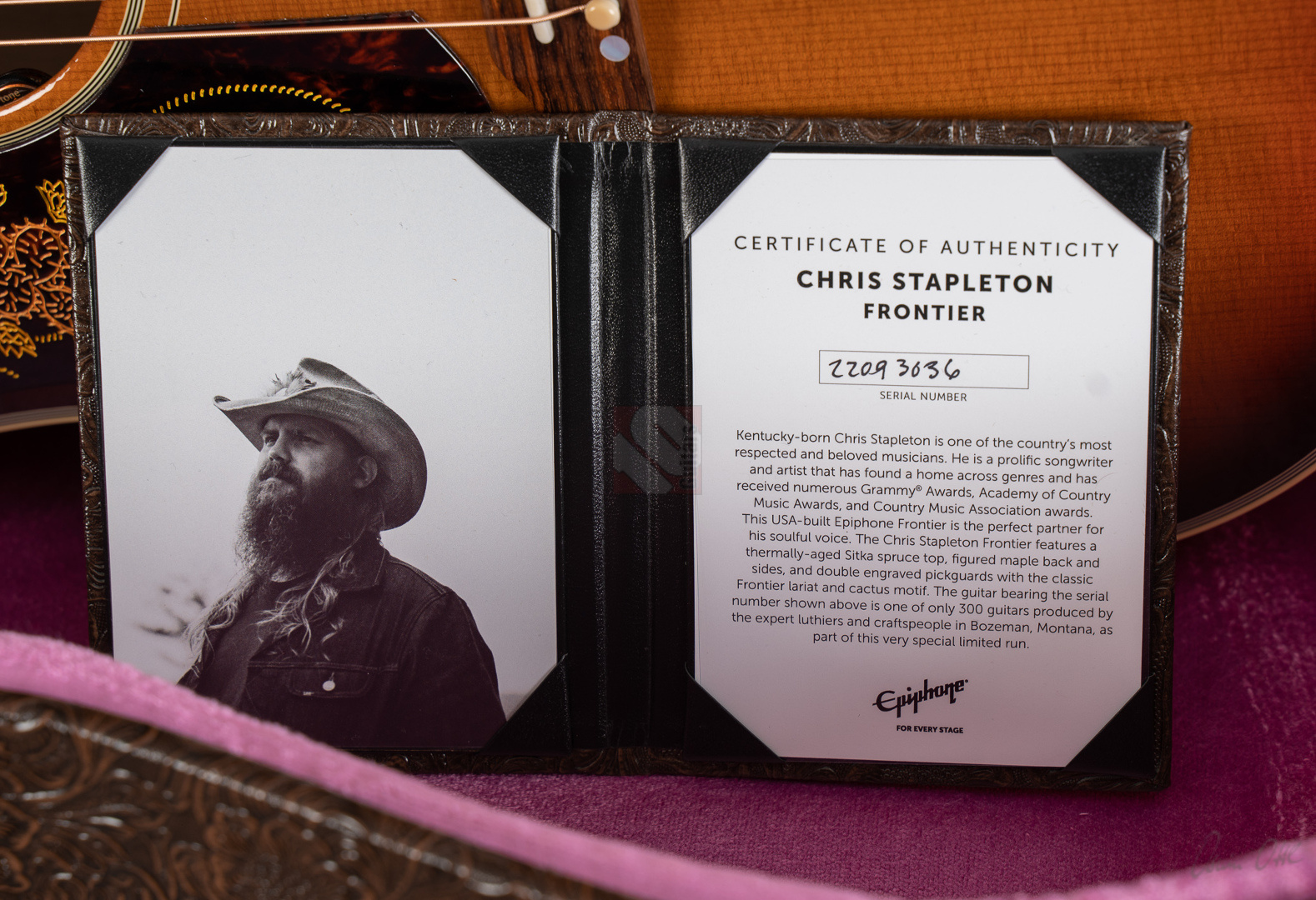 - Includes original case, certificate, hang tags, cleaning cloth, Chris Stapleton cloth, key ring