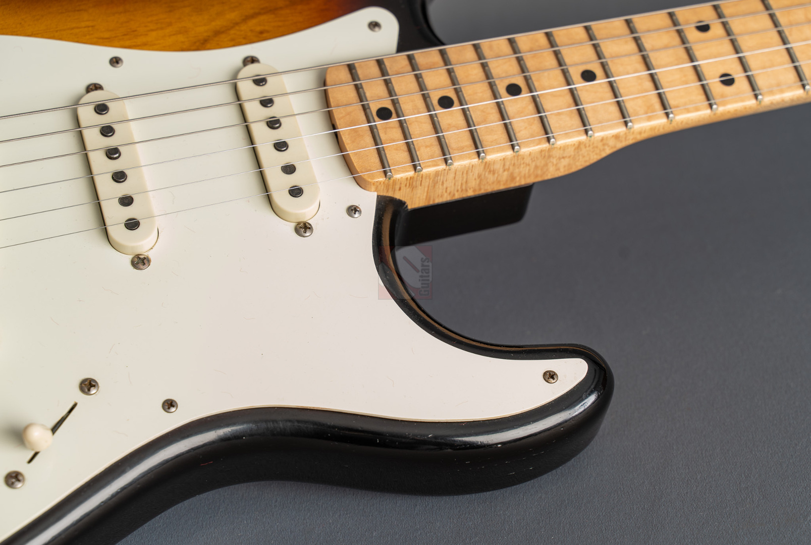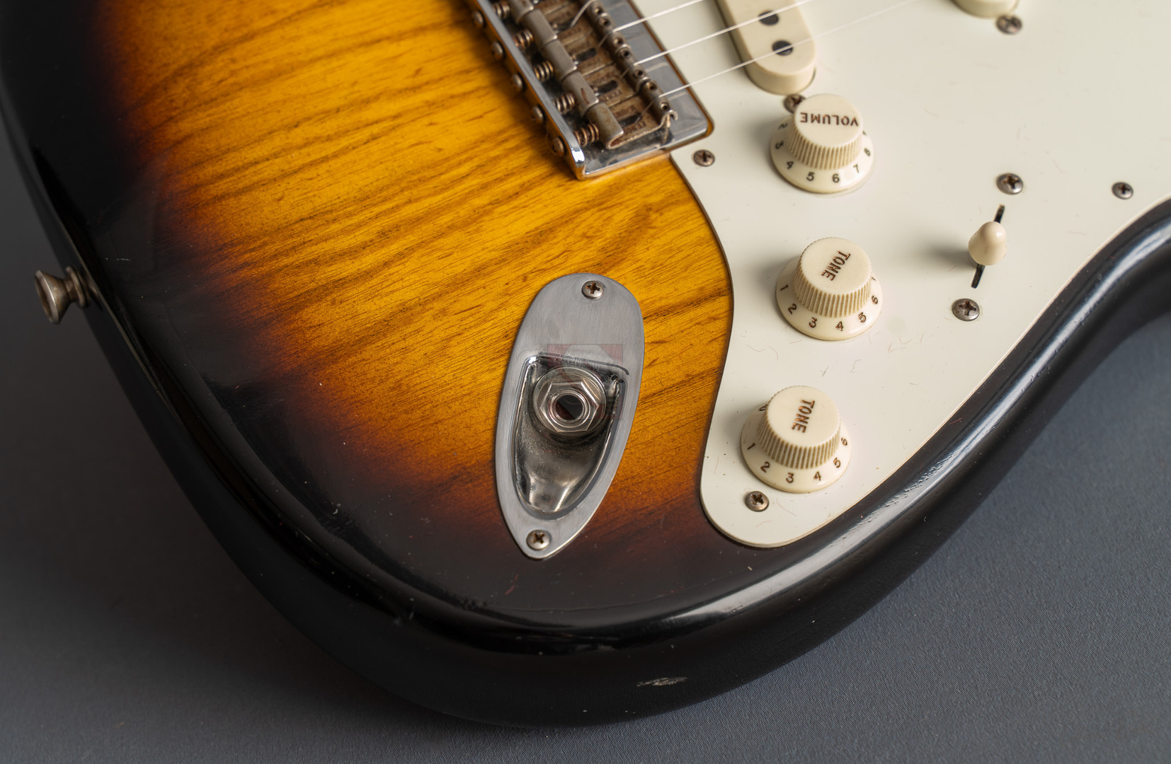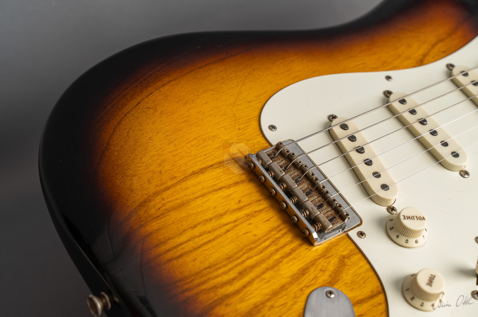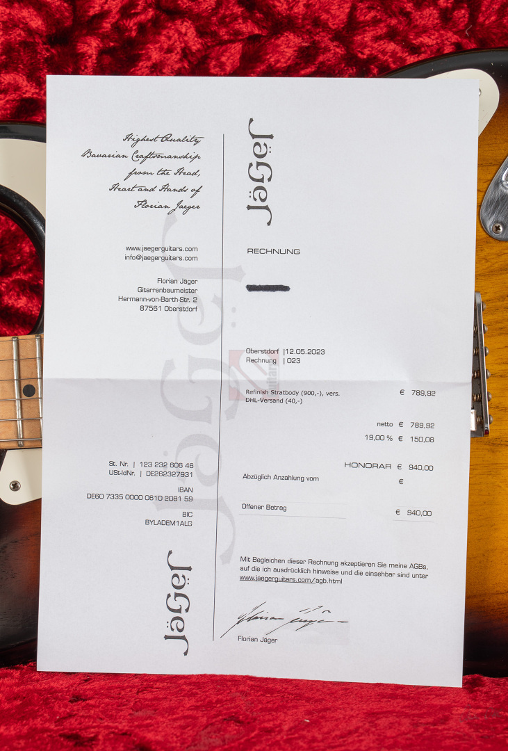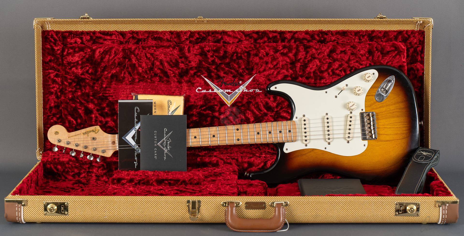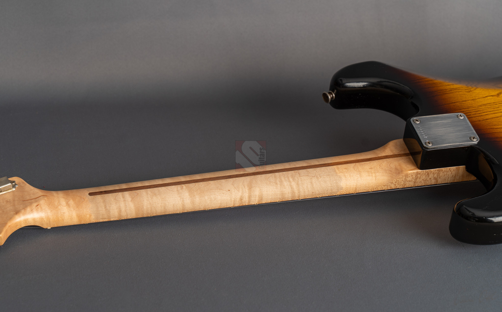 Today we are delighted to offer you a guitar that is so exclusive that even we have never come across anything quite like it: a '55 Stratocaster, masterbuilt by Greg Fessler and further refined by none other than Florian Jäger. Of course Greg Fessler's aging would have been perfectly adequate, but a Jäger makeover is definitely in a league of its own. The ultra-thin nitrocellulose lacquer alone, which makes the tactile structure of the wood wonderfully visible and palpable, is simply phenomenal. Without relying heavily on quirks or lacquer abrasio, Florian Jäger has created a vintage patina that is second to none. ...and the extremely attractive color of the “2-Tone Sunburst” finish perfectly rounds off the overall visual package. But that's not all, because masterbuilder Greg Fessler's signature can be felt in every detail that has to do with optimal playing characteristics and fantastic sound. He combines a “Large C” neck profile with speedy 6100 Jumbo frets and a 9.5'' fretboard radius. In combination with the fantastic weight of only 3150 grams, typical for a hardtail, and the satin finish on the back of the AA flame neck the playing feel is incredibly good! And in terms of sound, this guitar is also in a league of its own. Custom Shop legend Josefina Campos wound the “Handwound 56” pickups (including RWRP in the middle to suppress noise) and gave these pickups just the right amount of warmth and richness, combined with fast attack and perfect response. Whether clean, distorted or high-gain, it's fun to savor every note here. From bell-like and sparkling to wonderfully rich and smacking, this Stratocaster always cuts a fine figure. All in all, this is a 100-point Strat that we can offer you in top condition.