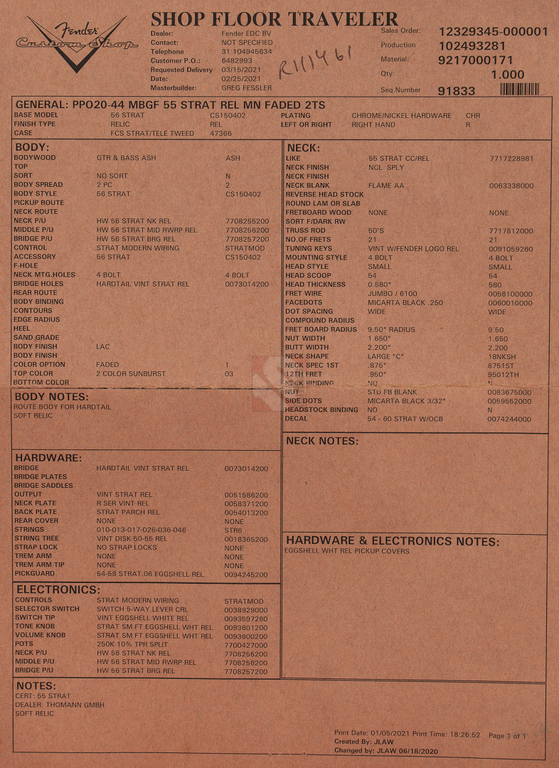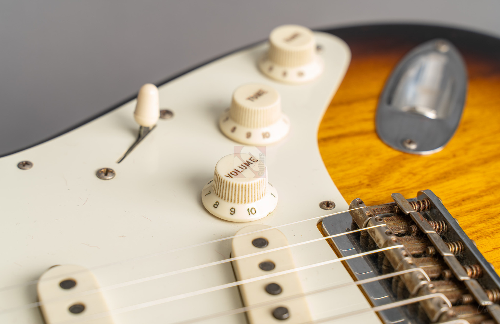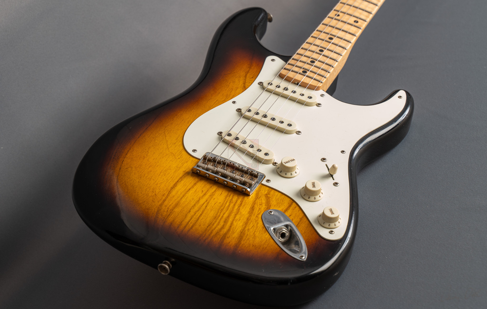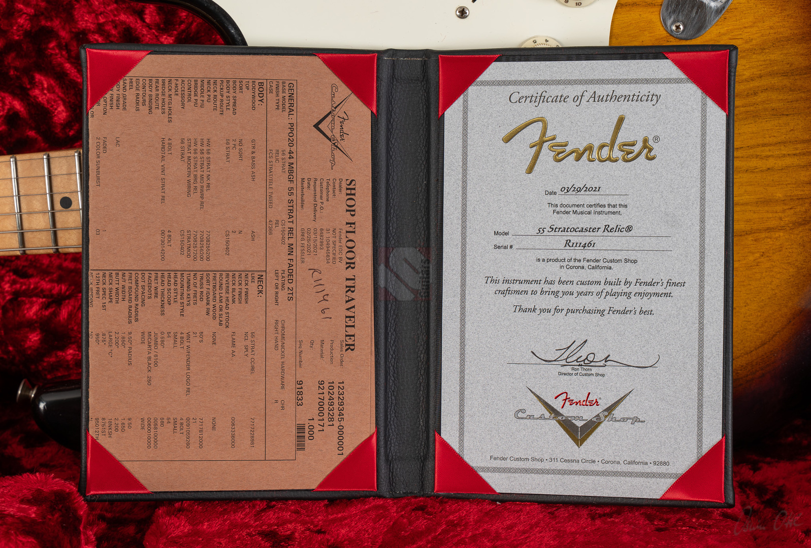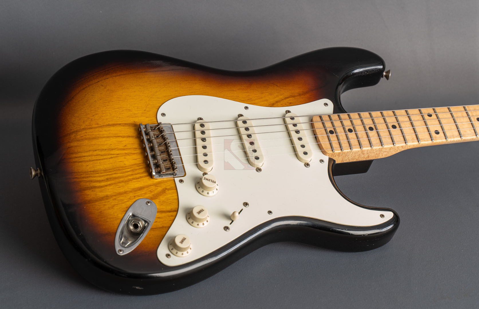 Today we are delighted to offer you a guitar that is so exclusive that even we have never come across anything quite like it: a '55 Stratocaster, masterbuilt by Greg Fessler and further refined by none other than Florian Jäger. Of course Greg Fessler's aging would have been perfectly adequate, but a Jäger makeover is definitely in a league of its own. The ultra-thin nitrocellulose lacquer alone, which makes the tactile structure of the wood wonderfully visible and palpable, is simply phenomenal. Without relying heavily on quirks or lacquer abrasio, Florian Jäger has created a vintage patina that is second to none. ...and the extremely attractive color of the “2-Tone Sunburst” finish perfectly rounds off the overall visual package. But that's not all, because masterbuilder Greg Fessler's signature can be felt in every detail that has to do with optimal playing characteristics and fantastic sound. He combines a “Large C” neck profile with speedy 6100 Jumbo frets and a 9.5'' fretboard radius. In combination with the fantastic weight of only 3150 grams, typical for a hardtail, and the satin finish on the back of the AA flame neck the playing feel is incredibly good! And in terms of sound, this guitar is also in a league of its own. Custom Shop legend Josefina Campos wound the “Handwound 56” pickups (including RWRP in the middle to suppress noise) and gave these pickups just the right amount of warmth and richness, combined with fast attack and perfect response. Whether clean, distorted or high-gain, it's fun to savor every note here. From bell-like and sparkling to wonderfully rich and smacking, this Stratocaster always cuts a fine figure. All in all, this is a 100-point Strat that we can offer you in top condition.