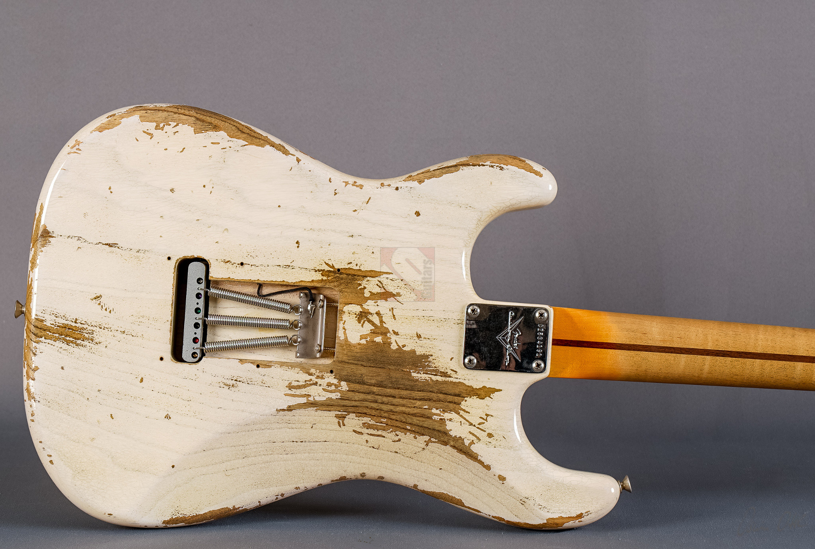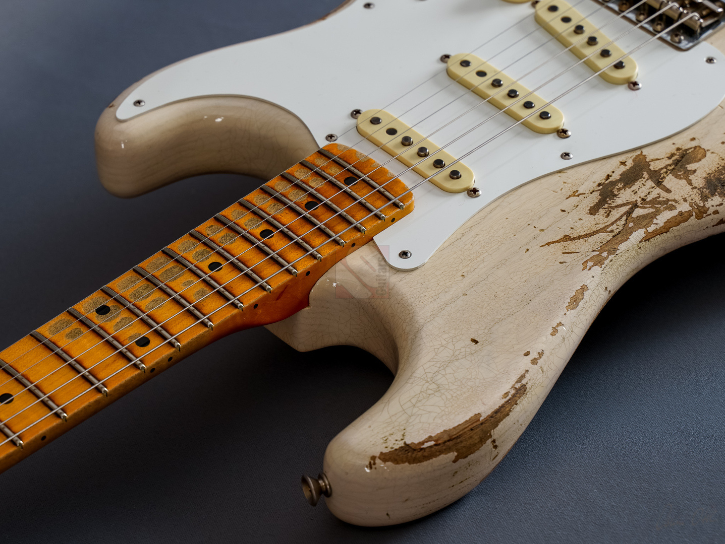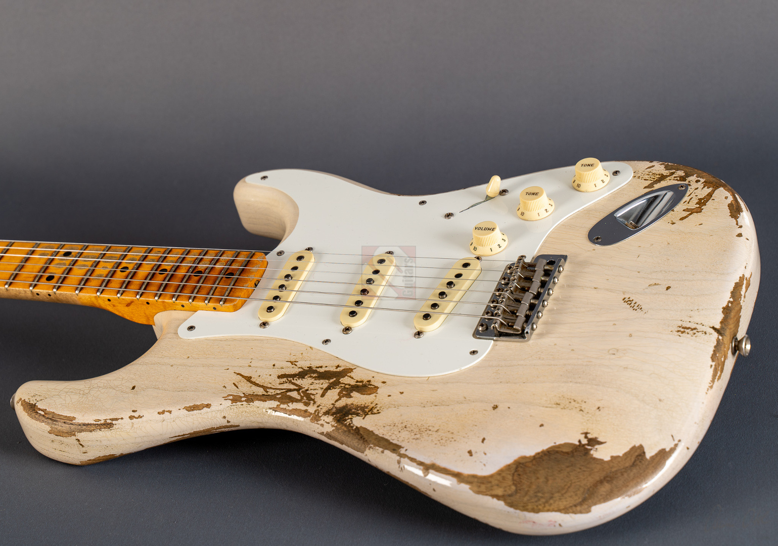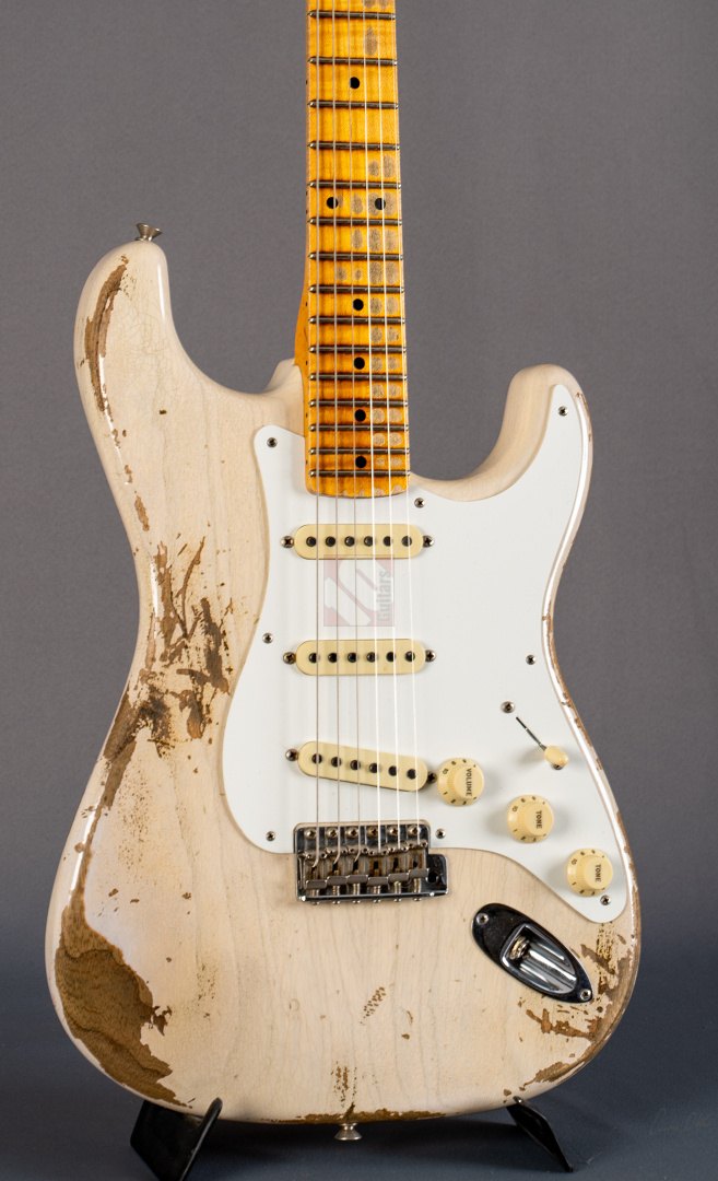 Everything about this '58 ash Strat in “Aged White Blonde” is just right, ...look, sound, feel and price. The Heavy Relicing is perfectly done here. Super authentic look with a beautifully grained body under the White Blonde. The neck is simply a dream. Very nicely grained back with a silky matte, woody feel. 6105 frets and a 9.5" fretboard radius for a modern feel and the "59 Esquire C" shaping fits perfectly in the hand. A nice, strong neck that is by no means too thick. Even played dry the superb resonance is striking and the "Josefina Handwound Fat 50s" pickups transfer this to the amp in the best possible way. A bell-like, balanced tone with a wide frequency spectrum and great attack. Anyone looking for the perfect ash maple neck Strat will be delighted with this one. The Stratocaster is in absolutely top condition, including strap and case candies.