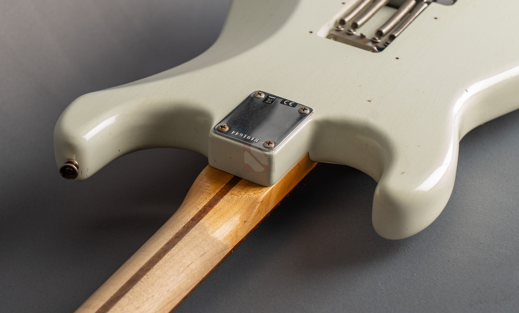 Anyone looking for an extremely well thought-out and soundmighty Super Strat will not be able to avoid this guitar. This '59 Stratocaster HSS Journeyman definitely falls into the category of guitars that you won't want to put down. The concept of a “Hot Rod Super Strat” has been consistently followed through here, but with extremely well thought-out specs, which in this combination make the greatest sense in terms of sound, feel and appearance: 22(!) 6100 Jumbo frets, 9.5-12’' fretboard radius and the popular “60 Style Oval” neck profile. In addition, an assorted alder body and a great pickup configuration: “Handwound 59” singlecoil on the neck, “Handwound Fat 50's” in the middle and a Seymour Duncan “78 EVH Zebra” humbucker on the bridge. The singlecoils offer the perfect 50's sound here and bring out the best in this extremely resonant gem on the amp. Lively bell tones, very bell-like with a great attack. So you can cover all the classic Strat sounds wonderfully, ...and the van Halen humbucker on the bridge naturally offers rich Rock planks of the very best, very fat tone with more than enough sustain for singing lead sounds. This Strat thus delivers the best of both worlds: uncompromising but always vivid Rock sound meets pearly, bell-like vintage tone! In terms of appearance the Strat is in classic, noble territory: a great weathered shade of “Olympic White” with a fantastic Journeyman relicing, which is limited to numerous hairline cracks and only a few small imperfections, creating a fantastic vintage patina. We are delighted to be able to offer you this fantastic Super Strat including the frets in top condition.