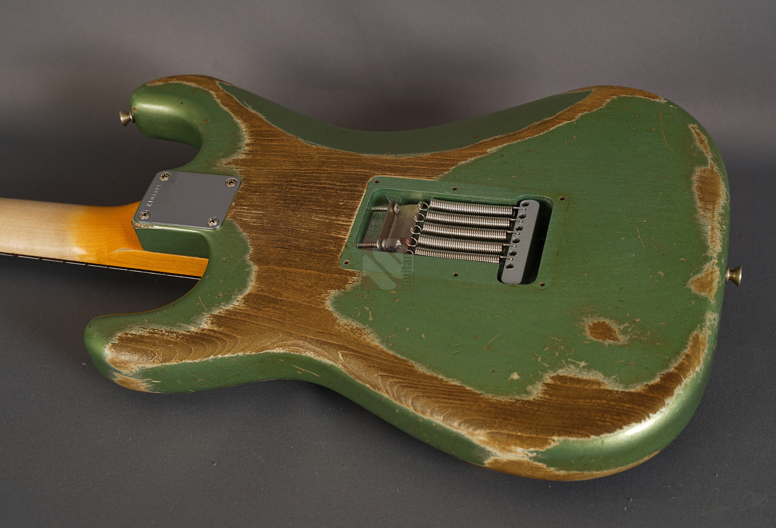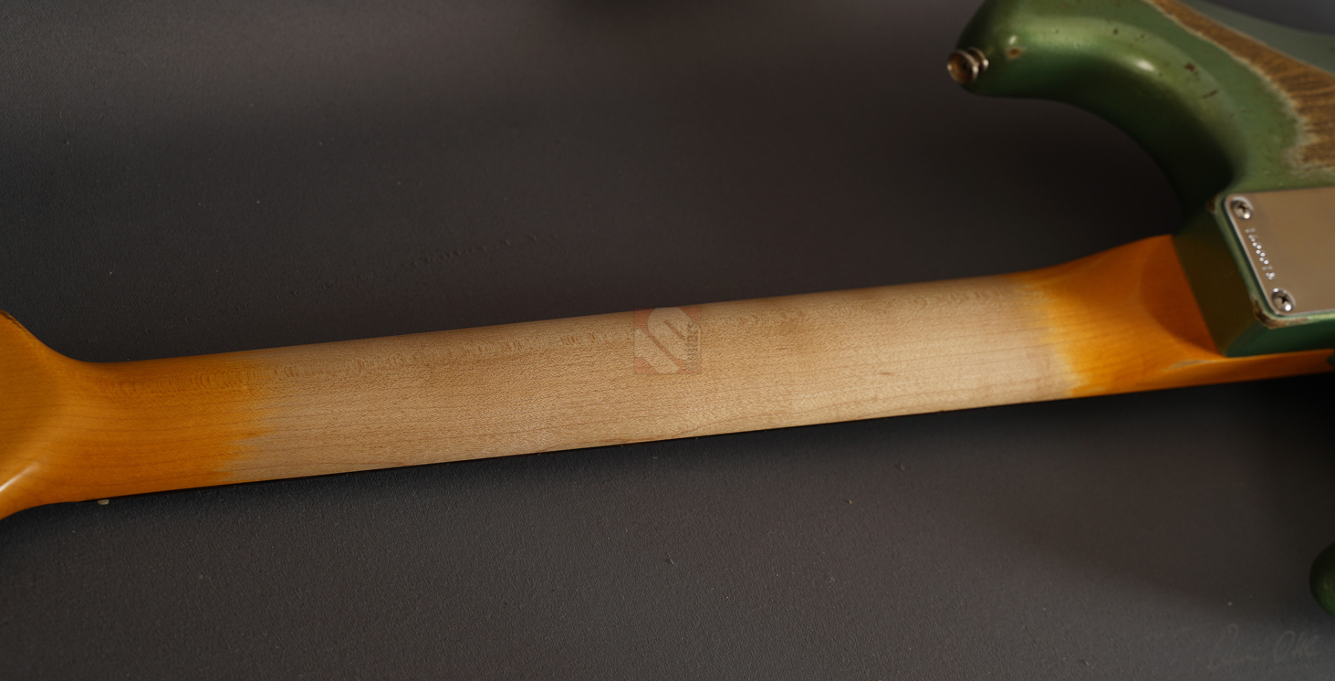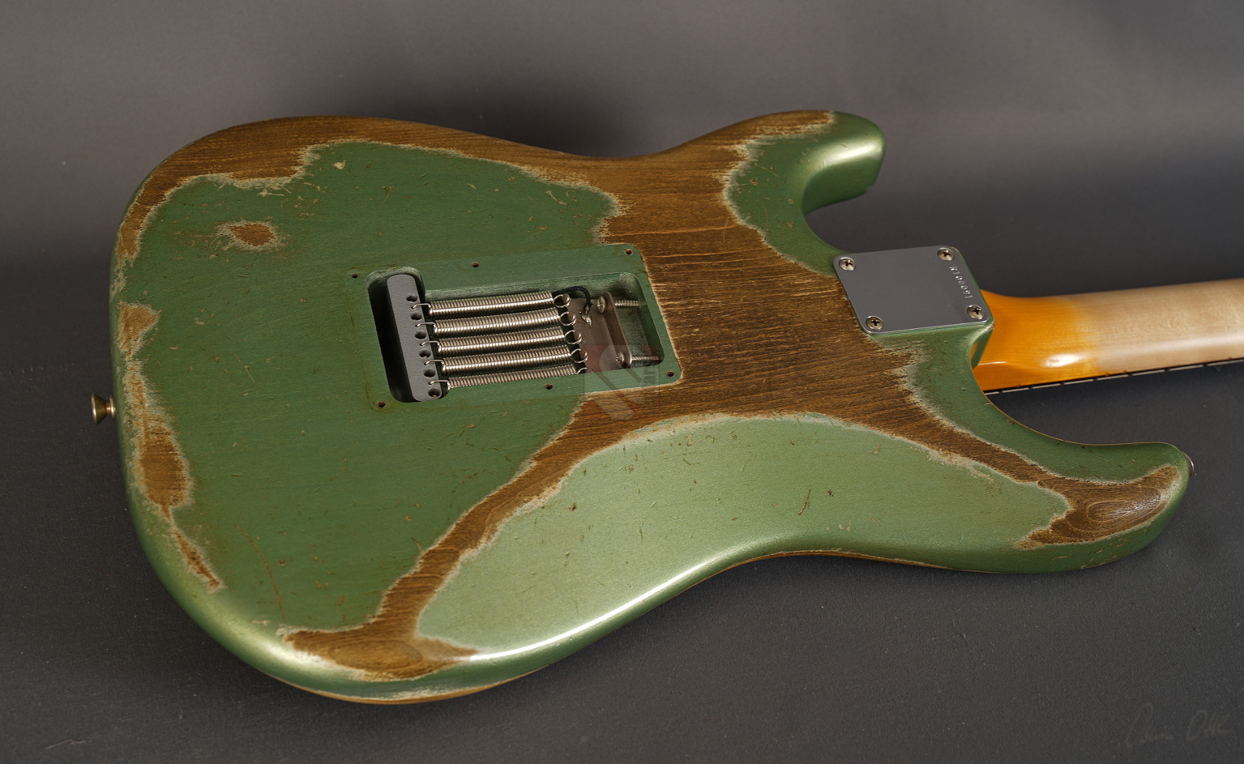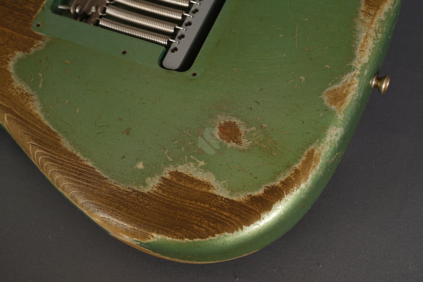 A very special Strat for all fans of extravagant looks. Very rare 60s Heavy Relic Strat in “Sage Green Metallic” with matching headstock. You simply have to see this guitar in real life. Killer looks and a fabulous player. Fantastic neck with a 7.25-9.5“ compound radius, 6105 frets and a ”Modern C" shape. This combination of specs gives the retro look a very modern feel. Plus, an extremely dark AAA rosewood fingerboard. The pickups are "Josefina Handwound 60's" pickups. Beautiful, round, bell-like and balanced Strat sound, just as you would expect from a very good 60's Strat. The frets are perfectly dressed and really invite you to fly. Once you start playing this Strat you won't want to put it down. It also impresses with distorted sounds, because the 60's pickups have very nice mids. A top-notch Strat with an extraordinary look and all in top condition.