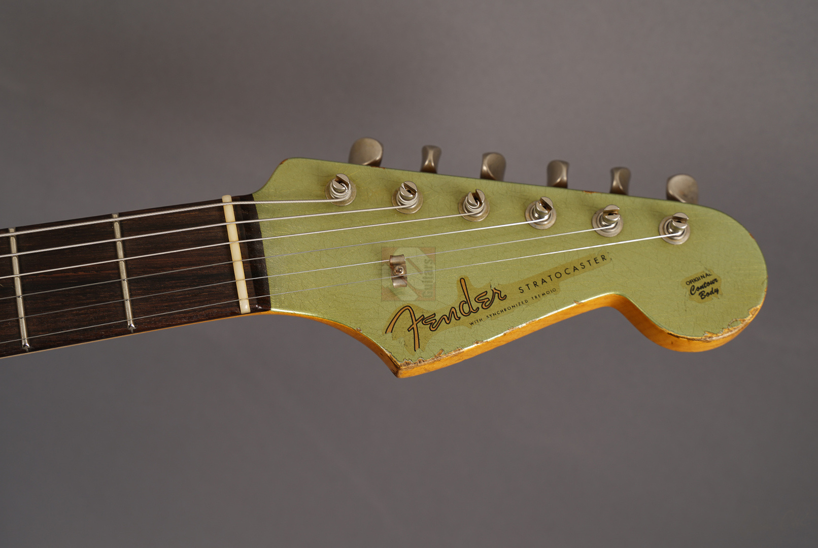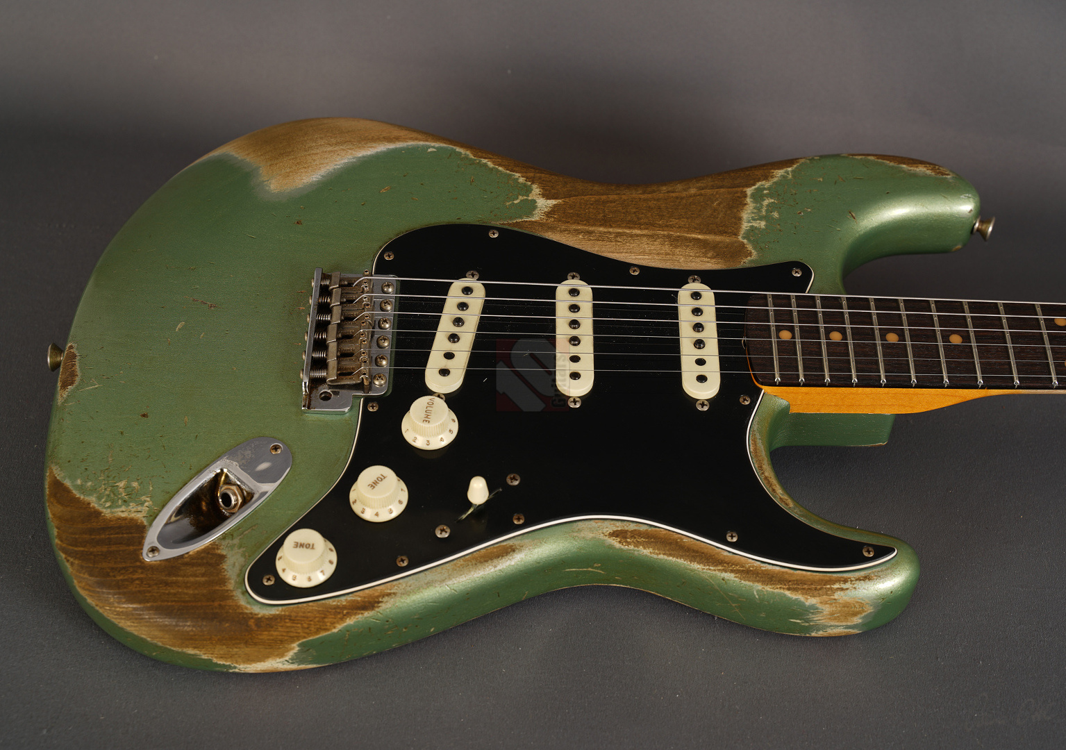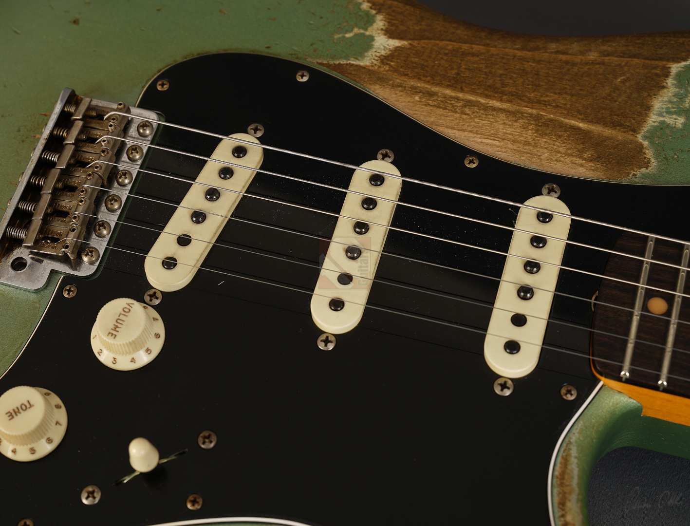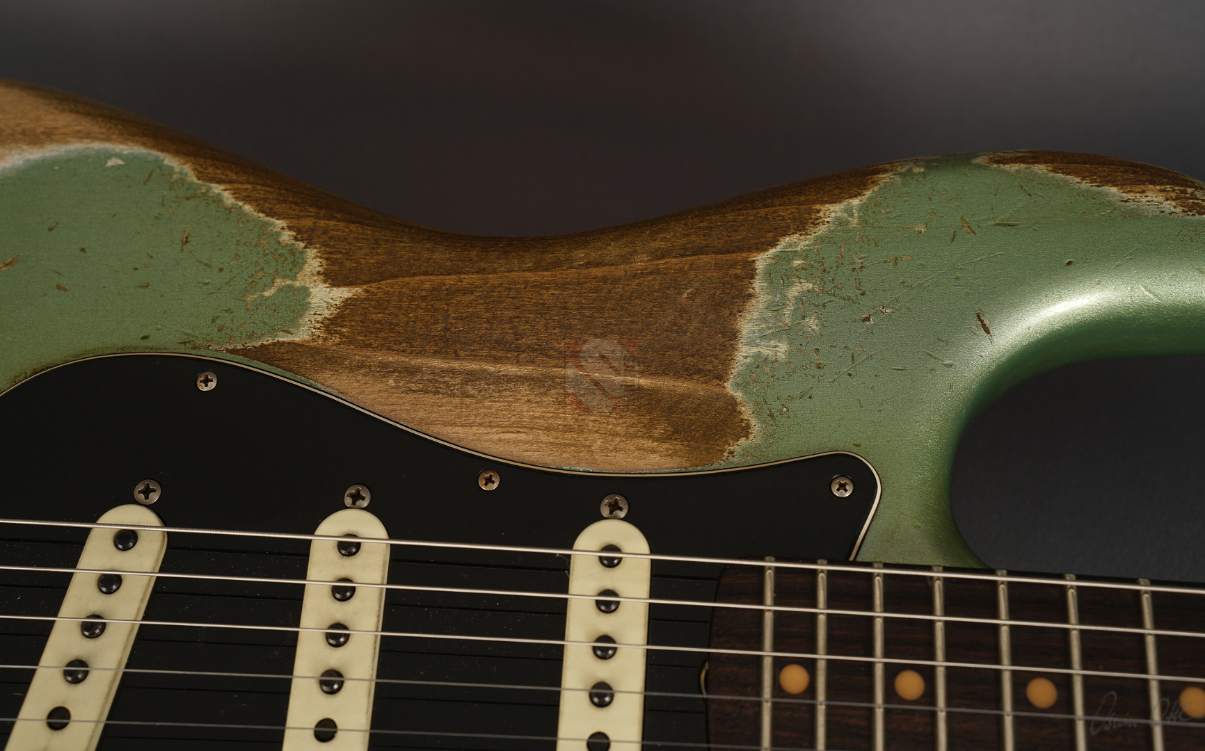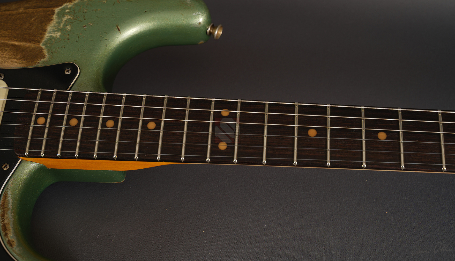 A very special Strat for all fans of extravagant looks. Very rare 60s Heavy Relic Strat in “Sage Green Metallic” with matching headstock. You simply have to see this guitar in real life. Killer looks and a fabulous player. Fantastic neck with a 7.25-9.5“ compound radius, 6105 frets and a ”Modern C" shape. This combination of specs gives the retro look a very modern feel. Plus, an extremely dark AAA rosewood fingerboard. The pickups are "Josefina Handwound 60's" pickups. Beautiful, round, bell-like and balanced Strat sound, just as you would expect from a very good 60's Strat. The frets are perfectly dressed and really invite you to fly. Once you start playing this Strat you won't want to put it down. It also impresses with distorted sounds, because the 60's pickups have very nice mids. A top-notch Strat with an extraordinary look and all in top condition.