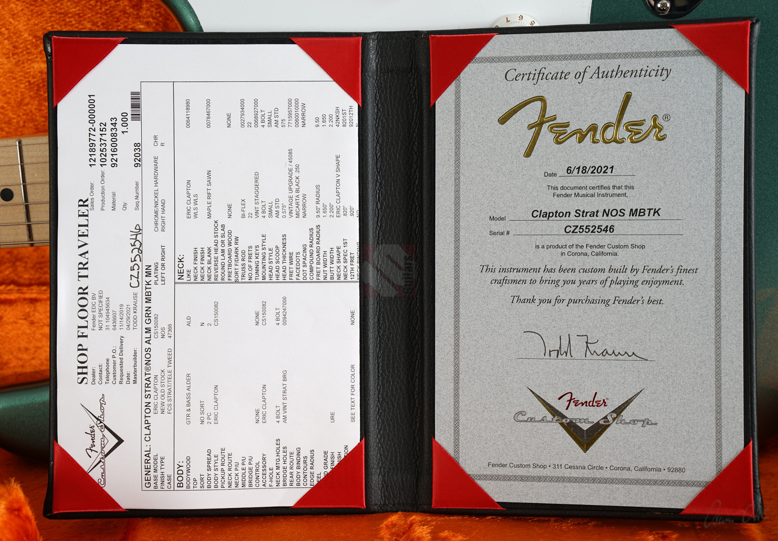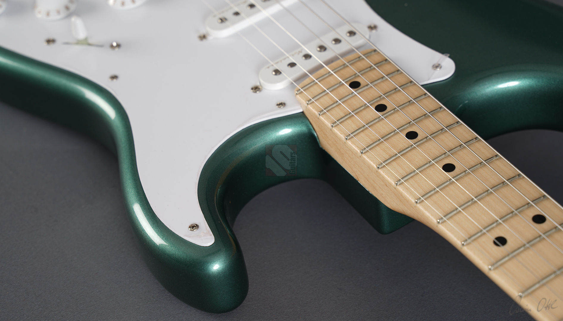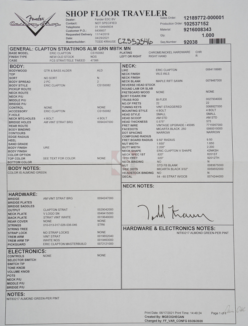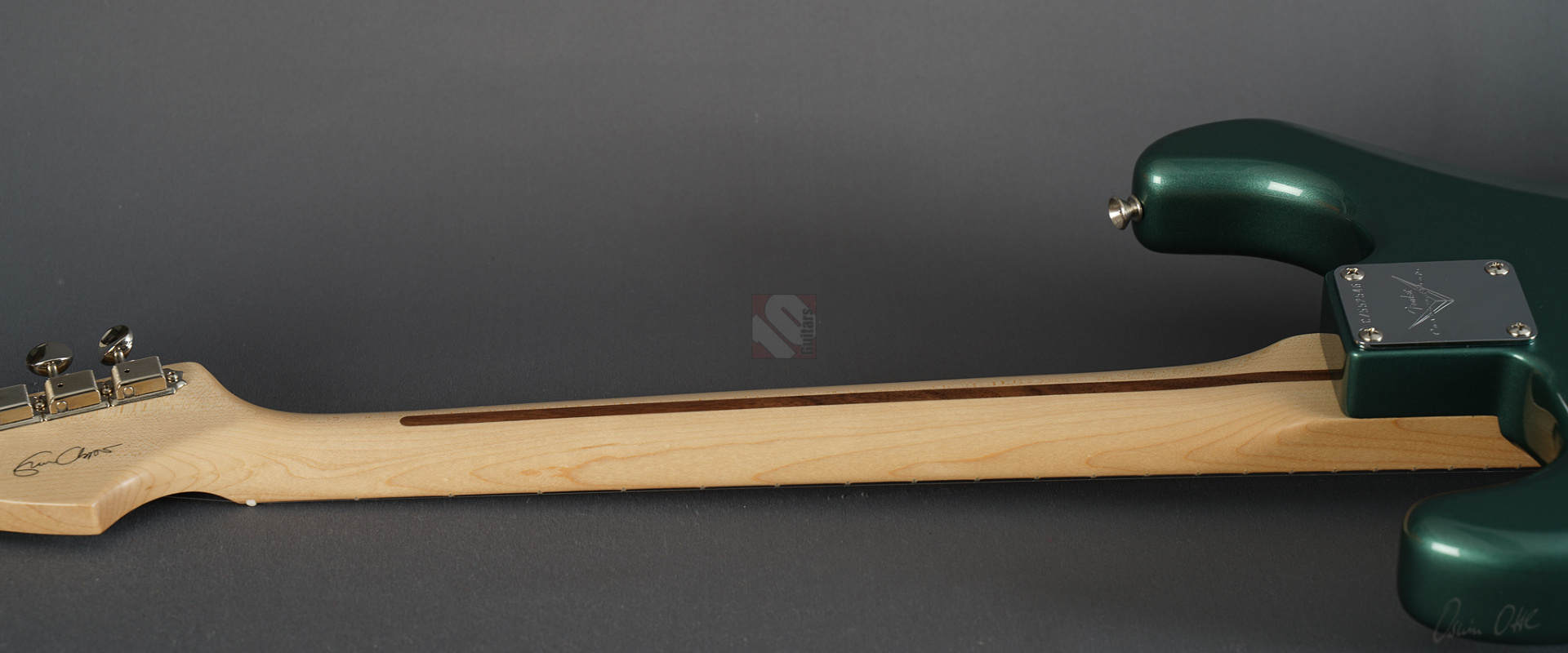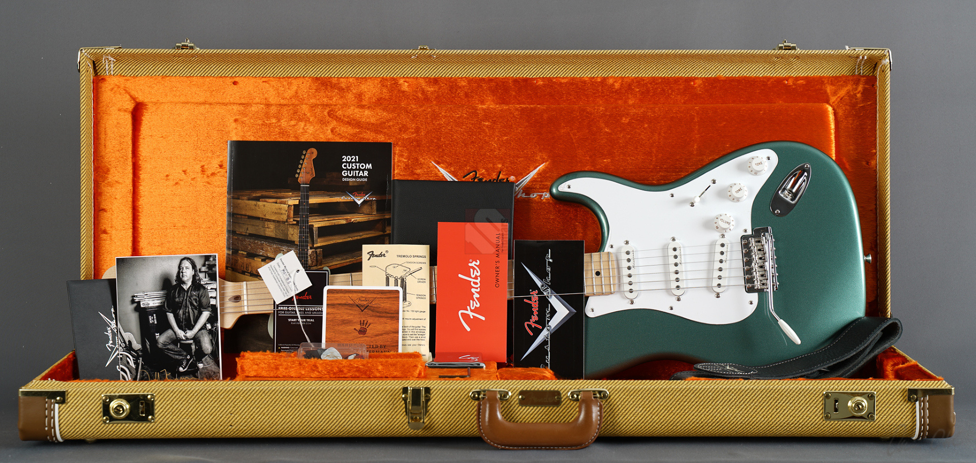 Todd Krause, “the” Clapton masterbuilder par excellence, produces unique and special custom models, which together with the work of Vincent van Trigt and Dale Wilson are among the most sought-after masterbuilds with considerable waiting times. Krause is definitely the masterbuilder who knows Eric's exact preferences better than anyone else. So we are delighted to be able to offer you a very special guitar from Krause today, a Stratocaster Eric Clapton in the extremely rare special color “Almond Green” (also known as “Aston Martin Green”) with a flawless NOS (“New Old Stock”) finish, adjustable Bi-Flex truss rod and “Vintage Staggered” tuners. And this Clapton Strat has it all! Its special features include three Fender “Vintage Noiseless” pickups and an active 25dB mid-boost, giving this guitar incredible versatility. The maple neck with a “Soft V” profile fits comfortably in the hand, the “Vintage Upgrade” frets are perfectly dressed as expected, and the alder body is incredibly resonant. When played clean, the guitar sounds very open, lively, sparkling and clear, and with every change of the mid-boost control you can visit another soundscape from Clapton's decades-long musical journey, even down to the fat, uncompromising sounds from his days with Cream and Derek & the Dominos. ...and as if all that weren't enough, we can offer you this gem including the frets in mint condition.
