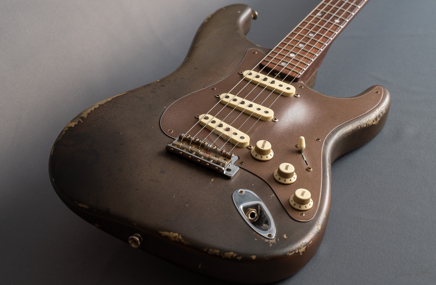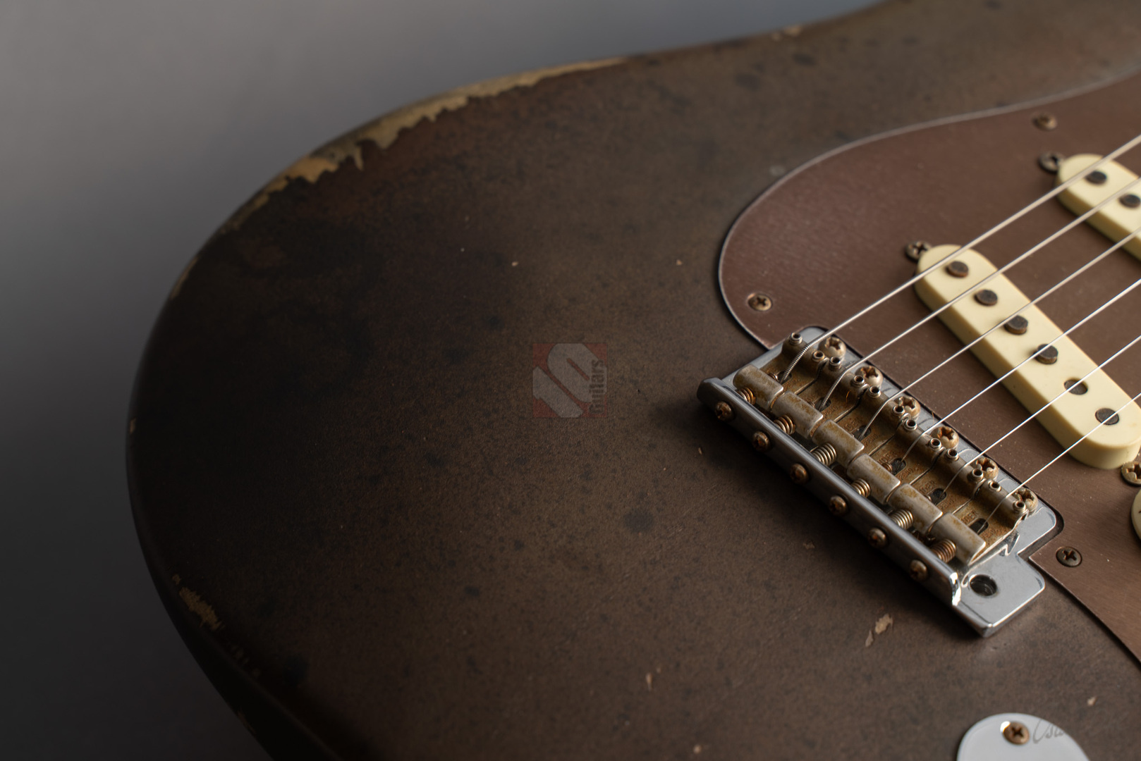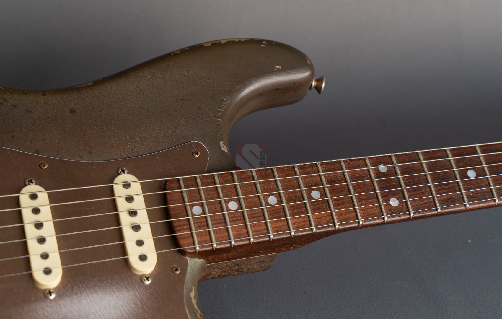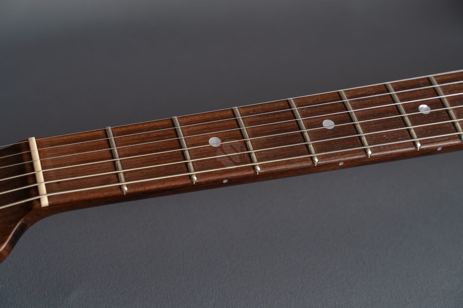 There are color combinations that just look particularly good. This is also the case with this Ironwood Strat, masterbuilt by Dale Wilson, in a fantastic relic finish. A unique and masterfully lacquered finish in “Faux Oxidized Copper and Iron,” combined with a “Brown Anodized Aluminum” pickguard and backplate, as well as a solid, oiled rosewood neck. This look is not only particularly exclusive, but also looks damn good. Classy, yet wonderfully “rocked out”! And in terms of sound, we're dealing with something special here: the three slightly hotter wound “Handwound Texas Special” pickups, combined with the guitar's magnificent vibration response, deliver an absolutely top-notch sound. Smacking, bell-like Rock sounds à la Stevie Ray Vaughan and Philip Sayce, super dynamic, beautifully pearly and radiant with enough warmth and openness. You really want to savor every note here! With distortion of course things really take off: smacking, biting and beautifully fat. The soundmighty rosewood neck comes with a comfortable “Large C” profile, 9.5'' radius and the wonderful 6100 Jumbo frets, resulting in top-notch playability and fantastic playing comfort. This guitar makes it easy to see why Dale Wilson is currently one of the most popular masterbuilders with considerable waiting times. He definitely has a knack for combining a great look with excellent playability and phenomenal sound. So we are delighted to be able to offer you this in so many ways fantastic Strat in absolutely top condition.