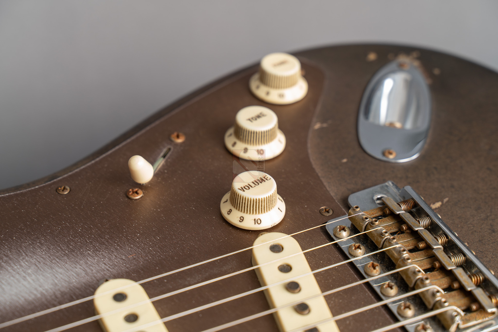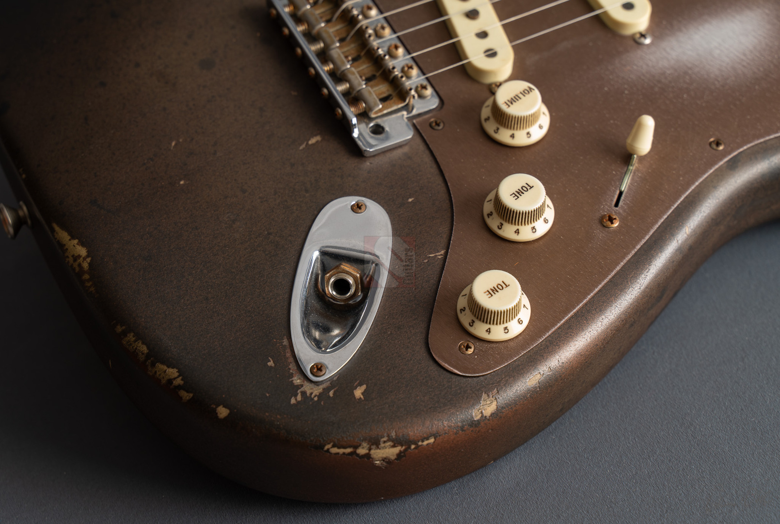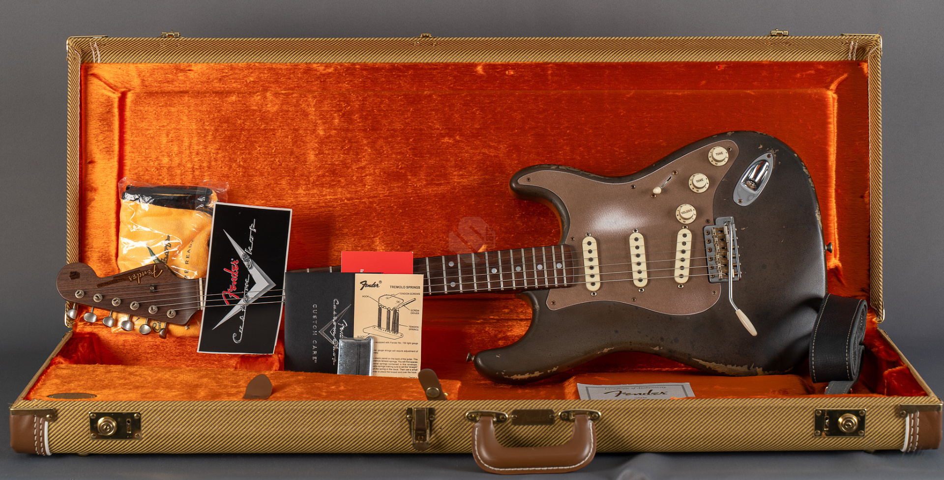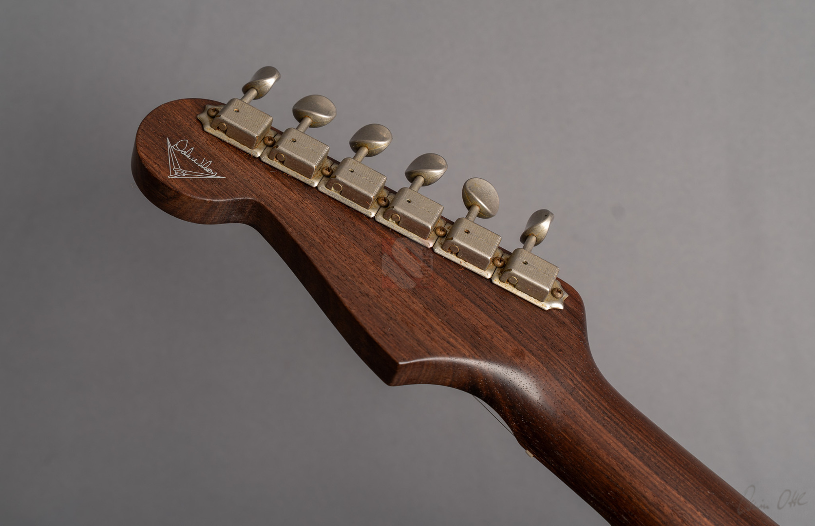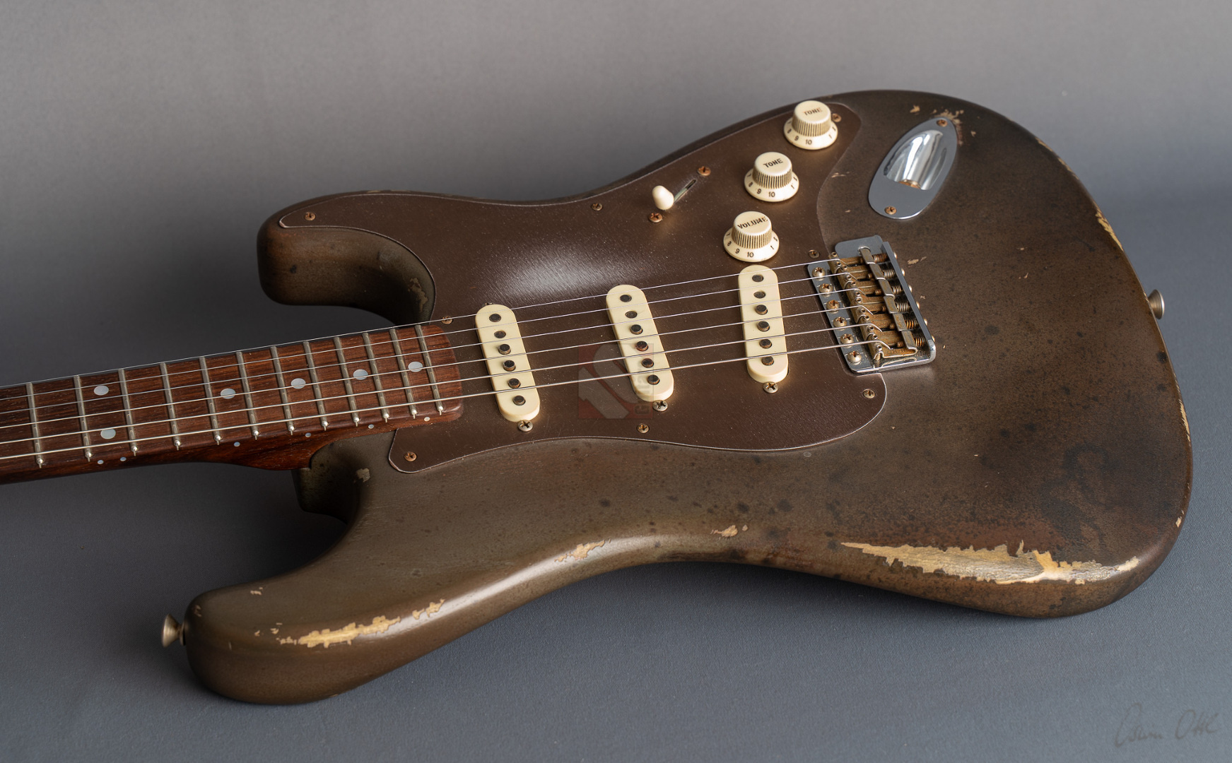 There are color combinations that just look particularly good. This is also the case with this Ironwood Strat, masterbuilt by Dale Wilson, in a fantastic relic finish. A unique and masterfully lacquered finish in “Faux Oxidized Copper and Iron,” combined with a “Brown Anodized Aluminum” pickguard and backplate, as well as a solid, oiled rosewood neck. This look is not only particularly exclusive, but also looks damn good. Classy, yet wonderfully “rocked out”! And in terms of sound, we're dealing with something special here: the three slightly hotter wound “Handwound Texas Special” pickups, combined with the guitar's magnificent vibration response, deliver an absolutely top-notch sound. Smacking, bell-like Rock sounds à la Stevie Ray Vaughan and Philip Sayce, super dynamic, beautifully pearly and radiant with enough warmth and openness. You really want to savor every note here! With distortion of course things really take off: smacking, biting and beautifully fat. The soundmighty rosewood neck comes with a comfortable “Large C” profile, 9.5'' radius and the wonderful 6100 Jumbo frets, resulting in top-notch playability and fantastic playing comfort. This guitar makes it easy to see why Dale Wilson is currently one of the most popular masterbuilders with considerable waiting times. He definitely has a knack for combining a great look with excellent playability and phenomenal sound. So we are delighted to be able to offer you this in so many ways fantastic Strat in absolutely top condition.