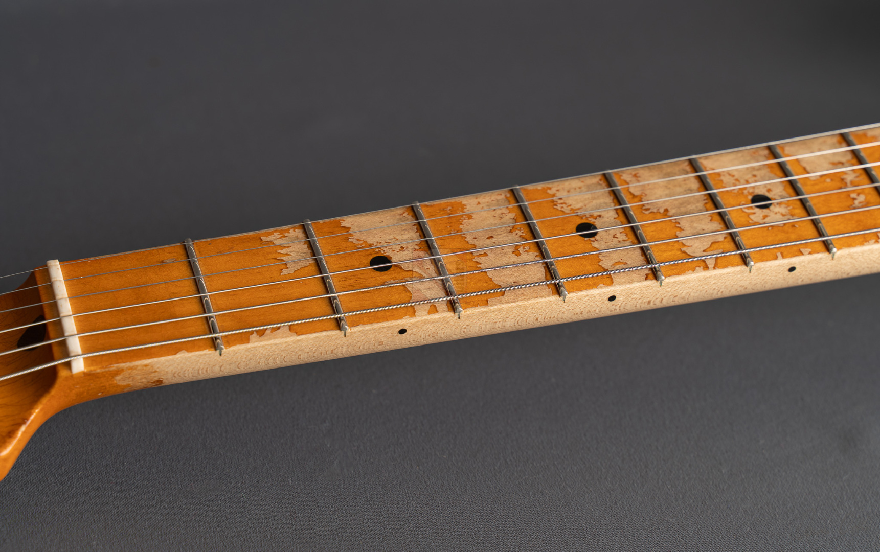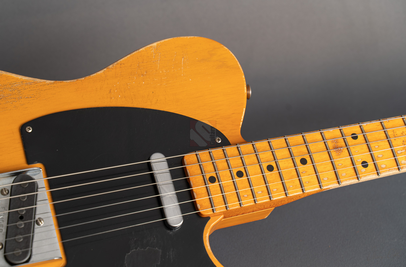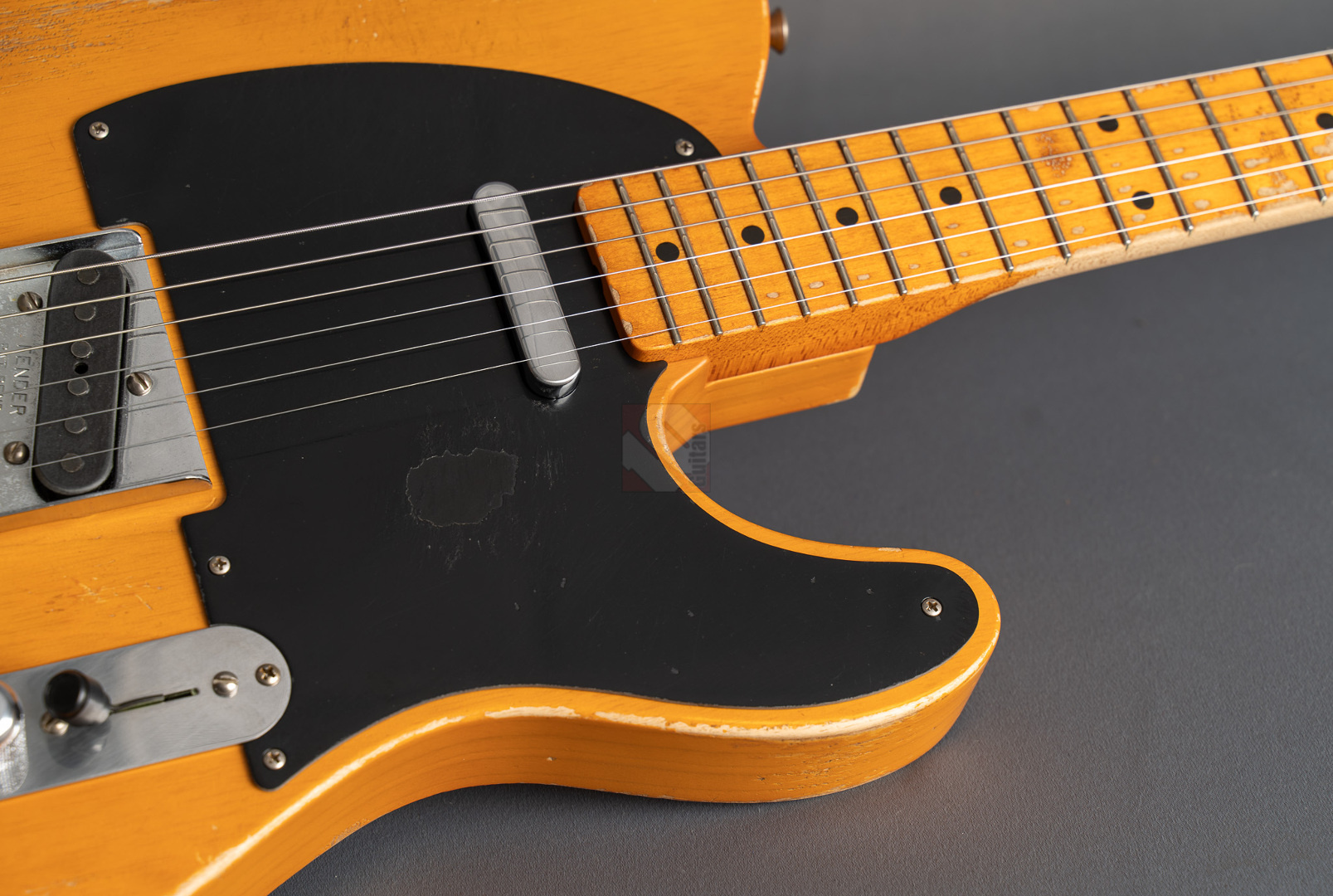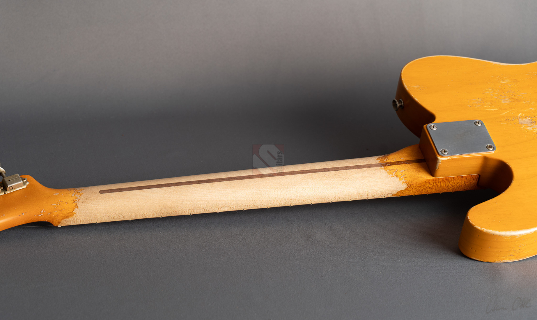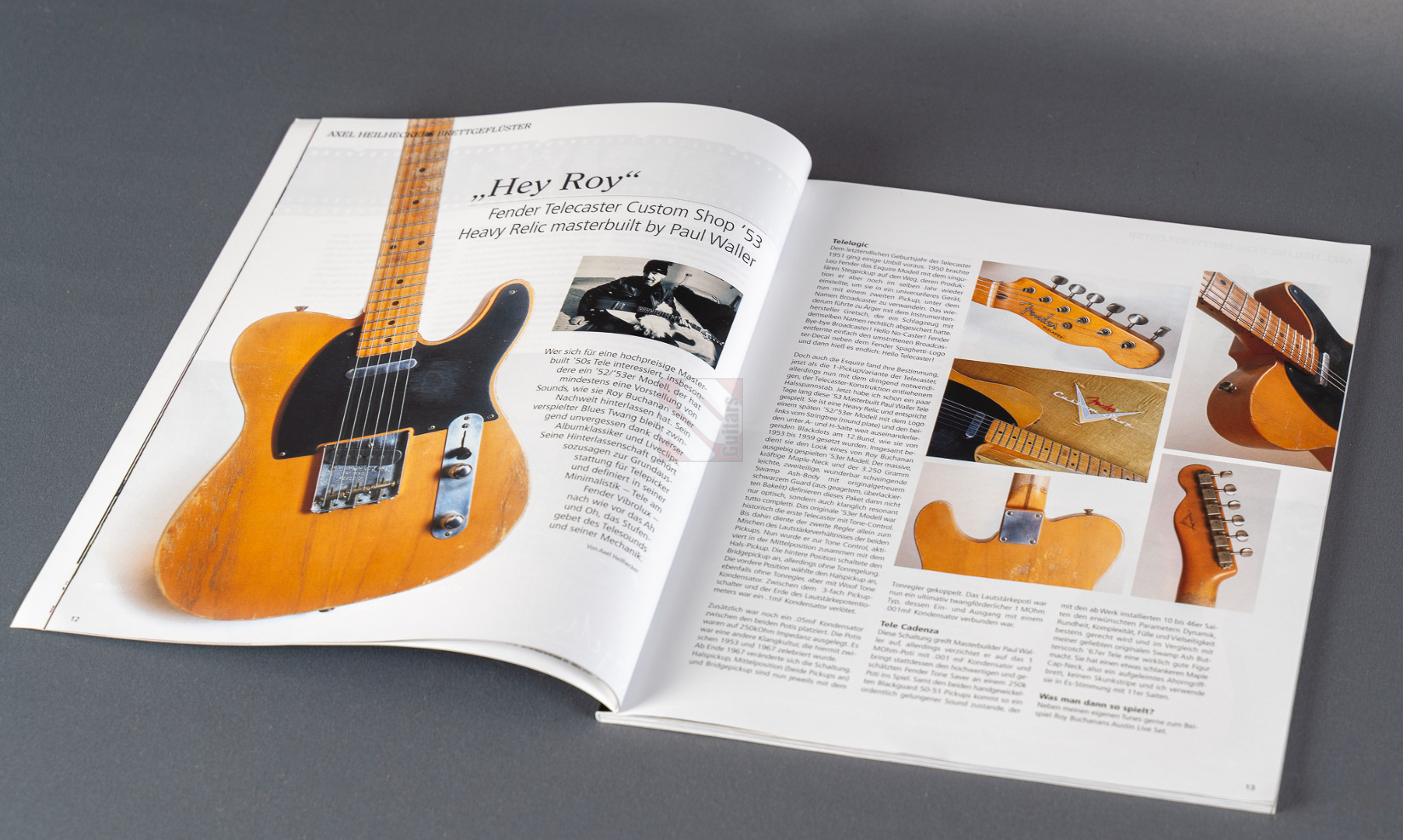 This outstanding '53 Tele with Heavy Relicing by masterbuilder Paul Waller combines a classic look and sound with state-of-the-art playability. Super resonant and with a proper Tele twang even when played dry! A very coherent feature here is the 12" fretboard radius, which ensures true playing pleasure and endless bendings in the upper registers with a low string action. The neck can certainly be described as "fat", but with the "1951 U" shape and the perfectly aligned frets it plays effortlessly and comfortably. The "Handwound 50-51" pickups provide the classic sound, ...very fast attack, Tele twang and great overtones without sounding thin or shrill. Even in the high-gain range this Tele makes a great impression as it still has enough midrange. This very Telecaster was featured in a detailed test report in "Grand Gtrs" magazine and the magazine is of course included in the scope of delivery. The Tele is in mint condition from 2024 with an ideal weight of just 3250 grams!