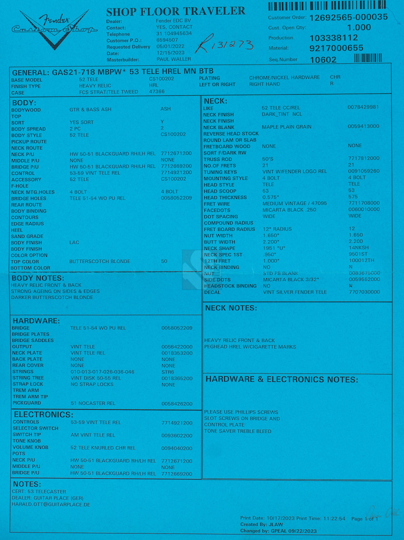 Fender Telecaster 53 Heavy Relic Masterbuilt Paul Waller (2024)