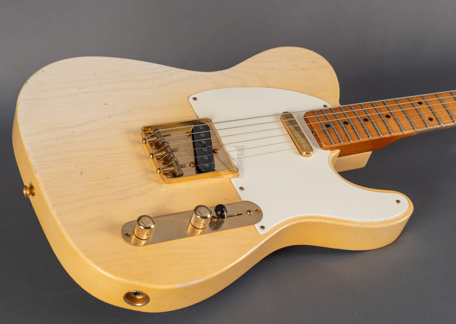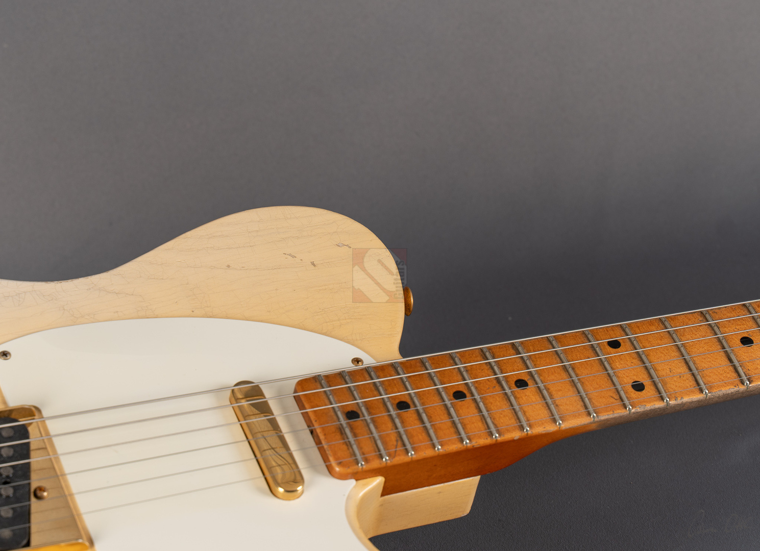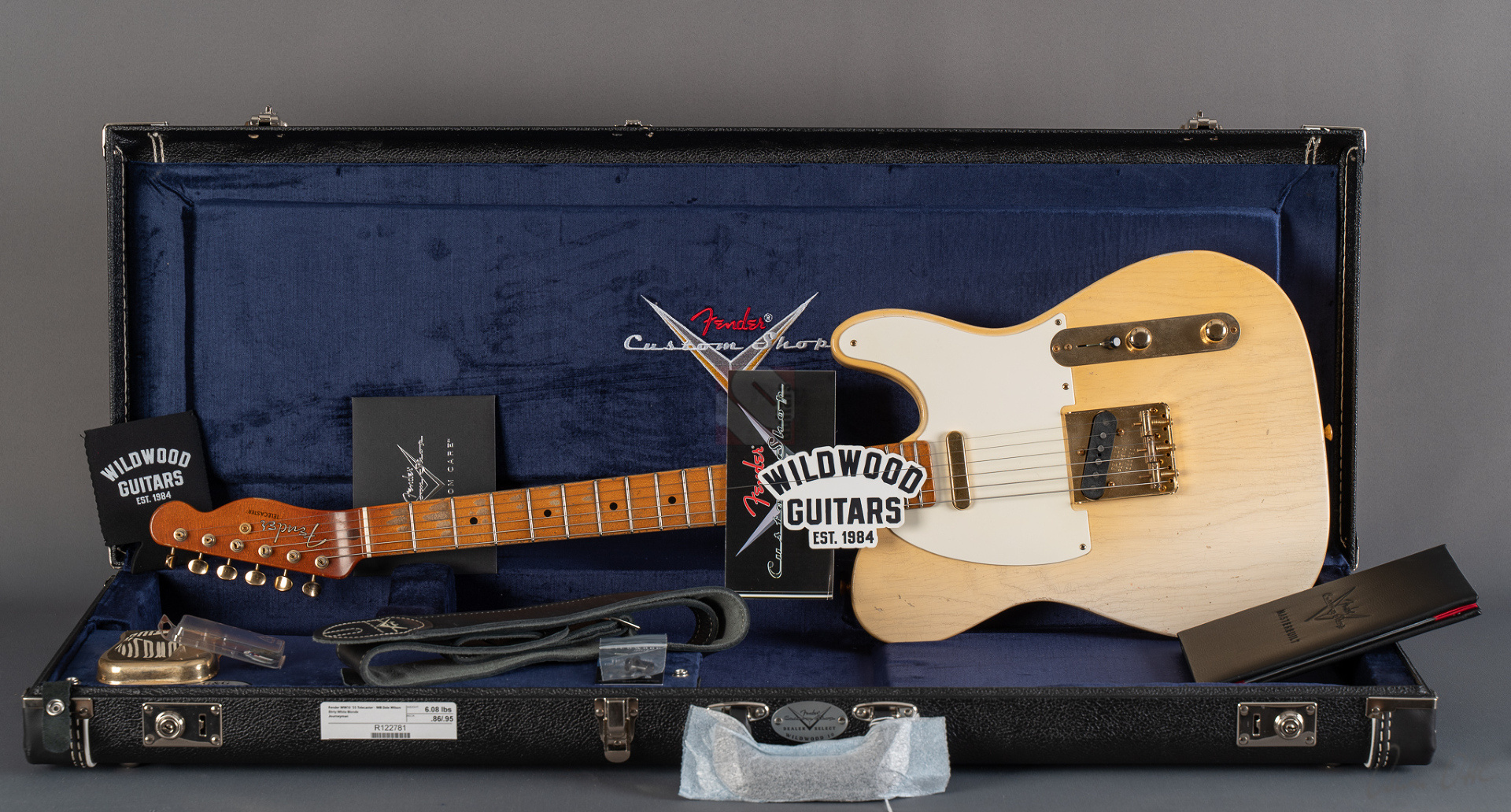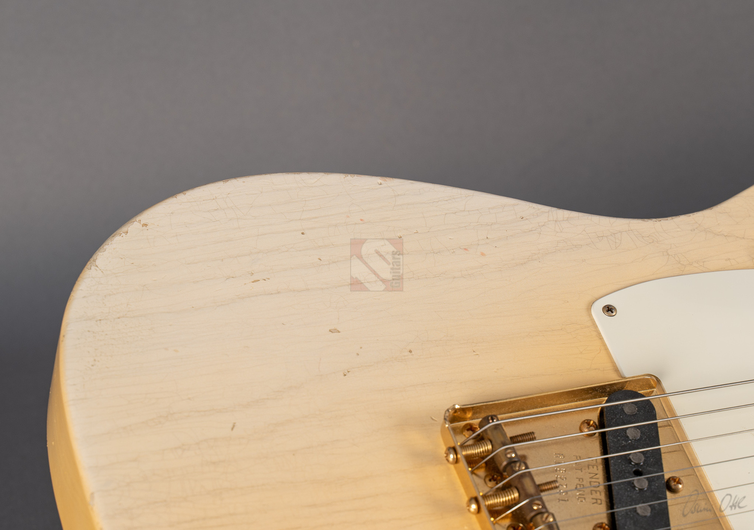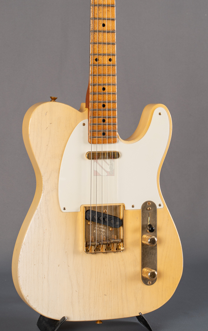 Guitarist Mary Kaye is actually known for her white-blonde Stratocaster with gold-colored hardware. Since this special look is still very popular today Wildwood Guitars regularly commissions different masterbuilders—in this case Dale Wilson—to create a corresponding Telecaster interpretation. And if you're looking for a Tele with ultimate playability and an absolutely killer sound, ...there it is! This '55 Telecaster deserves full marks in every category. With its unvarnished neck back, super comfortable “10/56V” profile and a dream weight of only 2790 grams(!) this guitar plays simply fantastic. Thanks to perfectly dressed Narrow/Tall frets and the characteristic 10" fretboard radius you'll fly across the fretboard. And then there's the sound! Already very loud, resonant, and direct when played dry, it shines so brightly through the amp that you'll never want to pick up another Tele again. This is ensured by two “Handwound WW10 Twisted Tele” pickups, which can be wonderfully bell-like and full, but also extremely concise and aggressive, not to say “dirty” when needed. This soundmighty Tele really has everything you could wish for in terms of sound. Super attack, sparkling, wiry, twangy, without ever sounding thin... that's exactly how a Tele should be! And the look speaks for itself. The Journeyman-reliced finish in “Faded Dirty White Blonde” enchants with its characteristic soft beige tone, which perfectly showcases the famous grain of the specially selected ash wood. Above all, however, the ingenious color shades immediately catch the eye, which together with the beautifully aged gold hardware result in a fabulous vintage look. The white-aged pickguard is a perfect match. As always with Wilson guitars, one highlight follows another, and as the icing on the cake the Telecaster also comes including the frets in mint condition to its future owner. Congratulations!
