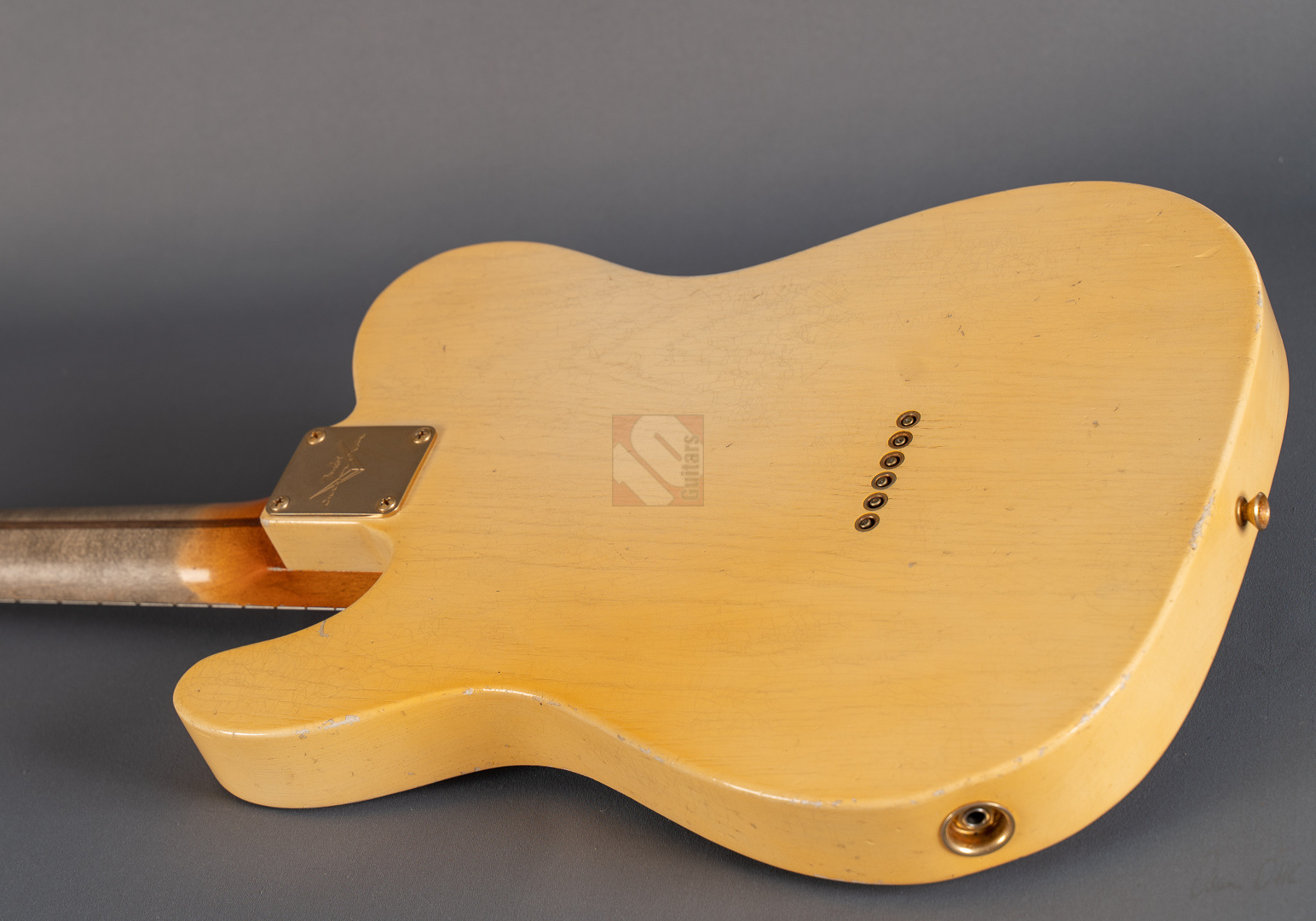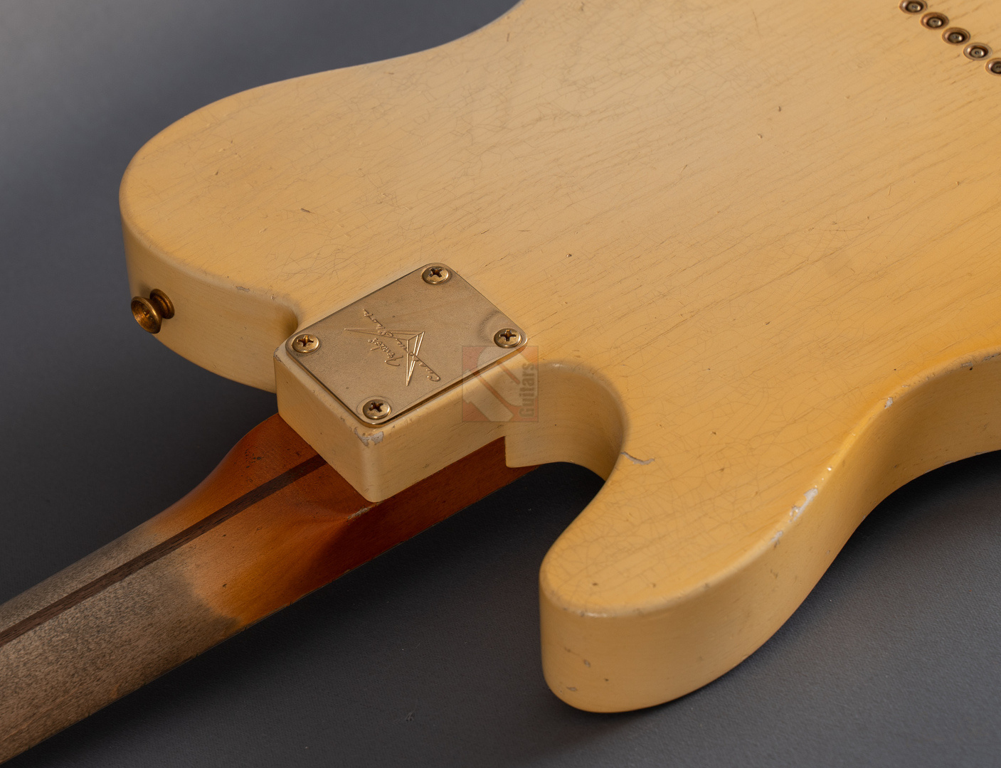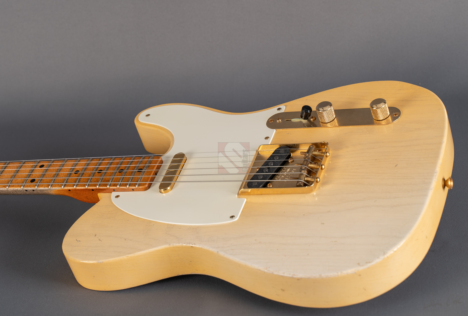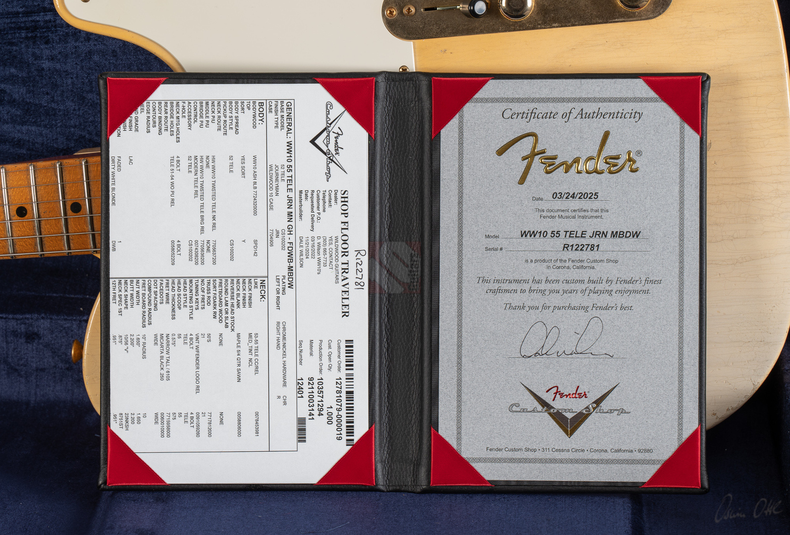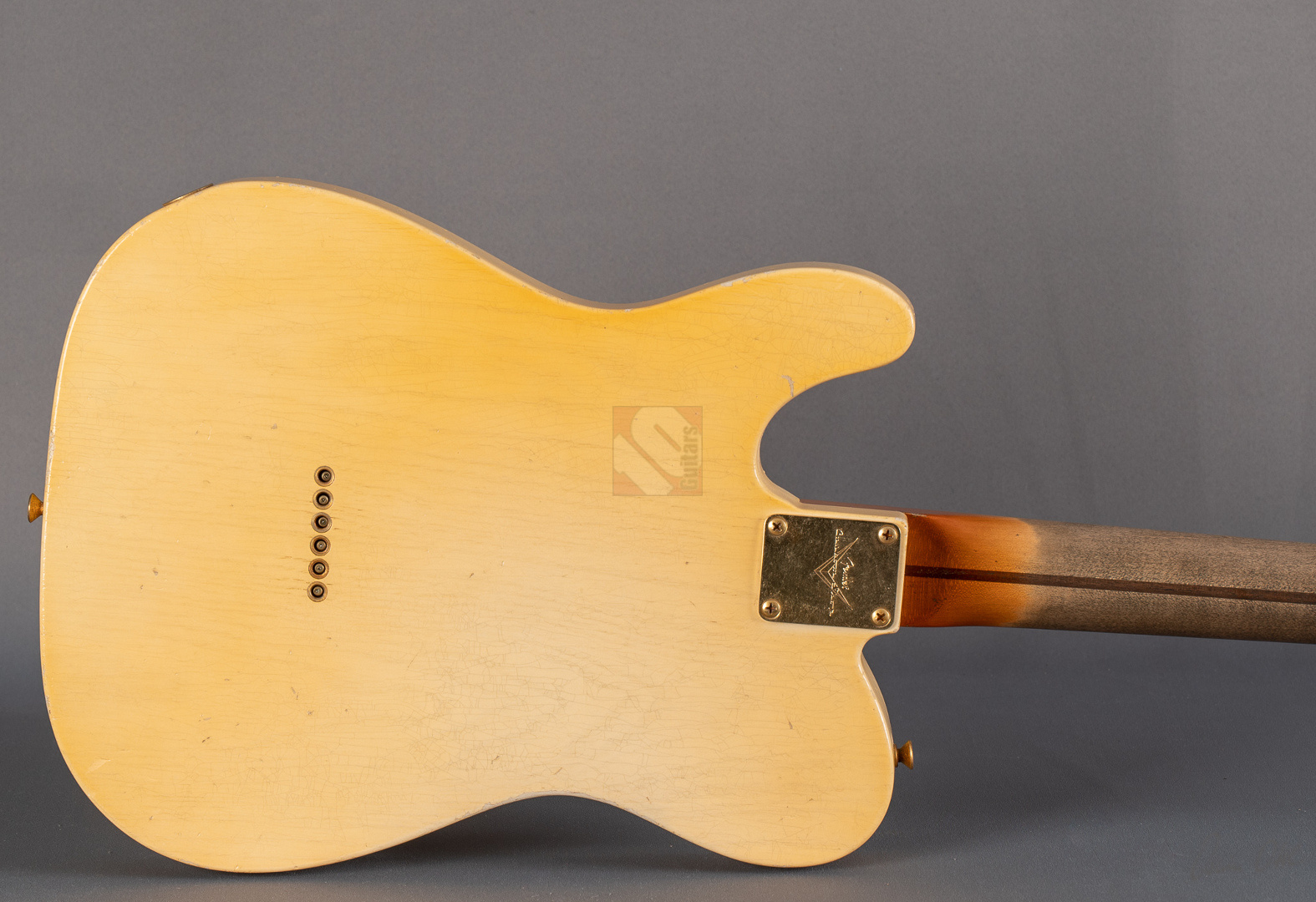 Guitarist Mary Kaye is actually known for her white-blonde Stratocaster with gold-colored hardware. Since this special look is still very popular today Wildwood Guitars regularly commissions different masterbuilders—in this case Dale Wilson—to create a corresponding Telecaster interpretation. And if you're looking for a Tele with ultimate playability and an absolutely killer sound, ...there it is! This '55 Telecaster deserves full marks in every category. With its unvarnished neck back, super comfortable “10/56V” profile and a dream weight of only 2790 grams(!) this guitar plays simply fantastic. Thanks to perfectly dressed Narrow/Tall frets and the characteristic 10" fretboard radius you'll fly across the fretboard. And then there's the sound! Already very loud, resonant, and direct when played dry, it shines so brightly through the amp that you'll never want to pick up another Tele again. This is ensured by two “Handwound WW10 Twisted Tele” pickups, which can be wonderfully bell-like and full, but also extremely concise and aggressive, not to say “dirty” when needed. This soundmighty Tele really has everything you could wish for in terms of sound. Super attack, sparkling, wiry, twangy, without ever sounding thin... that's exactly how a Tele should be! And the look speaks for itself. The Journeyman-reliced finish in “Faded Dirty White Blonde” enchants with its characteristic soft beige tone, which perfectly showcases the famous grain of the specially selected ash wood. Above all, however, the ingenious color shades immediately catch the eye, which together with the beautifully aged gold hardware result in a fabulous vintage look. The white-aged pickguard is a perfect match. As always with Wilson guitars, one highlight follows another, and as the icing on the cake the Telecaster also comes including the frets in mint condition to its future owner. Congratulations!