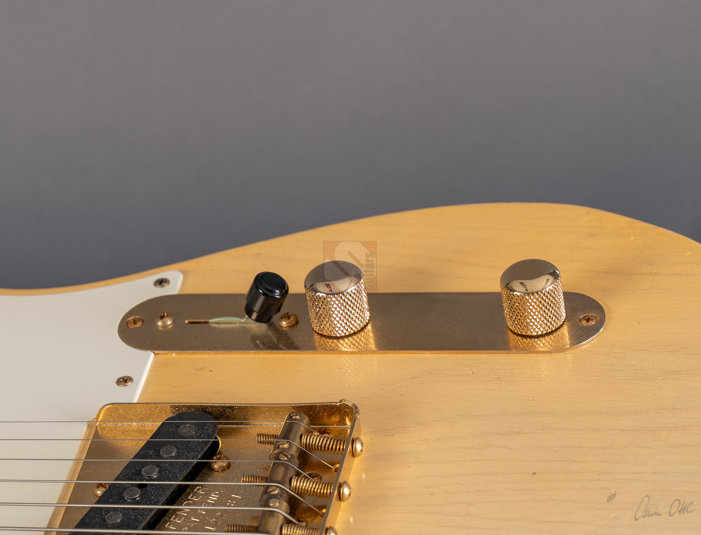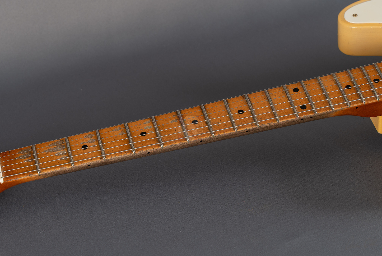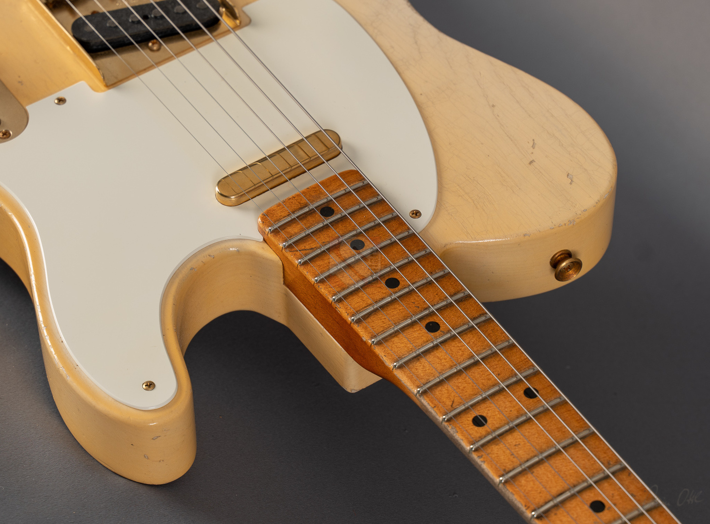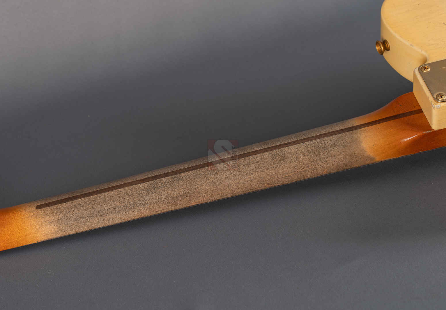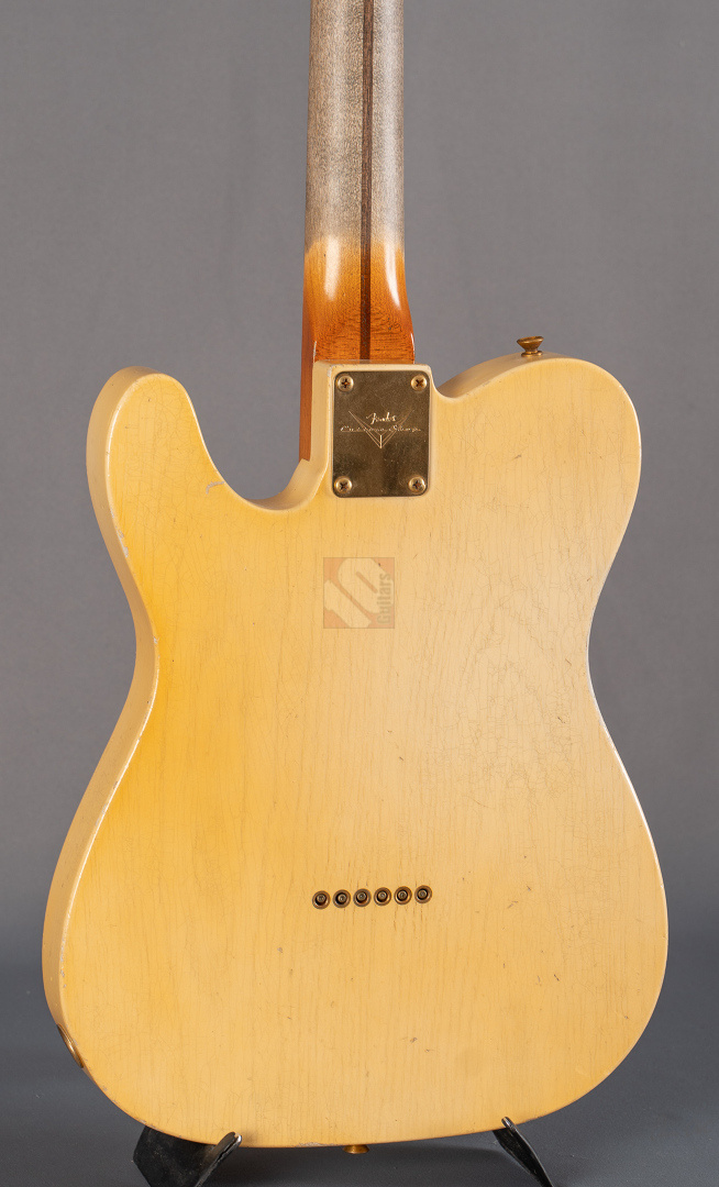 Guitarist Mary Kaye is actually known for her white-blonde Stratocaster with gold-colored hardware. Since this special look is still very popular today Wildwood Guitars regularly commissions different masterbuilders—in this case Dale Wilson—to create a corresponding Telecaster interpretation. And if you're looking for a Tele with ultimate playability and an absolutely killer sound, ...there it is! This '55 Telecaster deserves full marks in every category. With its unvarnished neck back, super comfortable “10/56V” profile and a dream weight of only 2790 grams(!) this guitar plays simply fantastic. Thanks to perfectly dressed Narrow/Tall frets and the characteristic 10" fretboard radius you'll fly across the fretboard. And then there's the sound! Already very loud, resonant, and direct when played dry, it shines so brightly through the amp that you'll never want to pick up another Tele again. This is ensured by two “Handwound WW10 Twisted Tele” pickups, which can be wonderfully bell-like and full, but also extremely concise and aggressive, not to say “dirty” when needed. This soundmighty Tele really has everything you could wish for in terms of sound. Super attack, sparkling, wiry, twangy, without ever sounding thin... that's exactly how a Tele should be! And the look speaks for itself. The Journeyman-reliced finish in “Faded Dirty White Blonde” enchants with its characteristic soft beige tone, which perfectly showcases the famous grain of the specially selected ash wood. Above all, however, the ingenious color shades immediately catch the eye, which together with the beautifully aged gold hardware result in a fabulous vintage look. The white-aged pickguard is a perfect match. As always with Wilson guitars, one highlight follows another, and as the icing on the cake the Telecaster also comes including the frets in mint condition to its future owner. Congratulations!