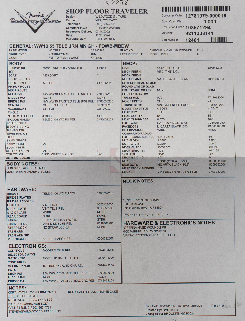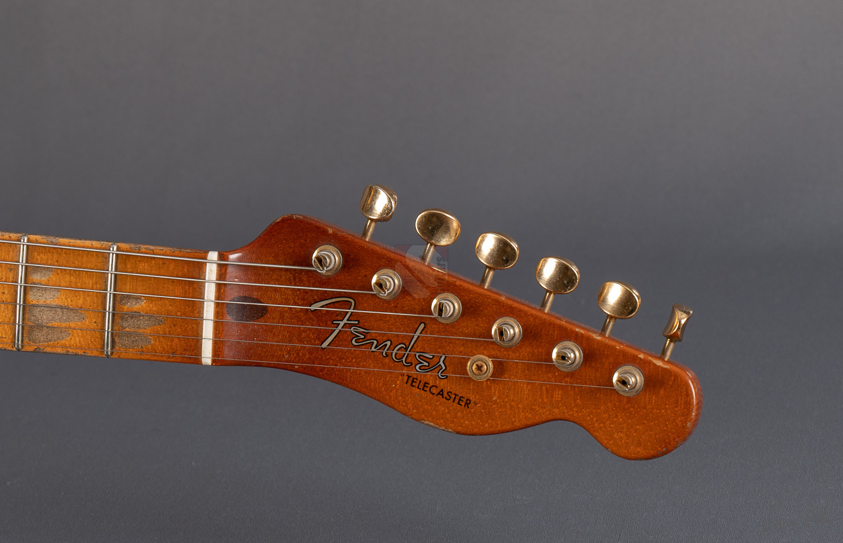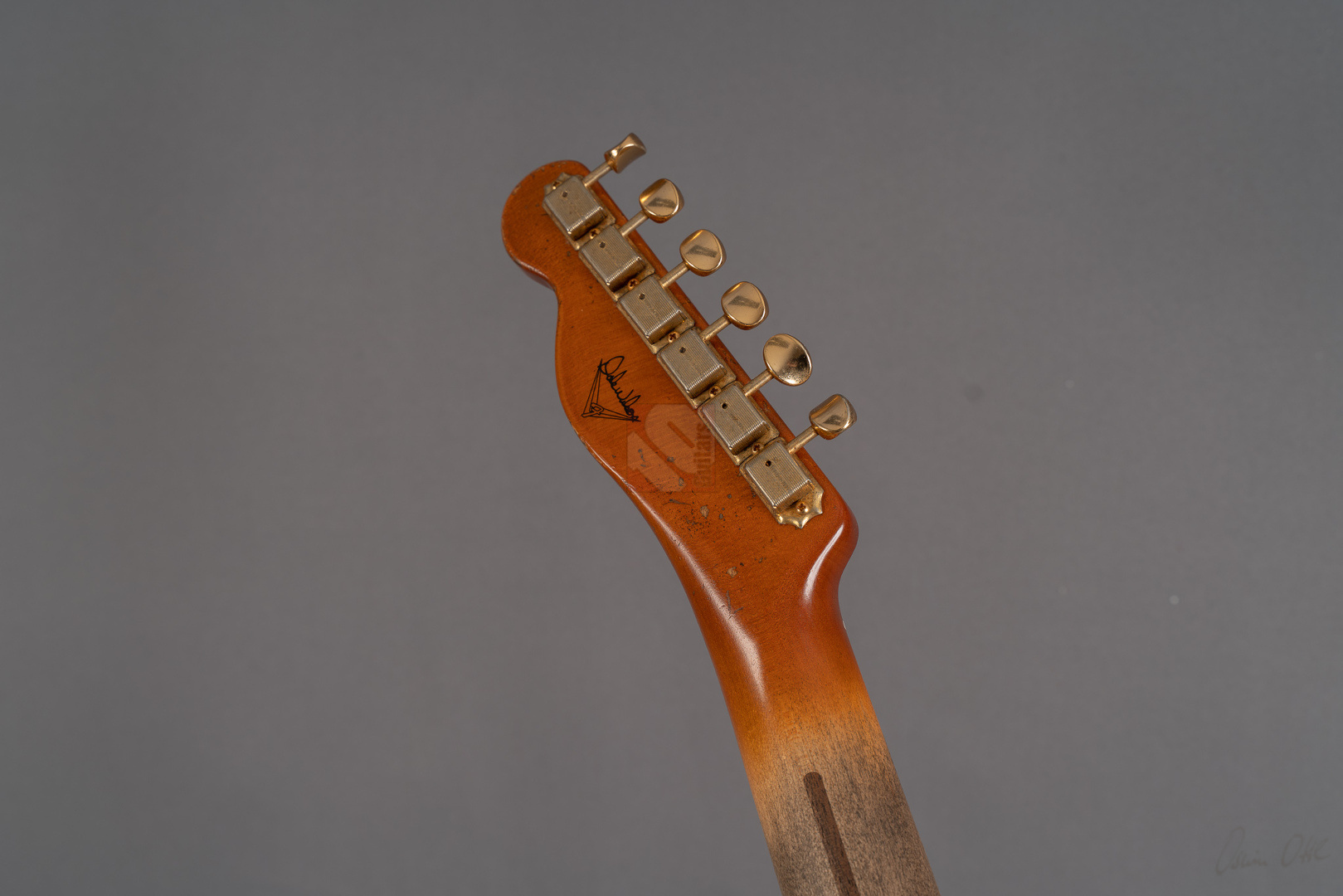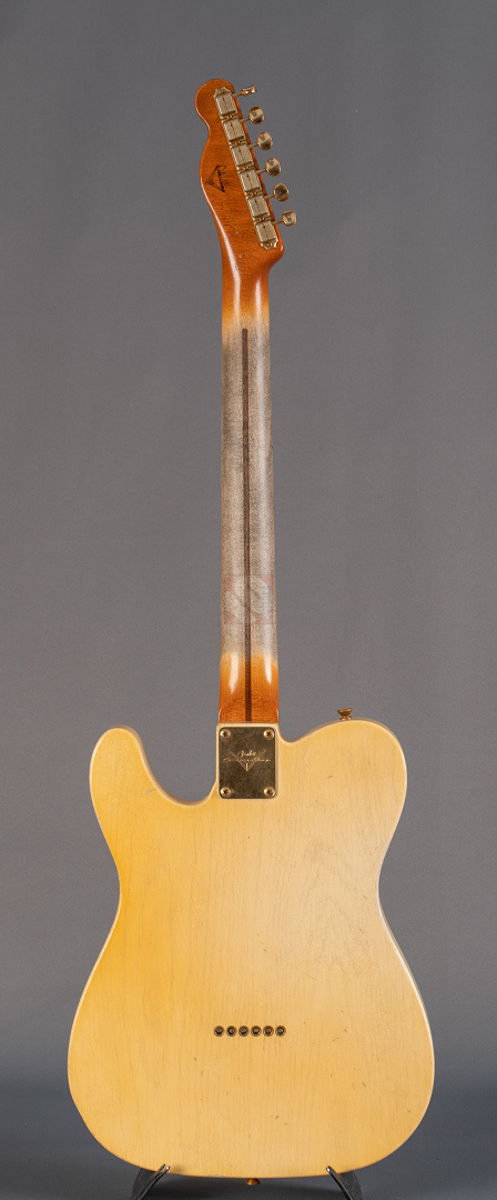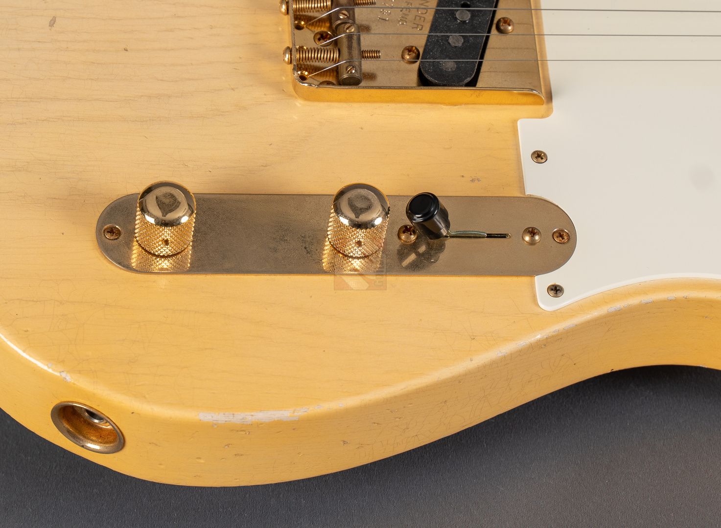 Guitarist Mary Kaye is actually known for her white-blonde Stratocaster with gold-colored hardware. Since this special look is still very popular today Wildwood Guitars regularly commissions different masterbuilders—in this case Dale Wilson—to create a corresponding Telecaster interpretation. And if you're looking for a Tele with ultimate playability and an absolutely killer sound, ...there it is! This '55 Telecaster deserves full marks in every category. With its unvarnished neck back, super comfortable “10/56V” profile and a dream weight of only 2790 grams(!) this guitar plays simply fantastic. Thanks to perfectly dressed Narrow/Tall frets and the characteristic 10" fretboard radius you'll fly across the fretboard. And then there's the sound! Already very loud, resonant, and direct when played dry, it shines so brightly through the amp that you'll never want to pick up another Tele again. This is ensured by two “Handwound WW10 Twisted Tele” pickups, which can be wonderfully bell-like and full, but also extremely concise and aggressive, not to say “dirty” when needed. This soundmighty Tele really has everything you could wish for in terms of sound. Super attack, sparkling, wiry, twangy, without ever sounding thin... that's exactly how a Tele should be! And the look speaks for itself. The Journeyman-reliced finish in “Faded Dirty White Blonde” enchants with its characteristic soft beige tone, which perfectly showcases the famous grain of the specially selected ash wood. Above all, however, the ingenious color shades immediately catch the eye, which together with the beautifully aged gold hardware result in a fabulous vintage look. The white-aged pickguard is a perfect match. As always with Wilson guitars, one highlight follows another, and as the icing on the cake the Telecaster also comes including the frets in mint condition to its future owner. Congratulations!