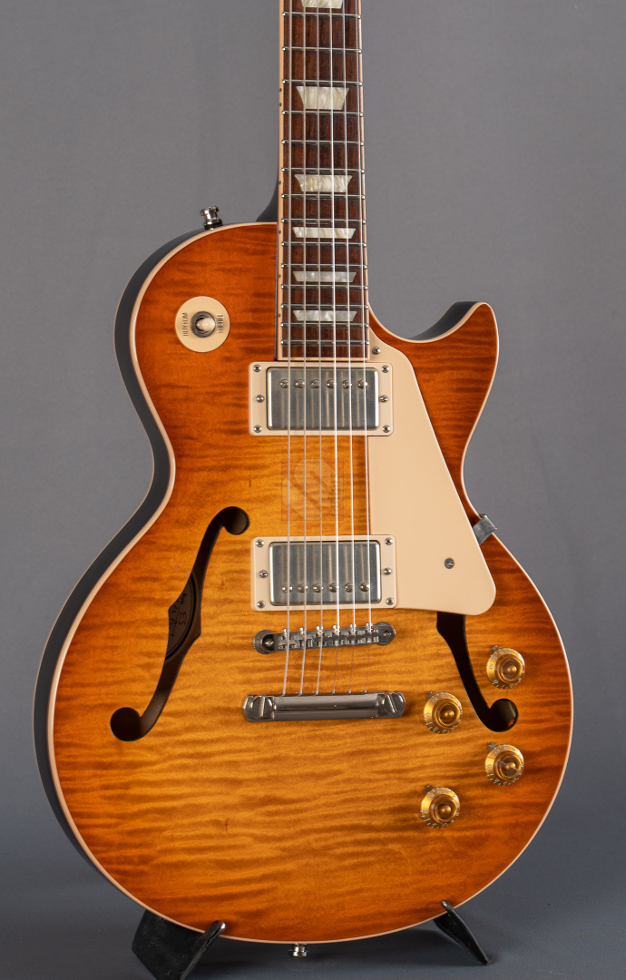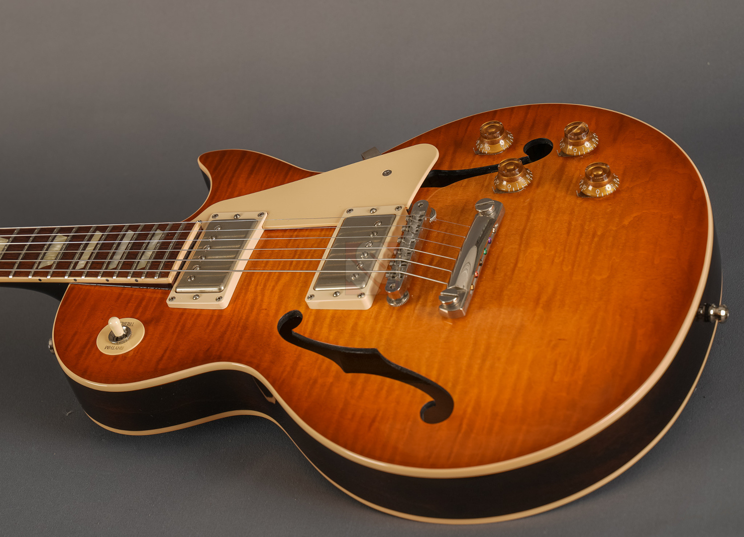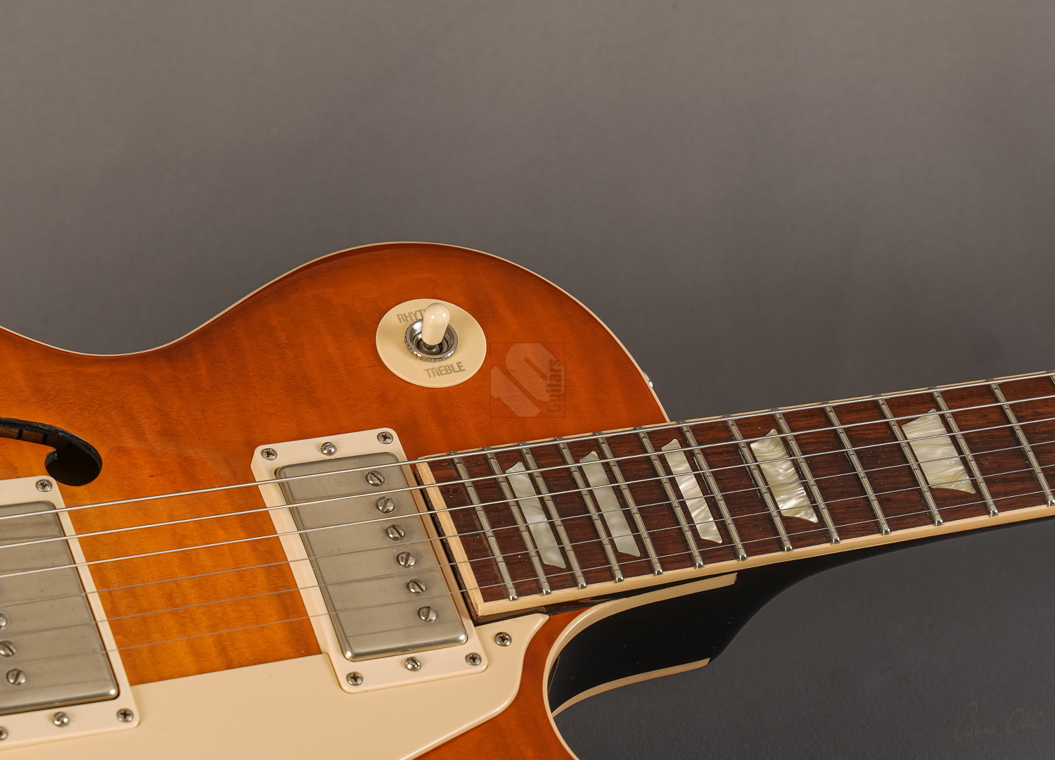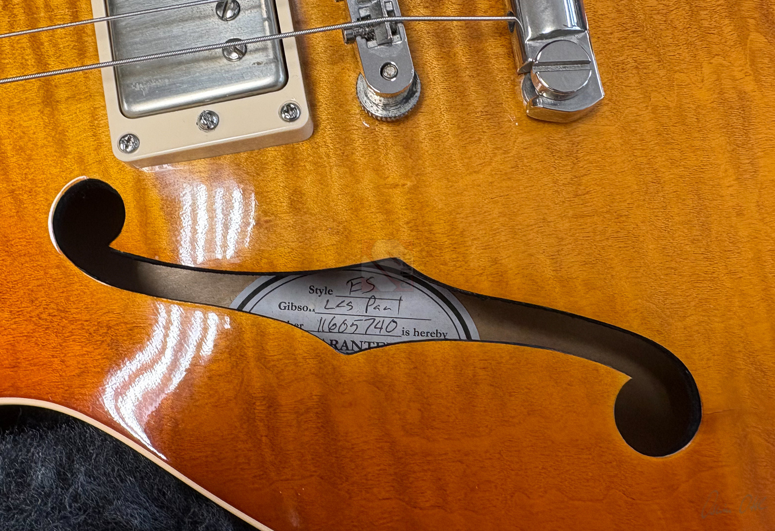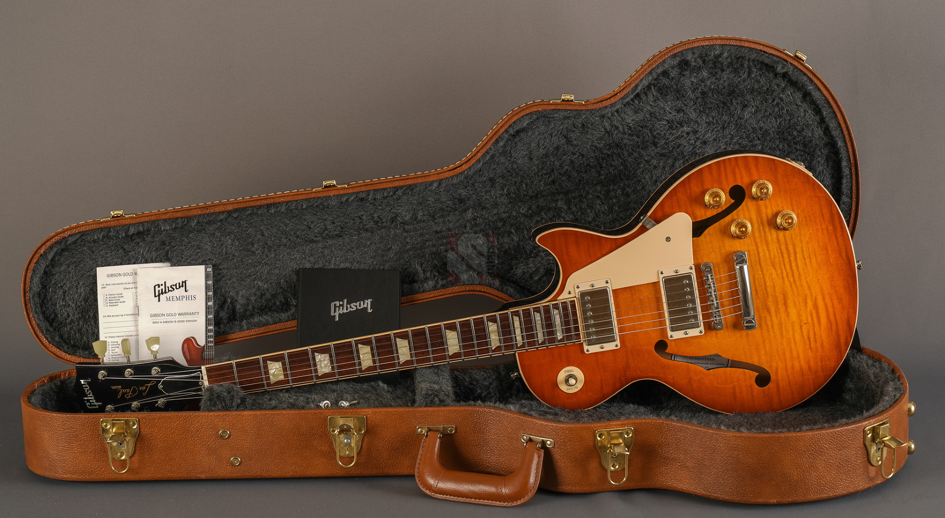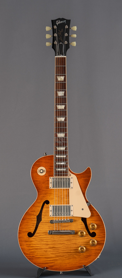 Today we are pleased to offer you a very special guitar from the Gibson Custom Shop in Memphis: an ES Les Paul that beautifully combines the best features of both series. While you will immediately be captivated by the iconic look of a Paula, you can also enjoy the extremely resonant tone of a semi-hollow and its superb light weight. In addition, Gibson's “Memphis Historic Spec” humbuckers, considered among the best PAF clones, have been installed. The neck pickup is warm, transparent, and three-dimensional with clean amp settings, never muddy or indistinct in the bass. Depending on the gain setting the bridge pickup impresses with snap, punch, and smack without ever being too intrusive. Crisp riffs come across just as naturally as chunky chords or fat leads. With the finest double-coil sound lovers of Classic Rock and Blues will feel right at home here. And it's no surprise that this gem is wonderfully comfortable to play thanks to its dream weight of only 2810 grams. The medium neck profile also fits perfectly in the hand and the perfectly dressed frets ensure the very best playing characteristics. We are delighted to be able to offer you this exclusive ES Les Paul except for coherent security locks (original pins included )in original top condition.