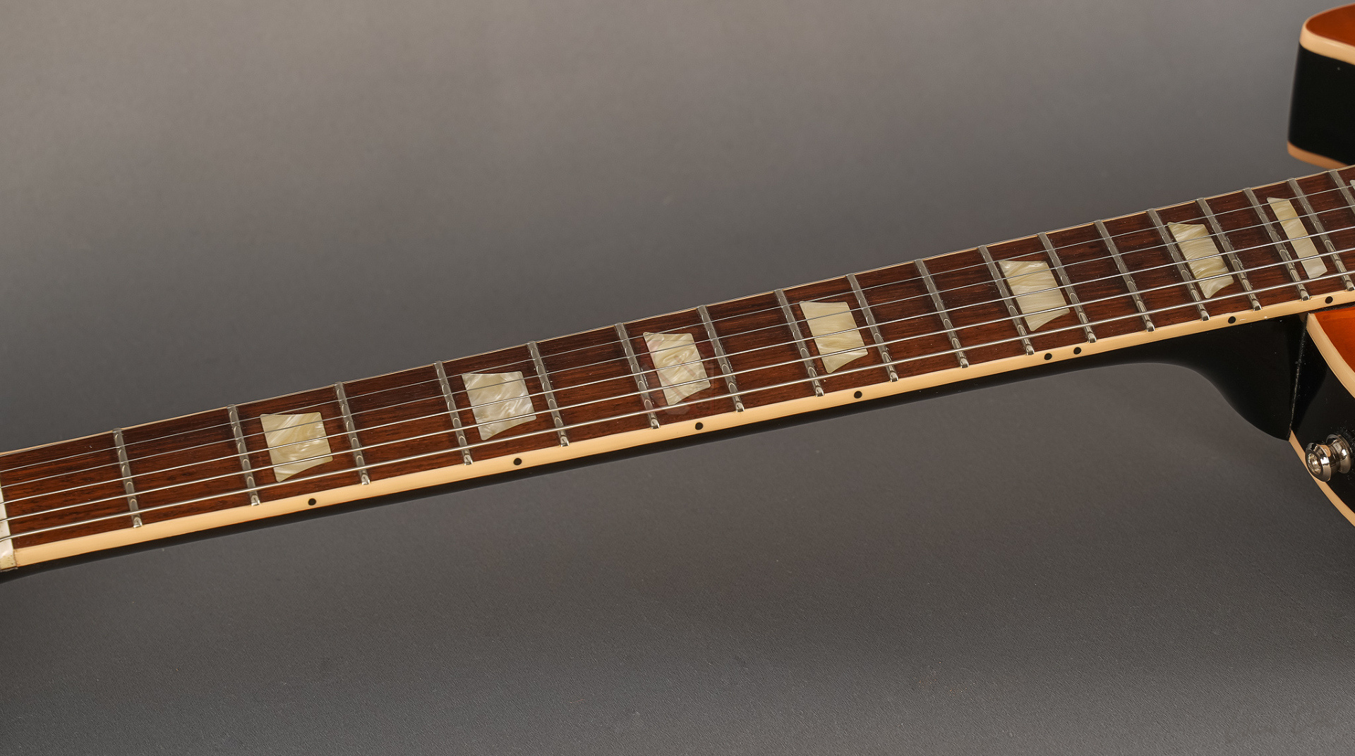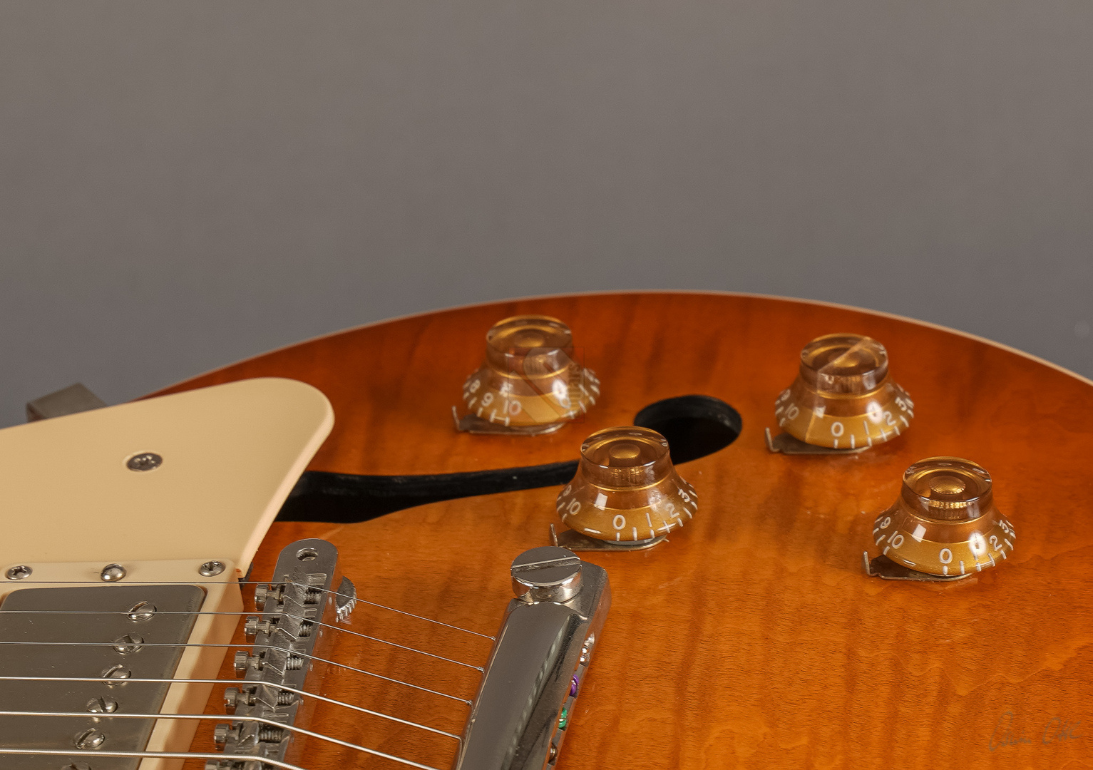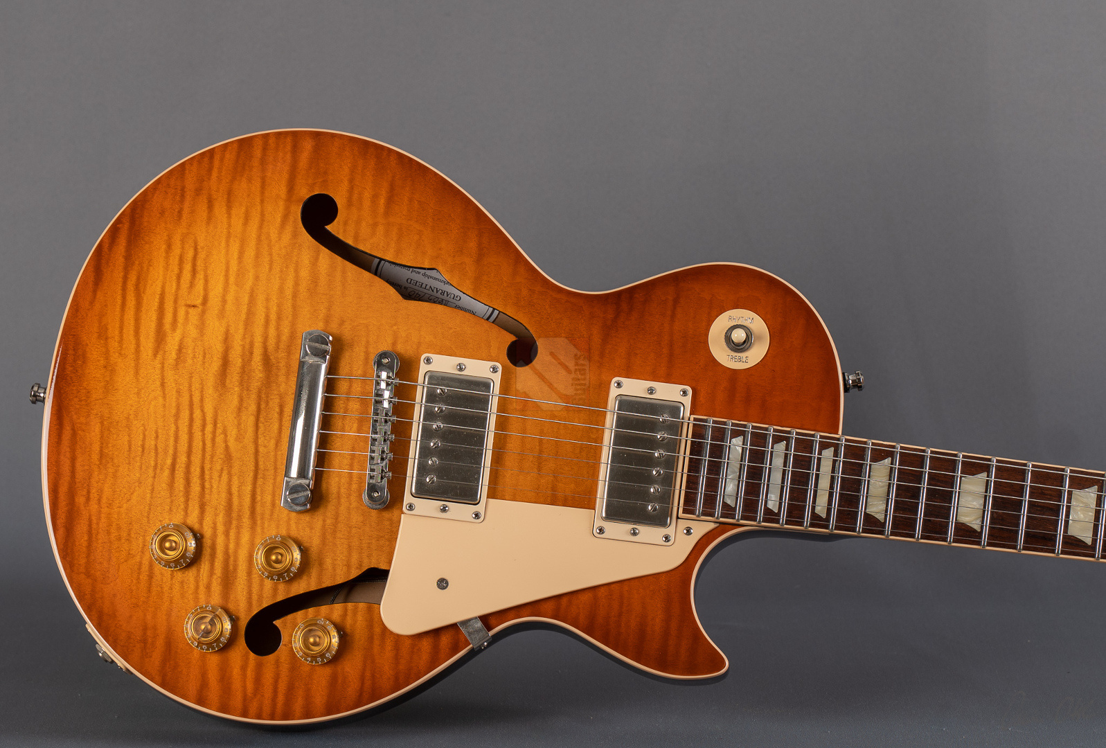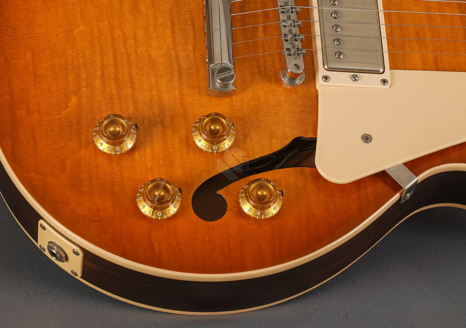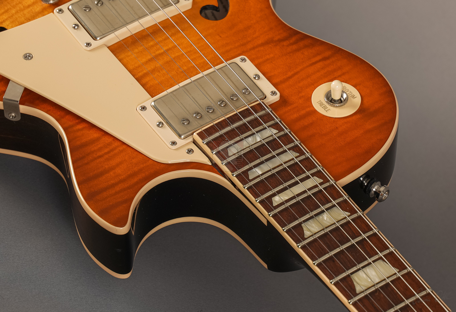 Today we are pleased to offer you a very special guitar from the Gibson Custom Shop in Memphis: an ES Les Paul that beautifully combines the best features of both series. While you will immediately be captivated by the iconic look of a Paula, you can also enjoy the extremely resonant tone of a semi-hollow and its superb light weight. In addition, Gibson's “Memphis Historic Spec” humbuckers, considered among the best PAF clones, have been installed. The neck pickup is warm, transparent, and three-dimensional with clean amp settings, never muddy or indistinct in the bass. Depending on the gain setting the bridge pickup impresses with snap, punch, and smack without ever being too intrusive. Crisp riffs come across just as naturally as chunky chords or fat leads. With the finest double-coil sound lovers of Classic Rock and Blues will feel right at home here. And it's no surprise that this gem is wonderfully comfortable to play thanks to its dream weight of only 2810 grams. The medium neck profile also fits perfectly in the hand and the perfectly dressed frets ensure the very best playing characteristics. We are delighted to be able to offer you this exclusive ES Les Paul except for coherent security locks (original pins included )in original top condition.