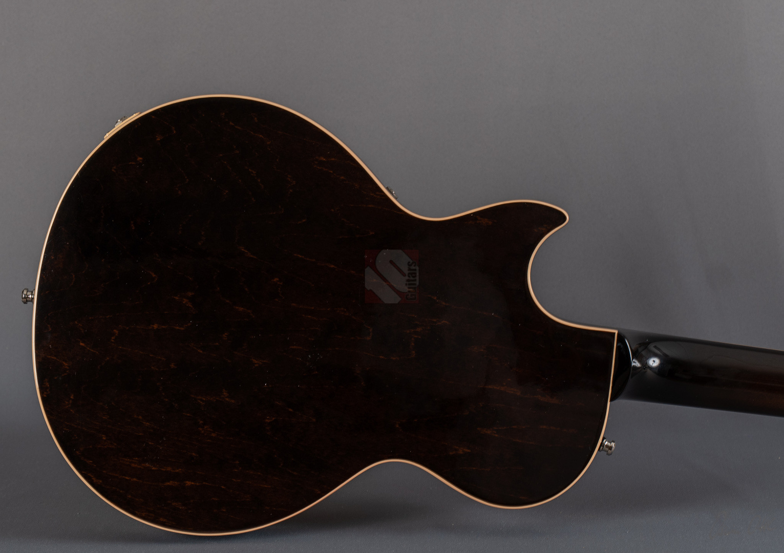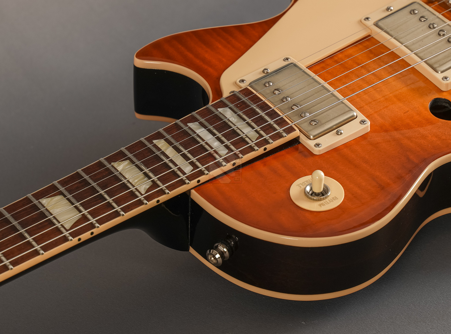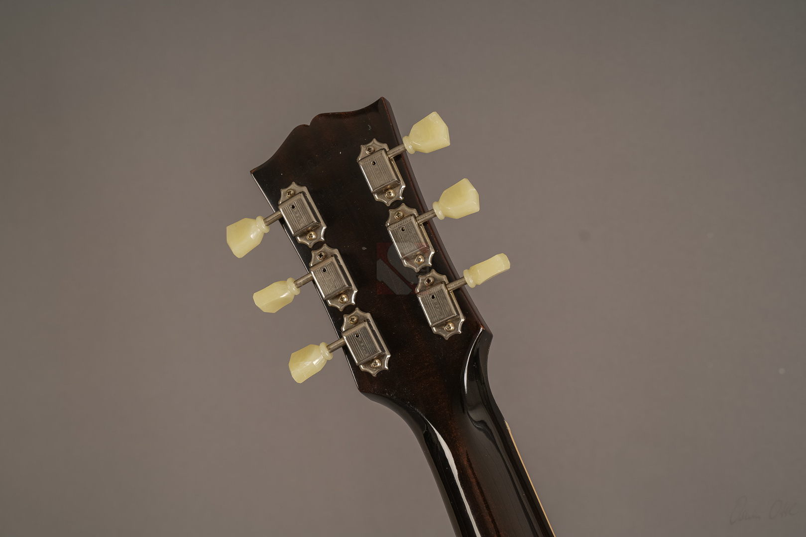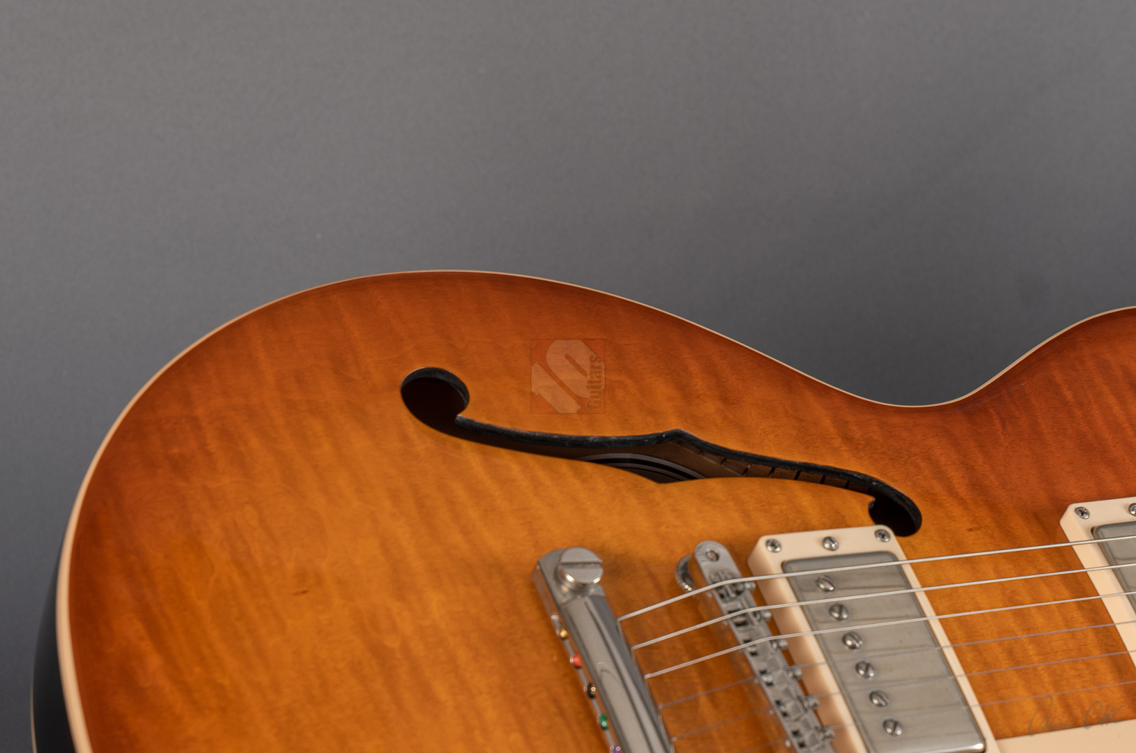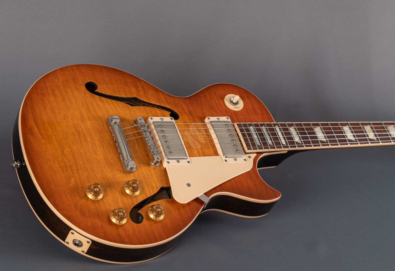 Today we are pleased to offer you a very special guitar from the Gibson Custom Shop in Memphis: an ES Les Paul that beautifully combines the best features of both series. While you will immediately be captivated by the iconic look of a Paula, you can also enjoy the extremely resonant tone of a semi-hollow and its superb light weight. In addition, Gibson's “Memphis Historic Spec” humbuckers, considered among the best PAF clones, have been installed. The neck pickup is warm, transparent, and three-dimensional with clean amp settings, never muddy or indistinct in the bass. Depending on the gain setting the bridge pickup impresses with snap, punch, and smack without ever being too intrusive. Crisp riffs come across just as naturally as chunky chords or fat leads. With the finest double-coil sound lovers of Classic Rock and Blues will feel right at home here. And it's no surprise that this gem is wonderfully comfortable to play thanks to its dream weight of only 2810 grams. The medium neck profile also fits perfectly in the hand and the perfectly dressed frets ensure the very best playing characteristics. We are delighted to be able to offer you this exclusive ES Les Paul except for coherent security locks (original pins included )in original top condition.