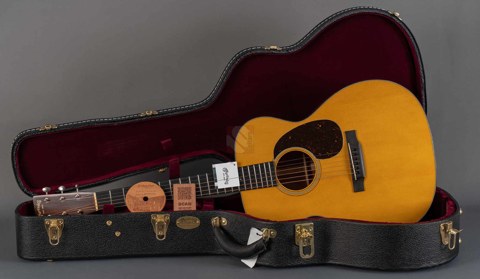 We are pleased to offer you a 000-18 Authentic 1937 from the Martin Custom Shop. This acoustic guitar combines the beloved sound and comfortable feel of historical acoustic models with today's demands for practicality. The 1937 models still serve as cornerstones of guitar making and continue to set standards for acoustic guitar sounds. Based on these originals this 000-18 from Martin was crafted with a body made of solid premium-selection mahogany with all hide-glue joints, a thin Adirondack spruce top for perfect resonance and the authentic finish of the 1937 models. To meet modern expectations the guitar has been given an adjustable truss rod as its only modern update, allowing for individual adjustments according to personal preferences. The "Authentic 1937 Standard Taper" neck profile feels incredibly comfortable in the hand, making you want to strum across the deep, dark, solid ebony fretboard with pure joy. The 000-18's appearance is particularly stunning: classic Martin with beautiful "Brown Tortoise Pattern" binding, "Old Style 18 1937" abalone fretboard inlays and an attractive "Old Style 18 MultiStripe" rosette. The authentic vintage look is achieved primarily through the aged vintage gloss finish, which thanks to the use of vintage toner and a patented, authentic lacquer formula gives this guitar a wonderfully matte finish. "Stage 1 Aging" means that you'll certainly see the signs of age in the form of countless hairline cracks, but without any additional damage. But what always interests us most, of course, is the sound of this magnificent instrument. Due to its smaller body size compared to a dreadnought it's more responsive and very well-suited for fingerpicking. And here, it truly delivers! Although the guitar is wonderfully manageable it boasts a magnificent bass foundation. A great frequency spectrum and beautifully balanced. Voluminous, assertive with plenty of warmth, extremely articulate, present and with the warm, woody, and dry tone characteristic of mahogany, featuring punchy mids. It's not only suitable for fingerpicking, but this acoustic guitar also impresses with its superb strengths when strumming. We can offer you the guitar in mint condition.