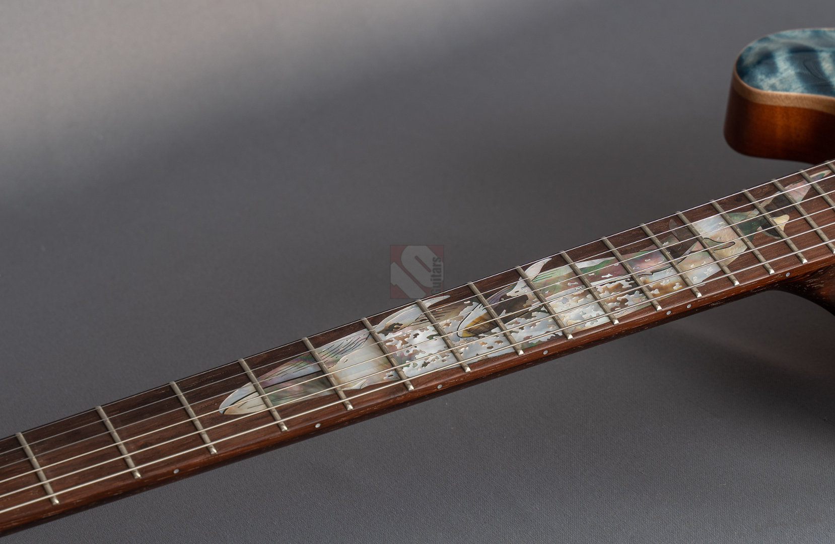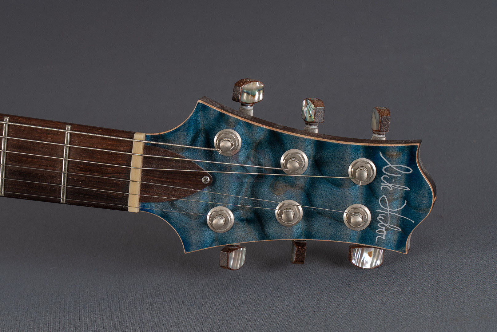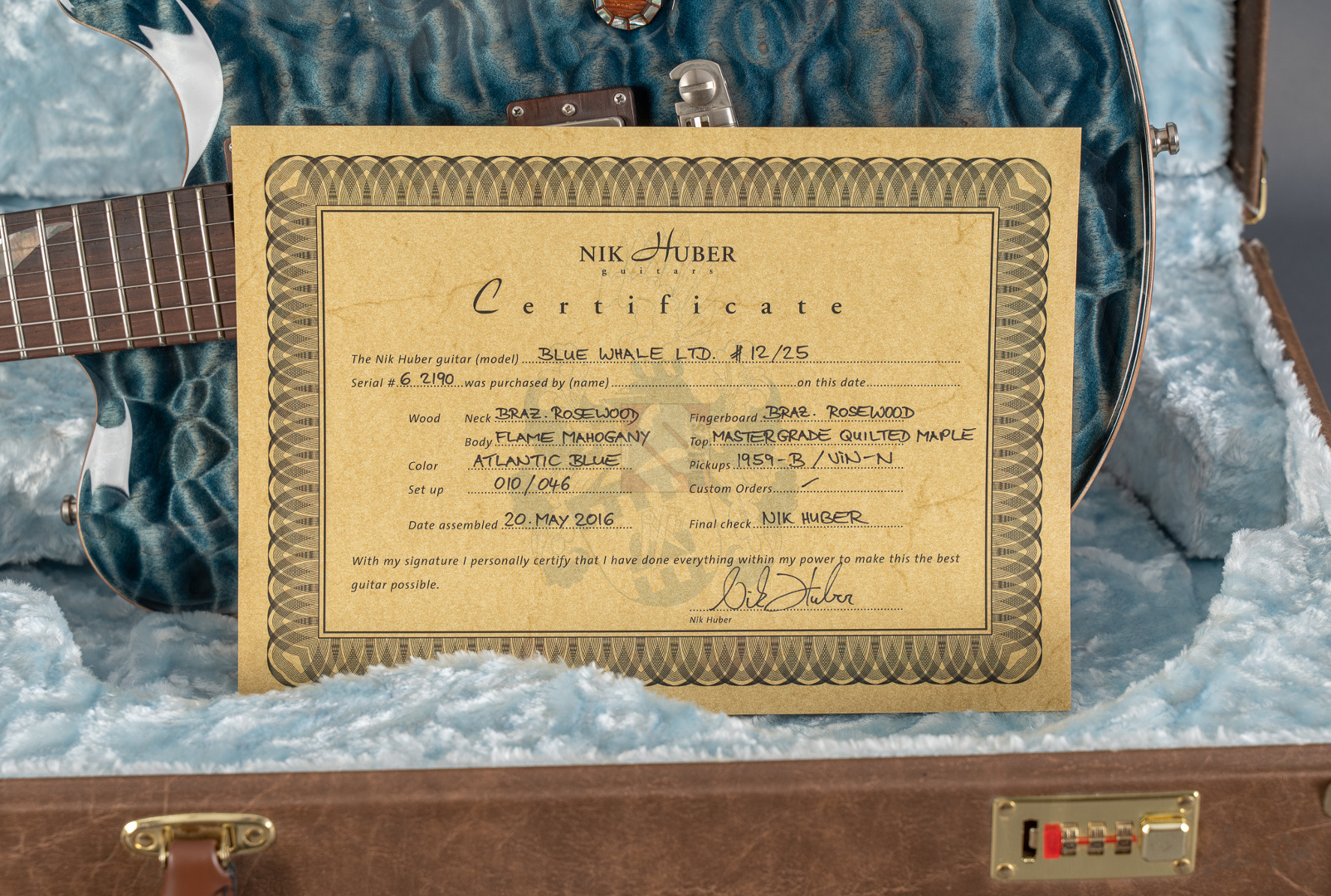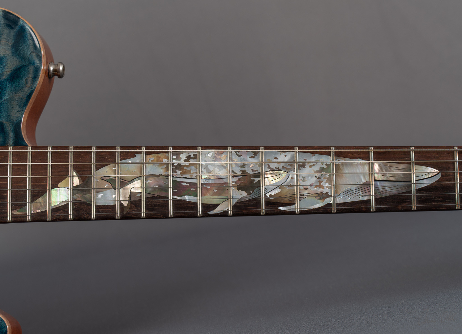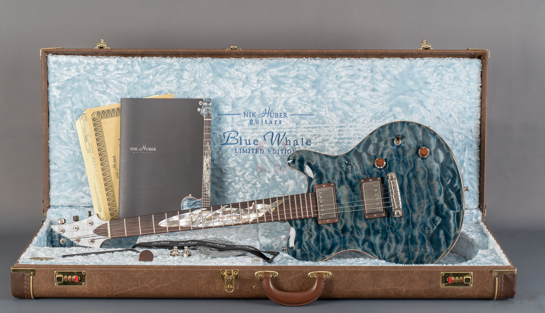 Nik Huber has established himself as one of the most talented guitar makers of his generation. He founded his workshop in 1996 and has since redefined the level of perfection associated with the coveted term “Boutique Guitar.” His models are named after marine mammals, such as Orca and Dolphin. ...or even “Blue Whale” like the fabulous gem we are offering you today. Certainly one of the most beautiful, best and most spectacular guitars currently available for purchase. This instrument is truly superlative in every way, starting with an incredibly beautiful one-piece quilted maple top with a maximum three-dimensional effect in "Ocean Blue", to a figured mahogany body and a complete(!) neck and various components made out of Brazilian rosewood (of course with the necessary CITES certification). But the visual highlight is undoubtedly the phenomenal blue whale inlay on the fretboard. It doesn't get any better than this! The Dolphin-based “Blue Whale” features pickups from H. Häussel (Neck: VIN, Bridge: 1959), which as expected were inspired by original PAFs. Fantastic clean sound, super round and balanced with pleasant warmth. Always beautifully sparkling and nuanced, but also distorted and bluesy — simply an absolutely top-notch sound! Lots of character and you can work with the touch sensitivity really well. Also perfect for singing lead sounds with enormous expression! The fact that the playing characteristics are also above average and that the proceeds from this instrument were donated to the rescue of the largest marine mammals is really just a pleasant side note to this exclusive package. The guitar is including the frets in top condition.