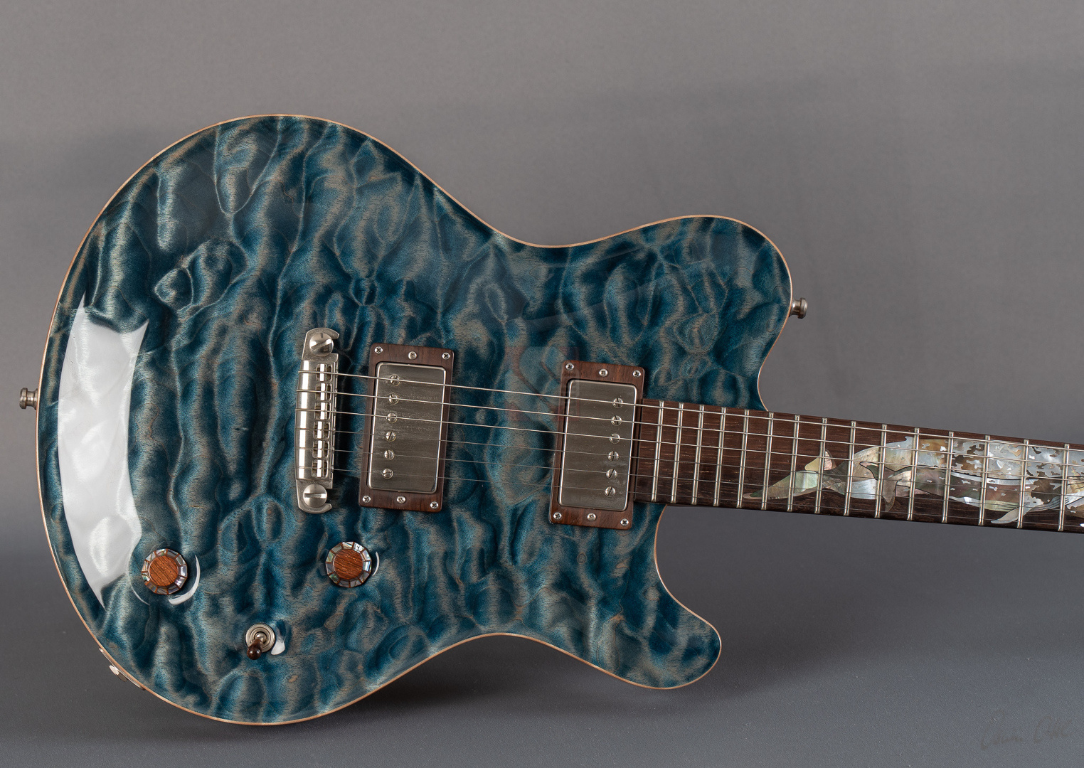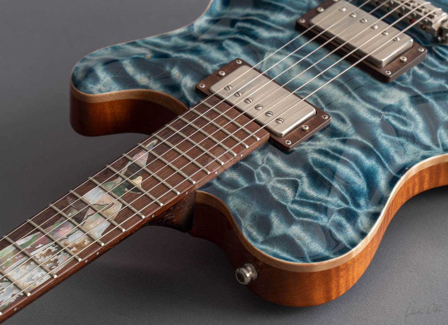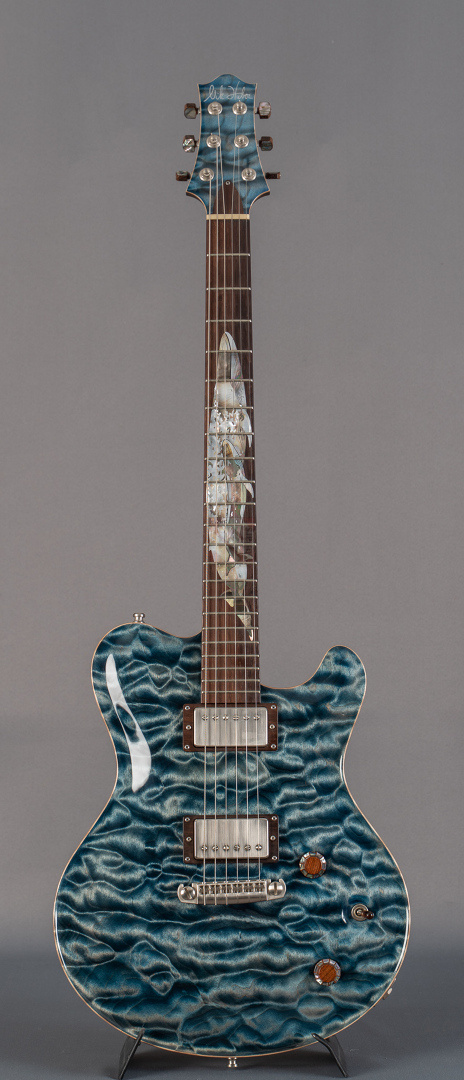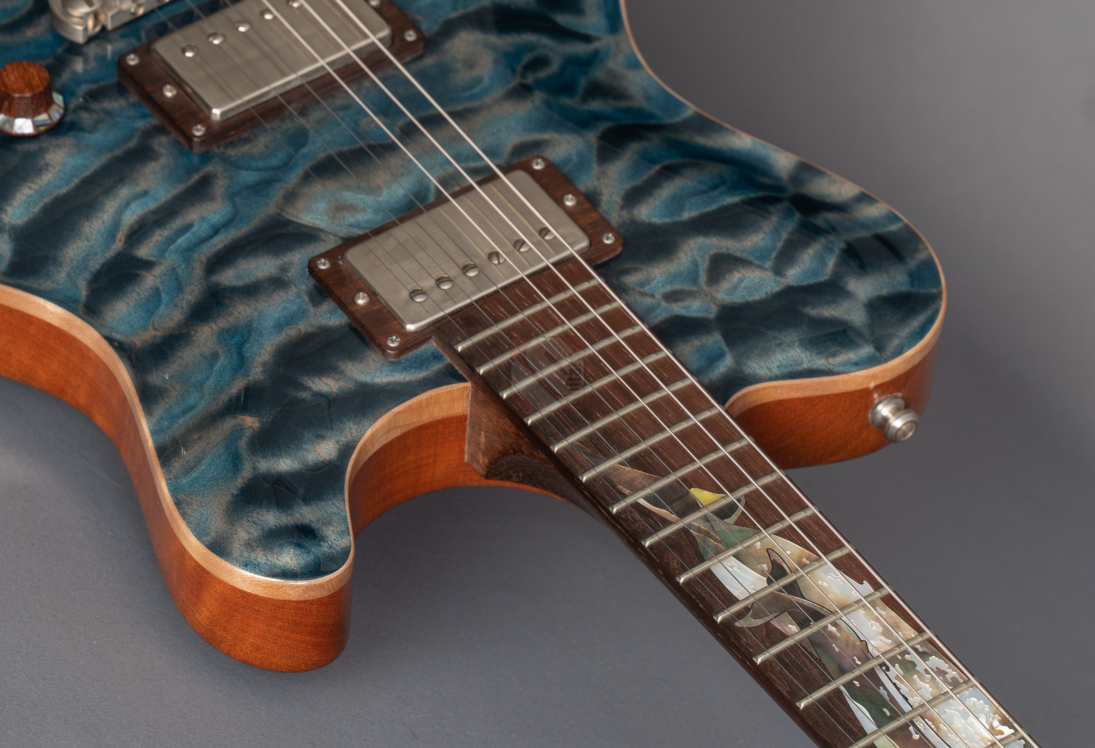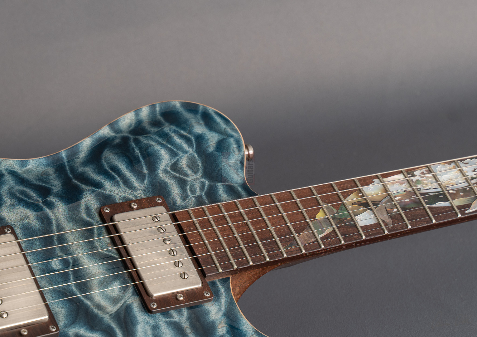 Nik Huber has established himself as one of the most talented guitar makers of his generation. He founded his workshop in 1996 and has since redefined the level of perfection associated with the coveted term “Boutique Guitar.” His models are named after marine mammals, such as Orca and Dolphin. ...or even “Blue Whale” like the fabulous gem we are offering you today. Certainly one of the most beautiful, best and most spectacular guitars currently available for purchase. This instrument is truly superlative in every way, starting with an incredibly beautiful one-piece quilted maple top with a maximum three-dimensional effect in "Ocean Blue", to a figured mahogany body and a complete(!) neck and various components made out of Brazilian rosewood (of course with the necessary CITES certification). But the visual highlight is undoubtedly the phenomenal blue whale inlay on the fretboard. It doesn't get any better than this! The Dolphin-based “Blue Whale” features pickups from H. Häussel (Neck: VIN, Bridge: 1959), which as expected were inspired by original PAFs. Fantastic clean sound, super round and balanced with pleasant warmth. Always beautifully sparkling and nuanced, but also distorted and bluesy — simply an absolutely top-notch sound! Lots of character and you can work with the touch sensitivity really well. Also perfect for singing lead sounds with enormous expression! The fact that the playing characteristics are also above average and that the proceeds from this instrument were donated to the rescue of the largest marine mammals is really just a pleasant side note to this exclusive package. The guitar is including the frets in top condition.