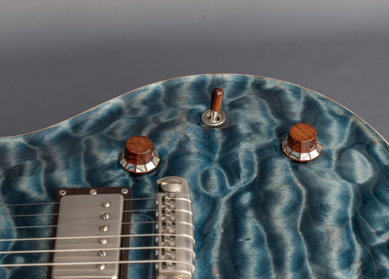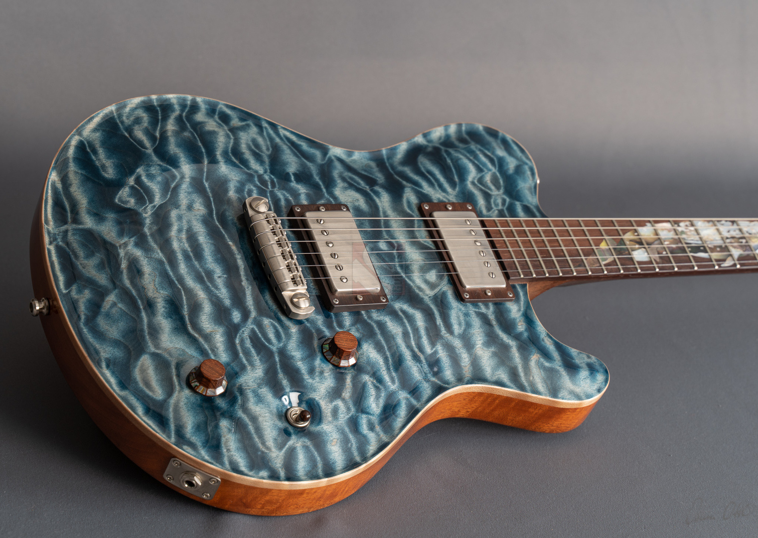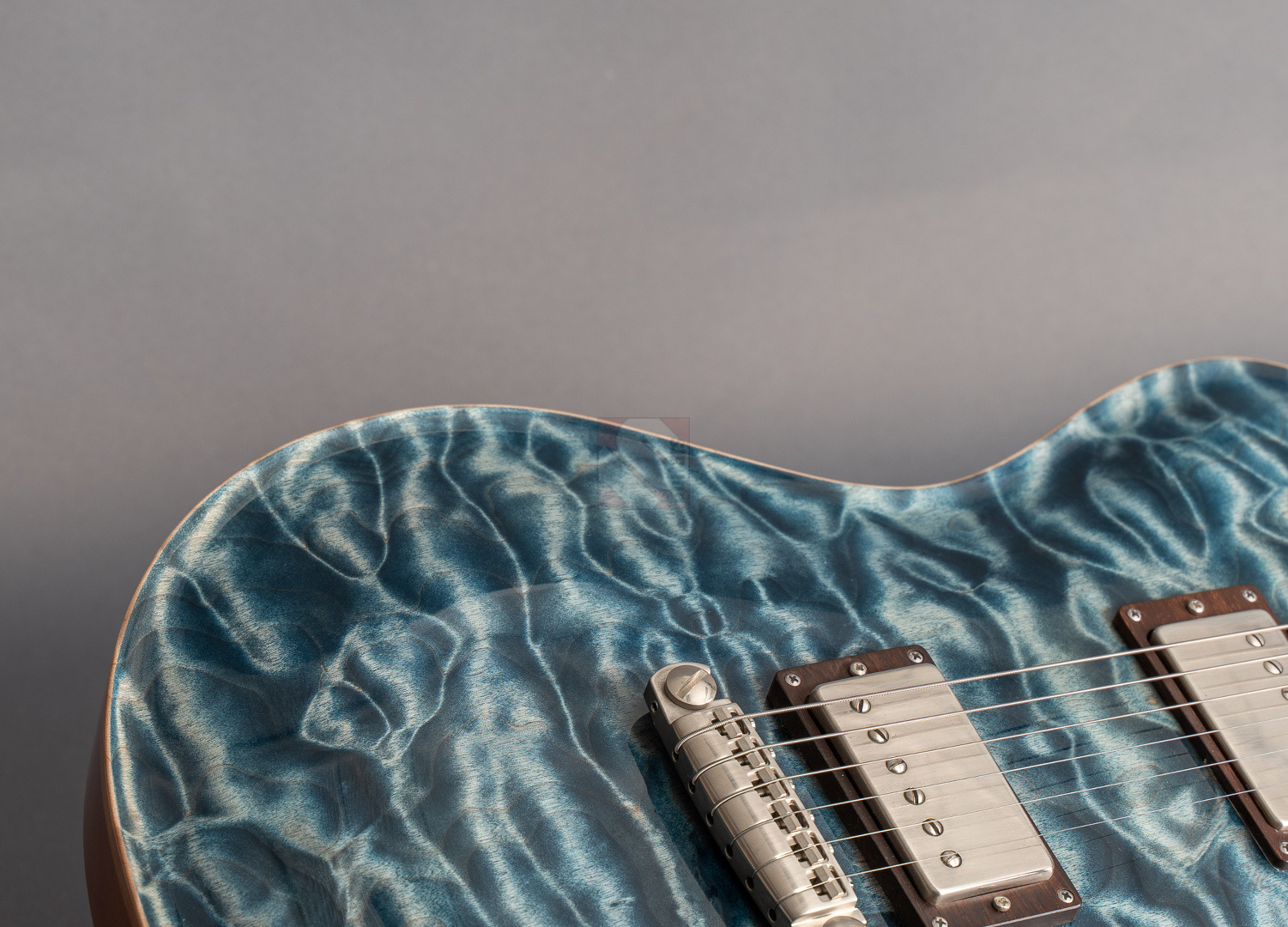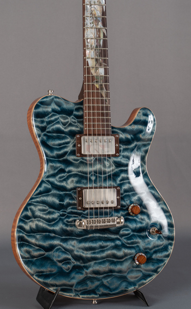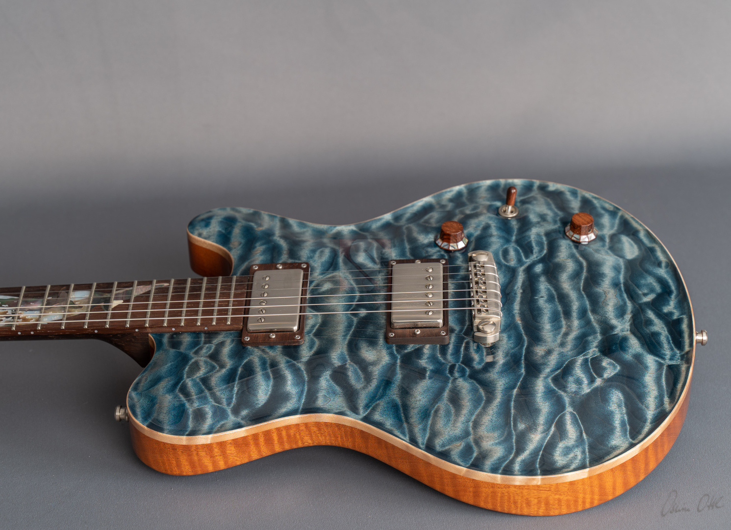 Nik Huber has established himself as one of the most talented guitar makers of his generation. He founded his workshop in 1996 and has since redefined the level of perfection associated with the coveted term “Boutique Guitar.” His models are named after marine mammals, such as Orca and Dolphin. ...or even “Blue Whale” like the fabulous gem we are offering you today. Certainly one of the most beautiful, best and most spectacular guitars currently available for purchase. This instrument is truly superlative in every way, starting with an incredibly beautiful one-piece quilted maple top with a maximum three-dimensional effect in "Ocean Blue", to a figured mahogany body and a complete(!) neck and various components made out of Brazilian rosewood (of course with the necessary CITES certification). But the visual highlight is undoubtedly the phenomenal blue whale inlay on the fretboard. It doesn't get any better than this! The Dolphin-based “Blue Whale” features pickups from H. Häussel (Neck: VIN, Bridge: 1959), which as expected were inspired by original PAFs. Fantastic clean sound, super round and balanced with pleasant warmth. Always beautifully sparkling and nuanced, but also distorted and bluesy — simply an absolutely top-notch sound! Lots of character and you can work with the touch sensitivity really well. Also perfect for singing lead sounds with enormous expression! The fact that the playing characteristics are also above average and that the proceeds from this instrument were donated to the rescue of the largest marine mammals is really just a pleasant side note to this exclusive package. The guitar is including the frets in top condition.