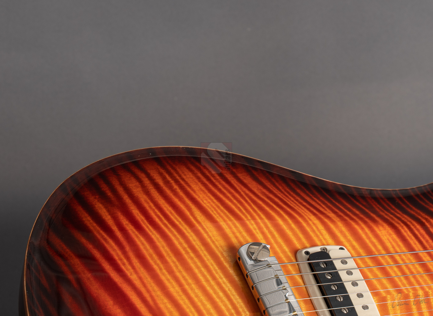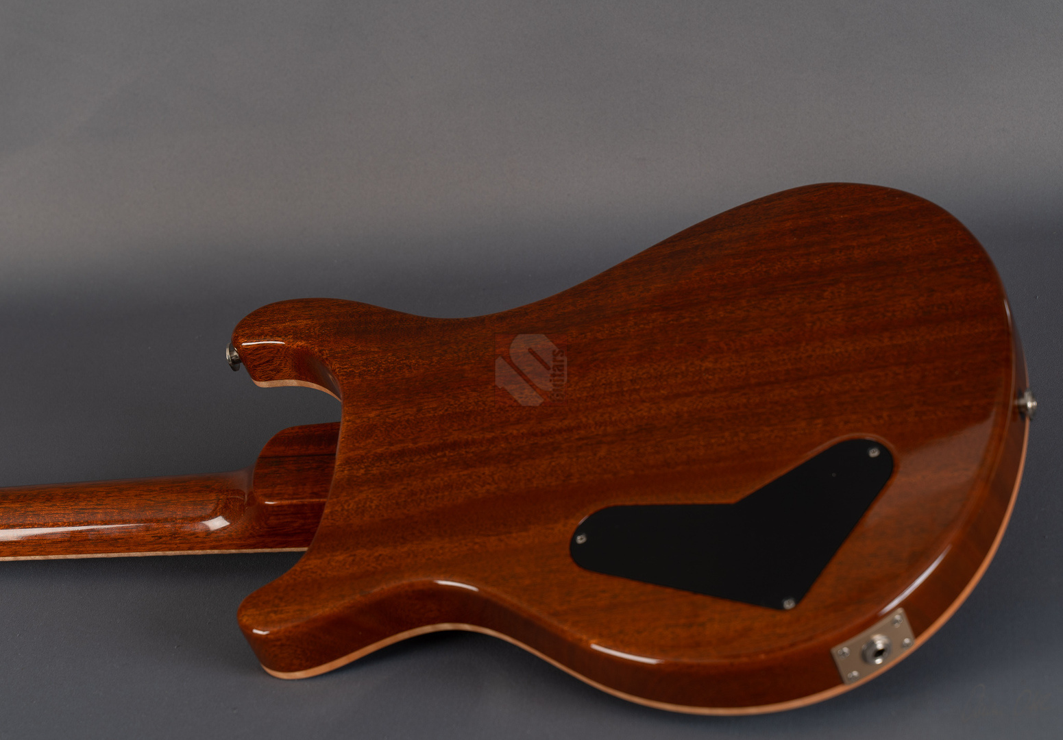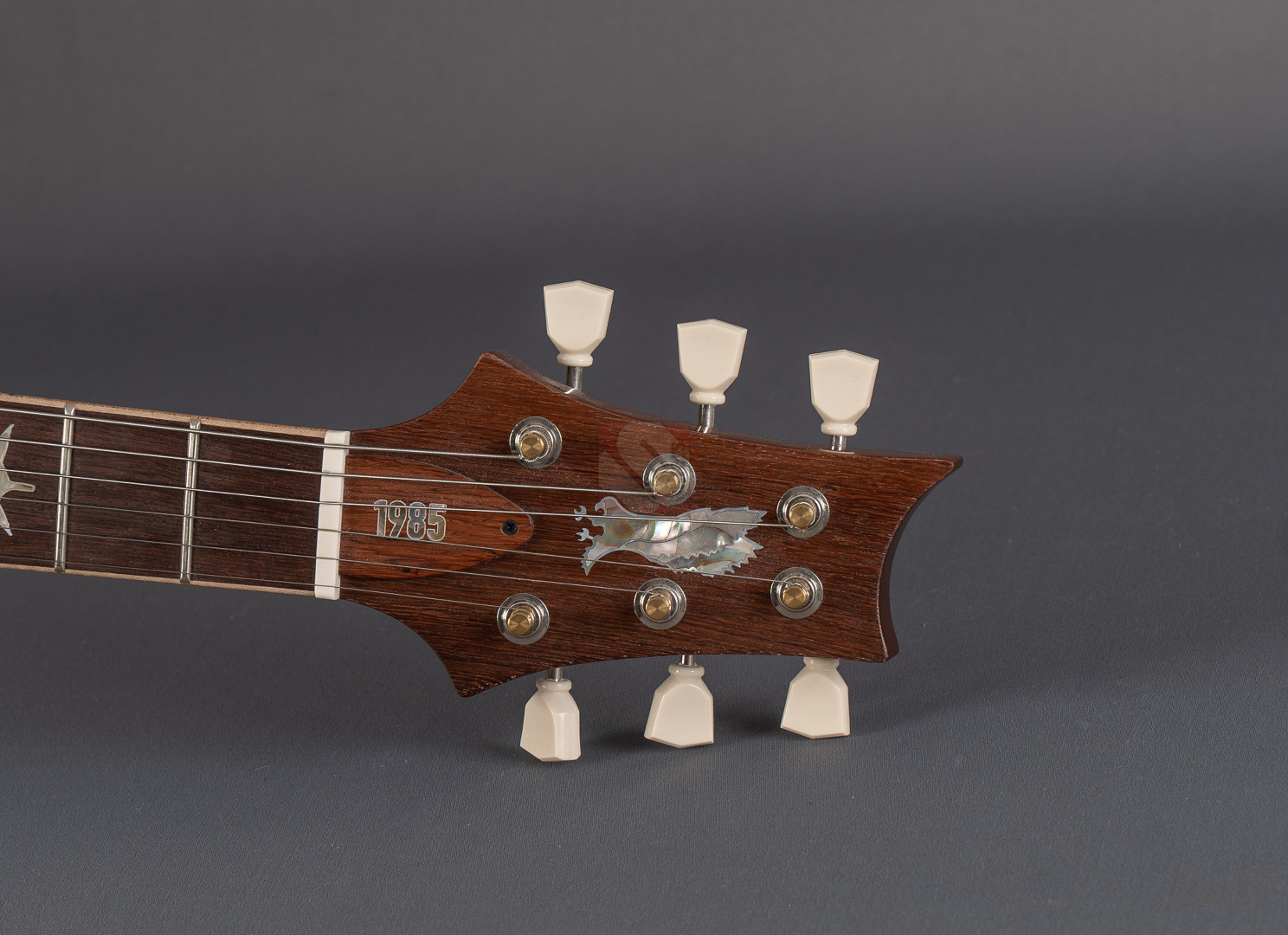 The boss himself was responsible for this very special collector's model from PRS: Paul Reed Smith reserved 85 maple tops for the Paul's 85 guitars and also selected the remaining woods for the strictly limited series of 85 specimens from PRS' Wood Vault himself. The body is made from African mahogany, the neck from dark Peruvian mahogany and the fingerboard from Honduran rosewood with curly maple binding. The look of the guitar is crowned by a curly maple top in the special color “Electric Tiger Glow”. A special staining and spraying technique is used for this color, which emphasizes the beautiful, wide curly maple enormously, resulting in a phenomenal top grain. The final finish is a special paper-thin high-gloss vintage nitro lacquer with numerous hairline cracks appearing over time to give the guitar a special vintage patina. But since this guitar has spent its time almost unplayed in its case, even these deliberate signs of ageing are hardly noticeable and the guitar will be delivered to its future owner in almost mint condition. The very comfortable Pattern neck profile corresponds exactly to Paul's specifications. Together, this results in a guitar with incredible sustain, a balanced and fresh basic sound and optimum playability. The PRS TCI humbuckers, which can be split into singlecoils on this model with two small toggle switches, provide the transmission to the amp. With these specs it's clear that the guitar also plays in the Champions League in terms of sound. And yet, when you hear the guitar “loud” for the first time you can't help but get excited. The humbuckers deliver a singing, full-bodied tone with just the right “nose” to give it a unique character. With such phenomenal playing and sound characteristics it would certainly be difficult to simply place Paul's 85 in a display case as a collector's item... We are extremely pleased to be able to offer you this beautiful, extremely rare dream guitar in top condition.
