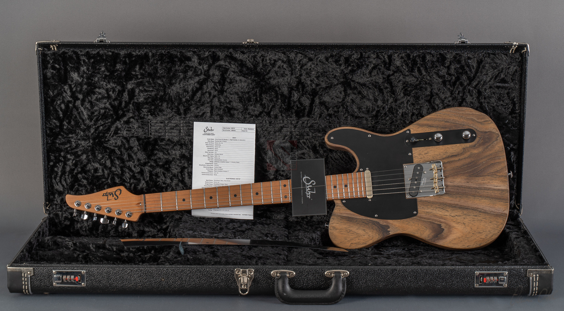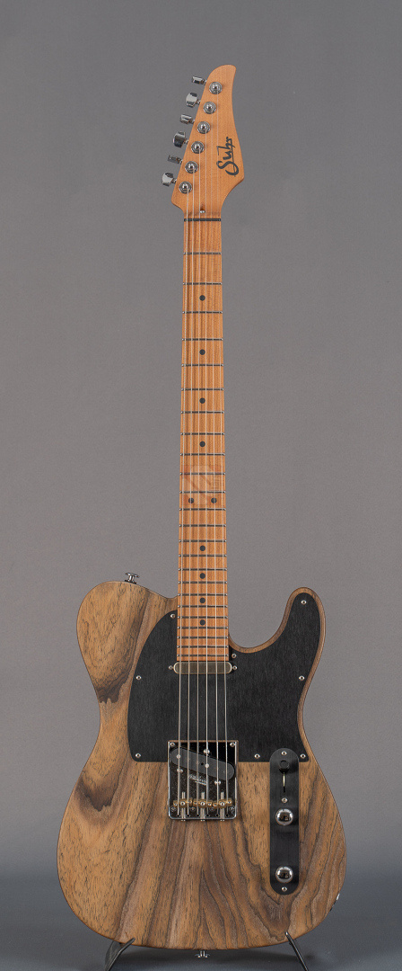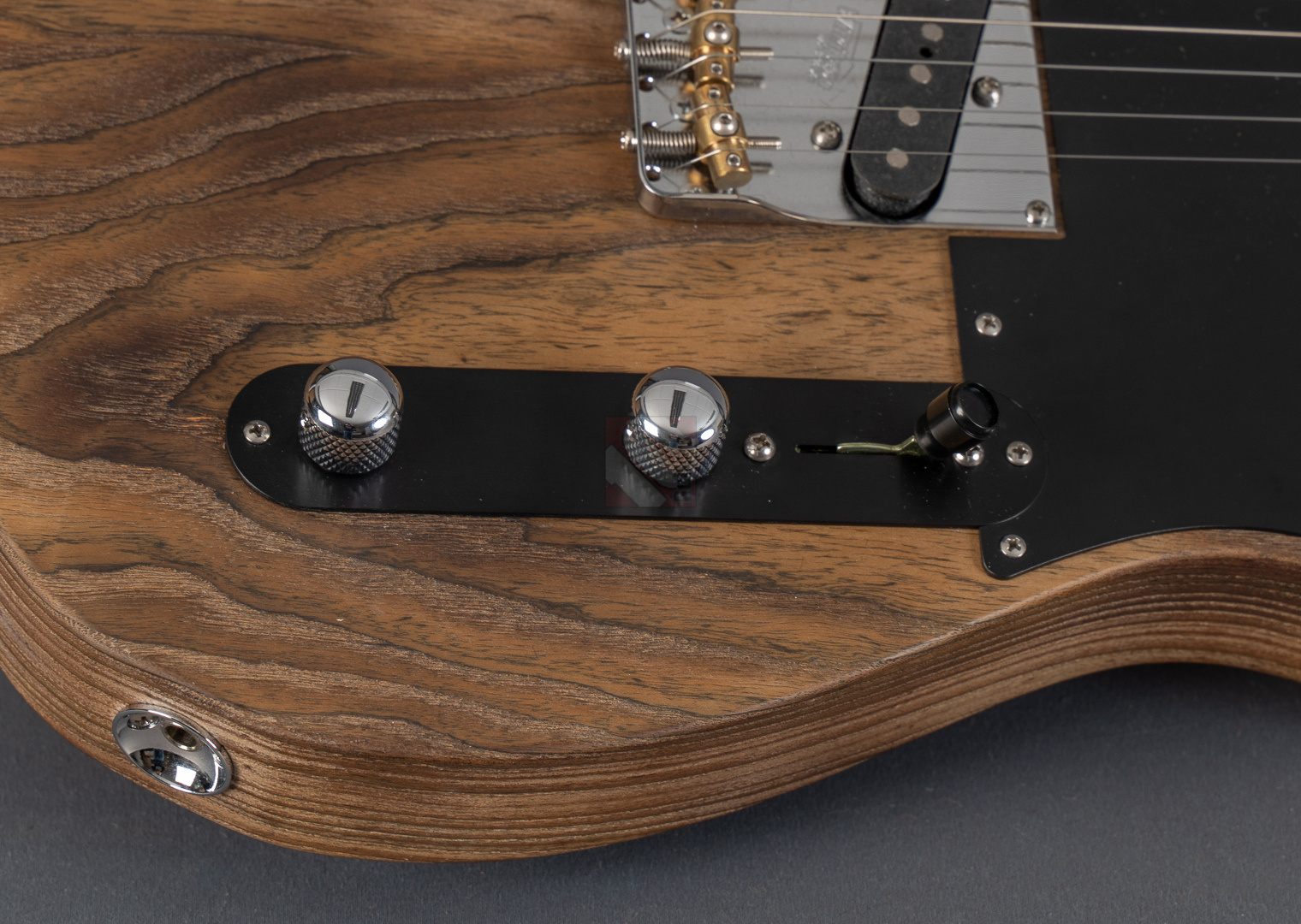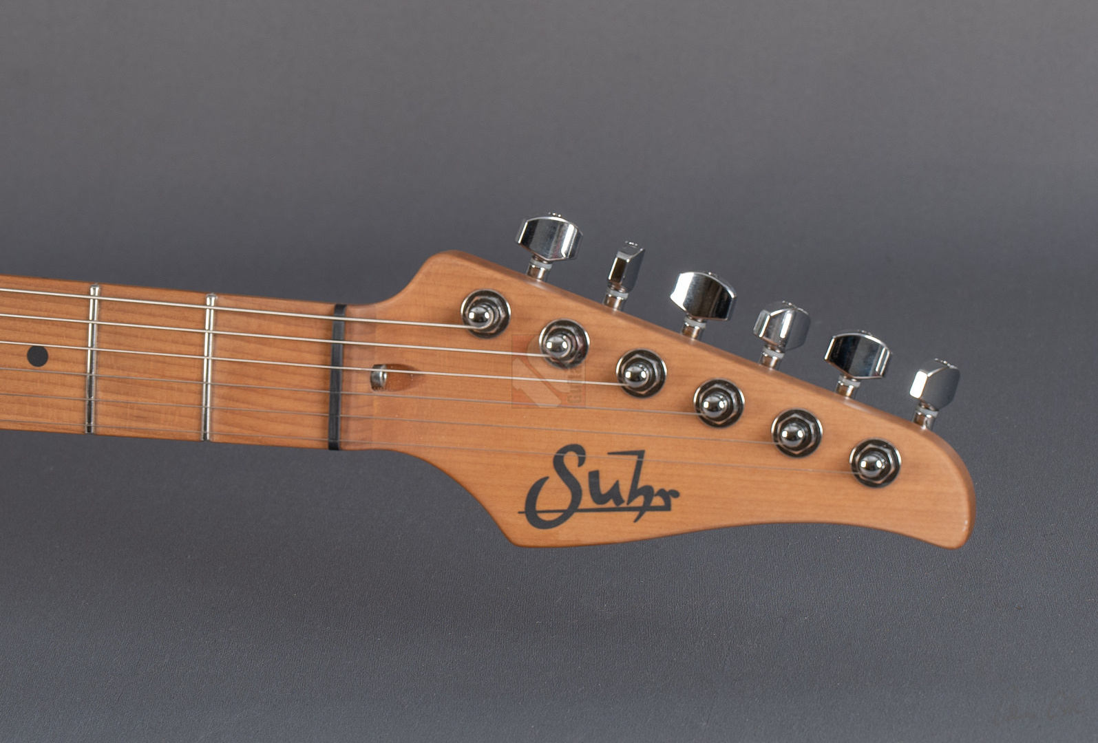 Andy Wood is an American guitarist and mandolinist whose signature series from Suhr consistently produces outstanding instruments. This Modern T, crafted from swamp ash, is no exception, boasting a unique feel thanks to the wood's texture, which is perceptible even beneath the lacquer. This is achieved through a special "Torched Satin" finish, where the body is flamed/burned before lacquering, bringing out and preserving the wood grain. The "Whiskey Barrel" finish also possesses its own distinct charm. The bolt-on neck and fretboard are made of heat-treated roasted maple. 24 Jumbo stainless steel frets adorn the attractive fretboard and together with the "Modern Elliptical" neck profile (.780"-.830") and a 16" fretboard radius they ensure exceptional playability. Furthermore, the two "Woodshed" singlecoil pickups give the instrument the characteristic twang of the T-models and are hum-free thanks to SSCII technology. Warm and bluesy at the neck, assertive at the bridge and never thin or nasal. A superb frequency response, especially with overdriven and distorted sounds! This is simply the ideal workhorse for any musician seeking superior playing comfort combined with fantastic sound and top-notch aesthetics. The guitar is including the frets in top condition.