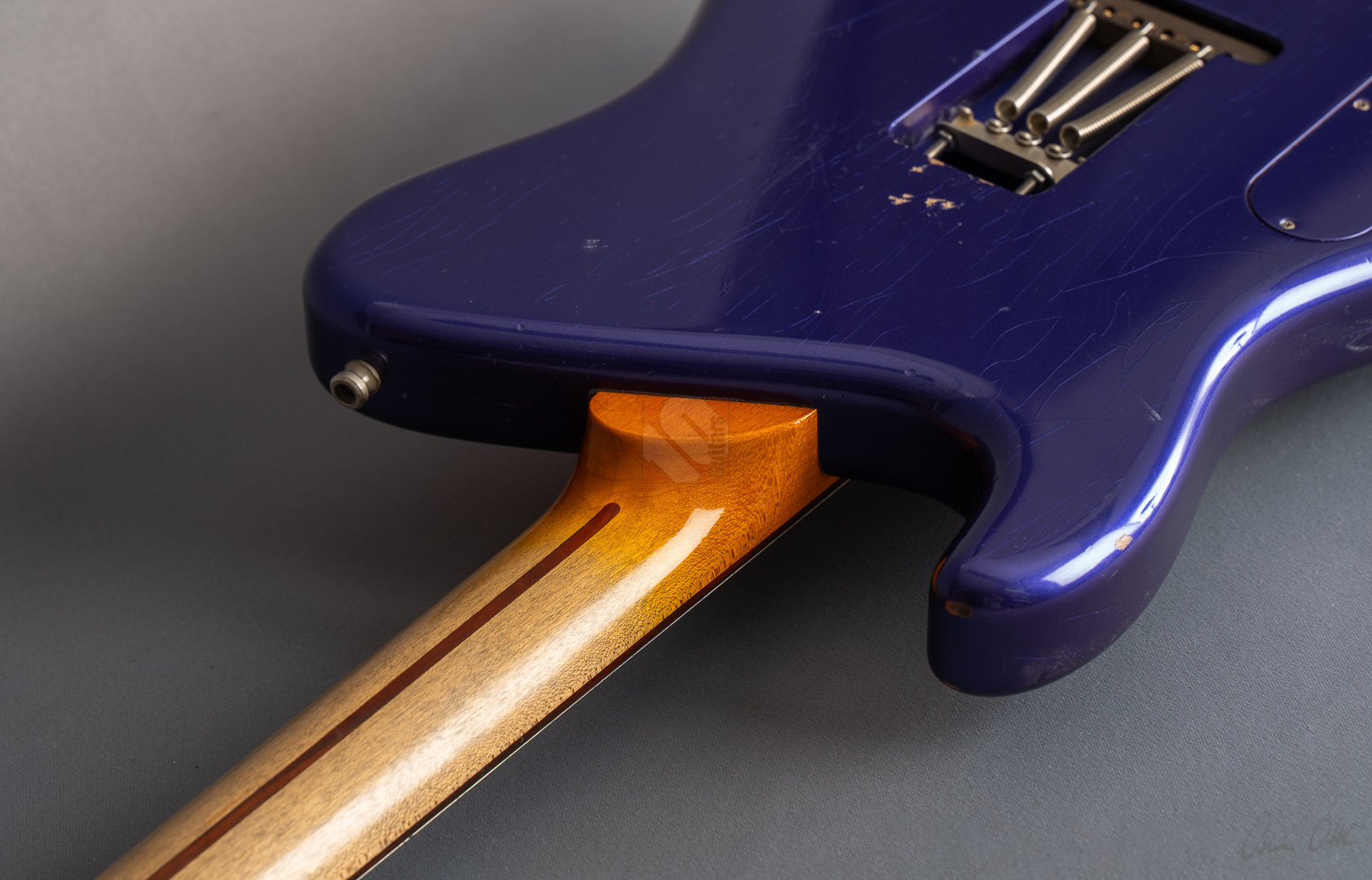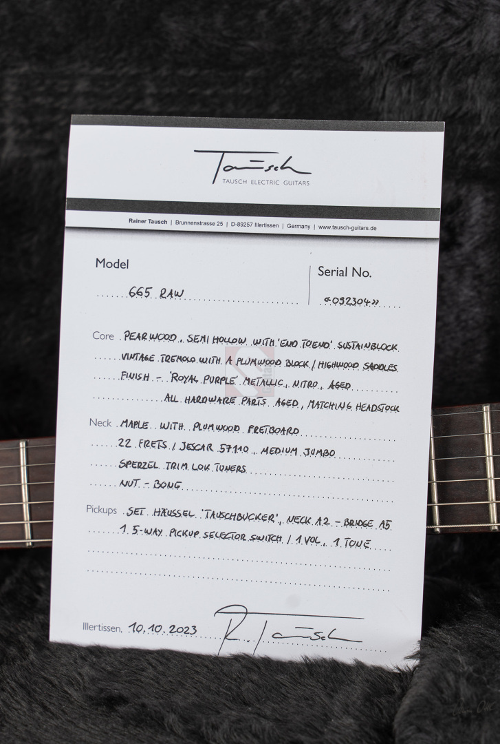 Tausch Guitars was founded in May 1995 and since then guitar aficionados have been enjoying the unique sounds produced by these instruments, which are meticulously and carefully crafted with a focus on the sustainable selection of tonewoods and materials. In this context Rainer Tausch describes on his website that the outstanding characteristics of a 665 Raw can be summarized with the following quality, construction and design features: hand-picked, carefully selected woods, high-quality hardware and electronics, pickups by Harry Häussel, 26 3/16 inch scale length (665 mm), semi-acoustic concept with continuous sustain block and glued neck joint, as well as a straightforward, perfection-oriented design that pays attention to the highest level of craftsmanship down to the smallest detail. The semi-acoustic body is made of pear wood, which gives the 665 – supported by a maple neck – a fundamental and powerful sound with astonishing tonal selectivity. The diversity here is immense as the sound of the two Häussel Tauschbucker pickups can be varied in a wide variety of ways using the 5-way switch. In positions 2 and 4 one coil of the asymmetrically wound humbucker is switched off, but Strat output values are still maintained. This means you can really satisfy any tonal desire, whether you need the typical Strat, Tele or even the characteristic “Tele on steroids” sound of a full-grown Paula. And this exclusive guitar also plays really well thanks to the 9.5-12.5'' compound radius, 22 speedy Medium Jumbo frets and the comfortable C-shaped neck profile. The fact that the guitar also looks extremely good with its exclusive “Royal Purple Metallic” finish and aged finish is just a pleasant side note for this top-of-the-line instrument. The Raw 665 is in top condition.
