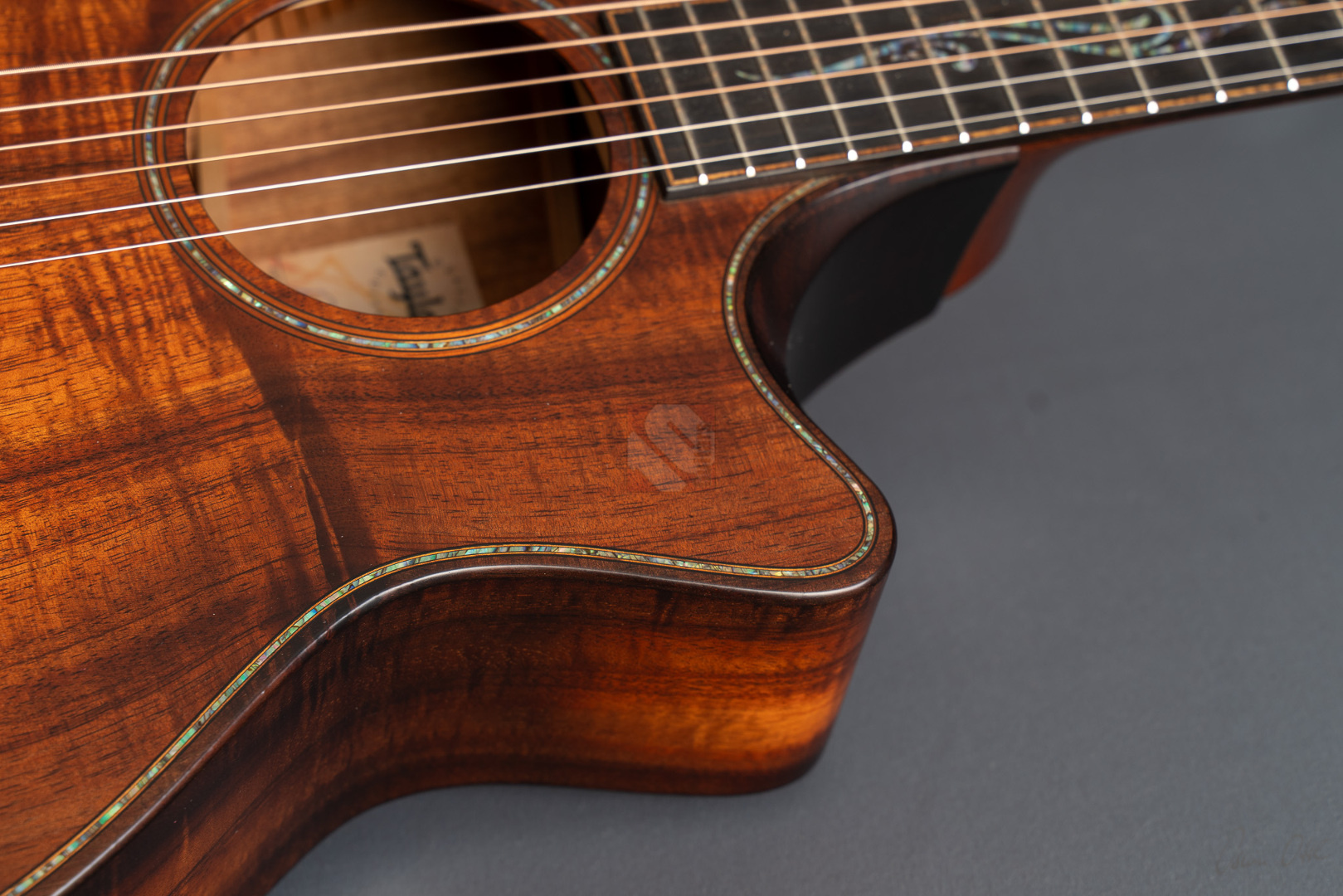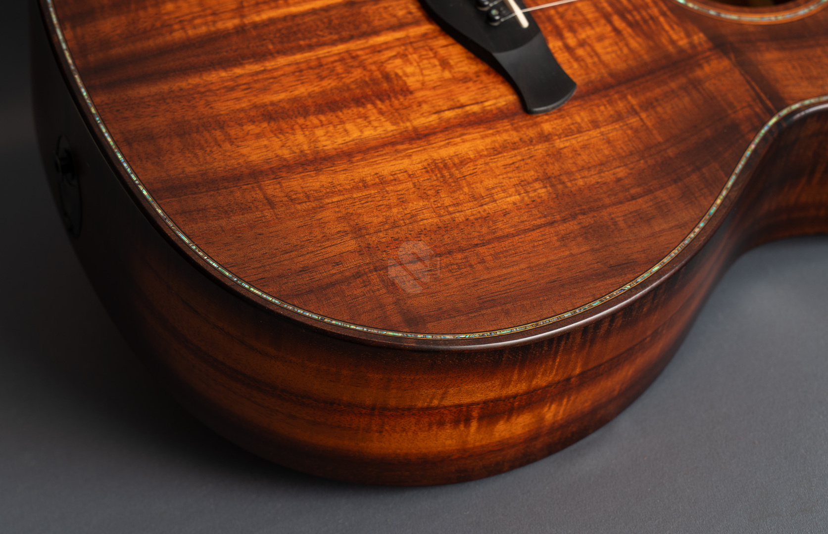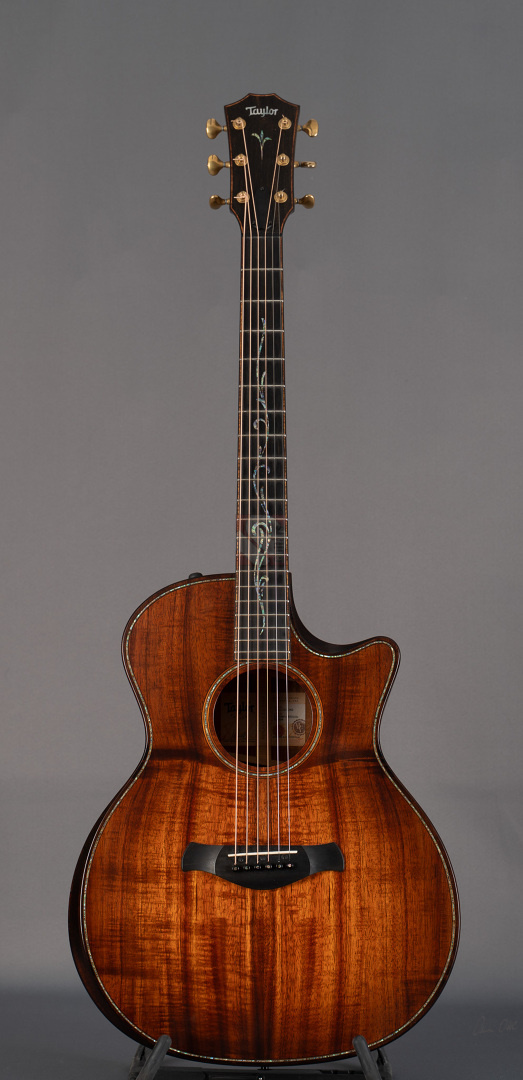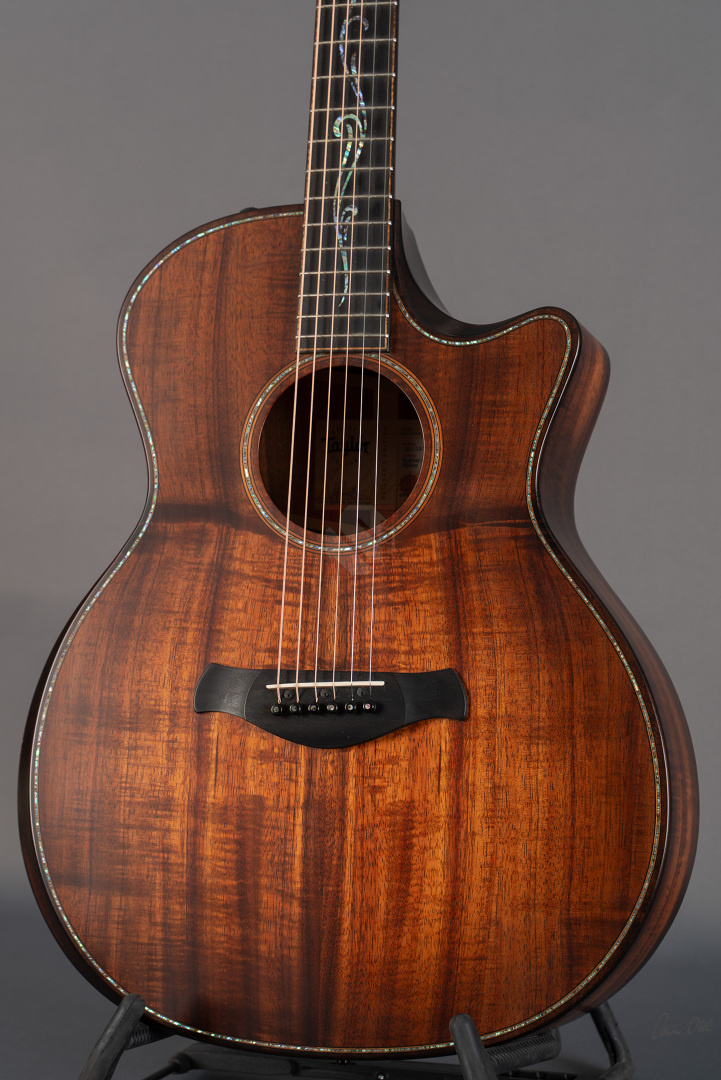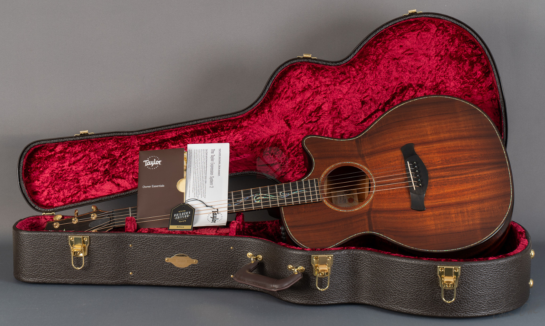 Known for its beautiful grain, Hawaiian koa not only seems tailor-made to attract attention, but also proves to be a versatile, powerful tonewood with smooth bass, warm mids, and fantastic brilliance in the highs. Balanced reproduction of the tonal spectrum with a clear, focused voice! The Taylor K24ce, made entirely from solid koa, is a Grand Auditorium, Taylor's most versatile body shape with patented V-Class bracing under the top. This provides more volume, longer sustain, more pronounced low-end response, improved intonation and a cleaner, clearer sound across the entire fretboard. The visual details of this top-of-the-line model are super exclusive with a wonderfully tactile and visually stunning “Silent Satin” finish that highlights the rich grain of the koa, beautiful spring vine inlays along the dark ebony fingerboard and an elegant koa paua binding. The beautifully satin-finished medium neck is a pleasure to touch and extremely comfortable to play. Of course the slanted ebony armrest serves the same purpose. For stage use the guitar also features Taylor's own ES-2 piezo system with three-band EQ. All in all, this is a superb all-round acoustic guitar with perfect consistency down to the last detail, and apart from a tiny mark on the upper side, it is in mint condition! This could be the acoustic of a lifetime...